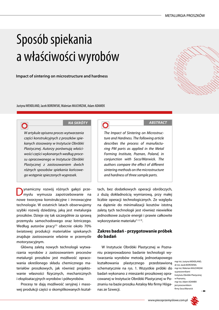 METALURGIA PROSZKÓW Sposób spiekania a właściwości wyrobów Impact of sintering on microstructure and hardness Justyna WENDLAND, Jacek BOROWSKI, Walerian MAJCHRZAK, Adam ADAMEK NA SKRÓTY ABSTRACT W artykule opisano proces wytwarzania części konstrukcyjnych z proszków spiekanych stosowany w Instytucie Obróbki Plastycznej. Autorzy porównują właściwości części wykonanych według procesu opracowanego w Instytucie Obróbki Plastycznej z zastosowaniem dwóch różnych sposobów spiekania końcowego wstępnie spieczonych wyprasek. The Impact of Sintering on Microstructure and Hardness. The following article describes the process of manufacturing PM parts as applied in the Metal Forming Institute, Poznan, Poland, in conjunction with Seco/Warwick. The authors compare the effect of different sintering methods on the microstructure and hardness of three sample parts. ynamiczny rozwój różnych gałęzi przemysłu wymusza zapotrzebowanie na nowe tworzywa konstrukcyjne i innowacyjne technologie. W ostatnich latach obserwujemy szybki rozwój dziedziny, jaką jest metalurgia proszków. Dzieje się tak szczególnie za sprawą przemysłu samochodowego oraz lotniczego. Według autorów pracy(1) obecnie około 70% światowej produkcji materiałów spiekanych znajduje zastosowanie właśnie w przemyśle motoryzacyjnym. Główną zaletą nowych technologii wytwarzania wyrobów z zastosowaniem procesów metalurgii proszków jest możliwość opracowania określonego składu chemicznego materiałów proszkowych, jak również projektowanie własności fizycznych, mechanicznych i eksploatacyjnych wyrobów i półwyrobów. Procesy te dają możliwość seryjnej i masowej produkcji części o skomplikowanych kształ- tach, bez dodatkowych operacji obróbczych, z dużą dokładnością wymiarową, przy małej liczbie operacji technologicznych. Ze względu na dążenie do minimalizacji kosztów istotną zaletą tych technologii jest również niewielkie jednostkowe zużycie energii i prawie całkowite wykorzystanie materiału(1, 2, 3). D Zakres badań - przygotowanie próbek do badań W Instytucie Obróbki Plastycznej w Poznaniu przeprowadzono badanie technologii wytwarzania wyrobów metodą jednoetapowego kształtowania plastycznego przedstawioną schematycznie na rys. 1. Wszystkie próbki do badań wykonano z mieszanki proszkowej opracowanej w Instytucie Obróbki Plastycznej w Poznaniu na bazie proszku Astaloy Mo firmy Höganas ze Szwecji. mgr inż. Justyna WENDLAND, dr inż. Jacek BOROWSKI, mgr inż. Walerian MAJCHRZAK są pracownikami Instytutu Obróbki Plastycznej w Poznaniu, mgr inż. Adam ADAMEK jest pracownikiem firmy Seco/Warwick www.pieceprzemyslowe.com.pl 33 METALURGIA PROSZKÓW PROSZEK METALI PRASOWANIE WSTĘPNE SPIEKANIE WYSOKIE KOŃCOWE OBRÓBKA LUŹNYM ŚCIERNIWEM OBRÓBKA CIEPLNOCHEMICZNA Rys. 2. Przemysłowy piec próżniowy typu VPT firmy Seco/Warwick Metodyka badań GOTOWY ELEMENT Rys. 1. Technologia wytwarzania wyrobów z proszków spiekanych w jednej operacji kształtowania plastycznego Proces wytwarzania części konstrukcyjnych z proszków spiekanych wg tej technologii rozpoczynał się sprasowaniem w matrycy odpowiednio przygotowanej mieszanki proszkowej. Zgodnie z przyjętym procesem technologicznym tak wykonane wypraski były z kolei wstępnie spiekane. Celem tego procesu było wstępne scalenie wyprasek oraz usunięcie środka smarnego z objętości próbki. Tak przygotowane próbki zostały poddane procesowi spiekania końcowego. Celem badań było określenie wpływu sposobu spiekania końcowego na strukturę i własności próbek. Jedną część próbek spiekano tradycyjnym sposobem spiekania w atmosferze endotermicznej z gazu ziemnego w piecu tunelowym. Druga partia próbek została poddana procesowi spiekania w piecu próżniowym typu VPT firmy Seco/Warwick (rys. 2). Tak przygotowane próbki poddawane były tylko wibroobróbce lub obróbce cieplno-chemicznej i wibroobróbce. Obróbka luźnym ścierniwem stosowana jest w celu zaokrąglenia ostrych krawędzi próbek oraz oczyszczania ich z osadów powstałych w trakcie spiekania. Obróbkę cieplno-chemiczną stosuje się w celu zmiany własności warstwy wierzchniej próbek. 34 piece przemysłowe & kotły 2/2011 Do badań wykonano 3 typoszeregi próbek: klin Ø5, klin Ø7 i pierścień krzywkowy (rys. 3). Próbki sprasowano i spieczono wstępnie przy tych samych parametrach. Następnie próbki podzielono na dwie partie. Partię I spiekano w piecu tunelowym w atmosferze endotermicznej. Patrię II spiekano w piecu próżniowym typu VPT o wymiarach przestrzeni roboczej 400 x 400 x 600 mm. Piec tego typu jest najczęściej wykorzystywany do obróbki cieplno-chemicznej (nawęglanie próżniowe), procesów hartowania, odpuszczania, lutowania oraz wyżarzania. Ze względu na swoją uniwersalność można w nim z powodzeniem wykonywać procesy spiekania, dzięki zastosowaniu grafitowej komory grzejnej umożliwiającej nagrzewanie do temperatury 1350oC. Płaskie szerokie elementy grzejne umożliwiają uzyskanie równomiernego rozkładu temperatury podczas nagrzewania, co dodatkowo poprawia wyniki procesu spiekania. Specjalny obwodowy system chłodzenia gazem obojętnym pomaga chłodzić wsad z pełną kontrolą, umożliwiając w ten sposób zmniejszanie i regulację powstających odkształceń obrabianych części. Wraz z wydajnym systemem pompowym oraz nowoczesnym systemem sterowania pieca próżniowego typu VPT cały proces spiekania trwał tylko około 3 godz. 20 min. (rys. 4). METALURGIA PROSZKÓW Wyniki badań a) Próbki typu klin Ø5, klin Ø7 oraz pierścień krzywkowy, wykonane zgodnie z opisaną technologią opracowaną w Instytucie, obserwowano za pomocą mikroskopu świetlnego Nikon Eclipse L150 na przygotowanych zgładach metalograficznych. Wybrane wyniki badań przedstawiono na rys. 5-7. Dla obydwu sposobów spiekania końcowego zaprezentowano zdjęcia wykonane w tych samych obszarach próbek. Próbki poddano tak