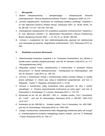 I. Monografie 1. „Broker ubezpieczeniowy – ubezpieczający – ubezpieczyciel. Stosunki zobowiązaniowe”, Oficyna Wydawnicza Branta, Poznań – Bydgoszcz 2005, ss. 217; 2. „Umowa ubezpieczenia. Komentarz do nowelizacji kodeksu cywilnego” (wspólnie z dr. hab. Marcinem Orlickim), Wolters Kluwer, Warszawa 2007, ss. 39-46, 49-64, 7493, 96-108, 113-127, 144-150, 154-158; 3. „Obowiązkowe ubezpieczenie OC posiadaczy pojazdów mechanicznych” (wspólnie z dr. hab. Marcinem Orlickim i dr. Aleksandrem Raczyńskim), Oficyna Wydawnicza Branta, Bydgoszcz-Poznań 2007 – r. III, VIII, IX, ss. 50-96, 198-239; 4. „Umowa o przyłączenie do sieci elektroenergetycznej, gazowej lub ciepłowniczej oraz obowiązek jej zawarcia. Zagadnienia cywilnoprawne”, LEX, Warszawa 2013, ss. 342. II. Rozdziały w pracach zbiorowych 1. „Rekomendacja brokerska” (wspólnie z dr. Tomaszem Kwiecińskim), [w:] „Broker w świetle prawa i praktyki ubezpieczeniowej”, pod red. M. Serwach, Łódź 2012, ss. 117138 [współautorstwo 50%]. 2. „Regulacja prawna umowy ubezpieczenia a orzecznictwo w sprawach klauzul abuzywnych”, w: „Rynek Ubezpieczeniowy – nadregulacja czy niedoregulacja”, pod red. M. Serwach, Łódź 2014, ss. 159-172; 3. „Umowa o wytwarzanie energii z powierzonego paliwa (umowa tollingu) w świetle prawa polskiego” w: „Nowe typy usług w działalności gospodarczej”, pod red. A. Walaszek – Pyzioł i T. Długosza, Warszawa 2014, s. 37-48. 4. „Umowa o świadczenie usług przesyłania paliw gazowych do albo z punktu wirtualnego”, w: „Prawne uwarunkowania konkurencji na rynku gazu”, pod red. B. Popowskiej, E. Kosińskiego i P. Lissonia, Warszawa 2015, s. 170-178 5. Komentarz do art. 49, art. 285-3051 i 352, w: „Kodeks cywilny. Tom I, Komentarz, Art. 1-44911 , pod red. M. Gutowskiego, Warszawa 2016, s. 290-297, 1093-1216, 1215-1217 6. Komentarz do art. 805-820 w: „Kodeks cywilny. Tom II, Komentarz, Art. 450-1088 , pod red. M. Gutowskiego, Warszawa 2016, ss. 1048-1081 7. „Uwagi o konieczności udowodnienia faktu nielegalnego pobierania paliw lub energii” w: „Interdyscyplinarne problemy nielegalnego poboru energii”, pod red. A. Walaszek – Pyzioł, Warszawa 2016, ss. 109-117 Artykuły w czasopismach III. 1. „Wykładnia ogólnych warunków ubezpieczeń autocasco w świetle praktyki sądowej”, Wiadomości Ubezpieczeniowe nr 9-10/2001; 2. „Wypowiedzenie najmu”, Monitor Prawniczy nr 21/2001; 3. „Udzielanie porad prawnych przez brokera ubezpieczeniowego”, Monitor Prawniczy nr 9/2002; 4. „Umowa brokerska jako umowa o czynności pośrednictwa ubezpieczeniowego”, Ruch Prawniczy, Ekonomiczny i Socjologiczny nr 3/2002; 5. „Ujęcie pośrednictwa ubezpieczeniowego w projekcie ustawy o pośrednictwie ubezpieczeniowym”, Przegląd Ustawodawstwa Gospodarczego nr 1/2003; 6. „Stosunki broker ubezpieczeniowy – zakład ubezpieczeń”,Wiadomości Ubezpieczeniowe nr 3-4/2003; 7. „Wstąpienie w stosunek najmu (komentarz do orzeczenia SN z dn. 21.05.2002)”, Monitor Prawniczy 7/ 2003; 8. „Obowiązek lojalności jako element stosunku obligacyjnego”, Monitor Prawniczy 19/2003; 9. „Wypowiedzenie najmu na czas określony. Glosa do wyroku Trybunału Konstytucyjnego z 29.04.2003 r., SK 24/02”, Gazeta Sądowa 11/2003; 10. „Ochrona działaczy związkowych – nowe przepisy, stare problemy” [w:] Prawo pracy w praktyce – dodatek do Monitora Prawniczego 23/2003; 11. „Prywatne życie dłużnika. Glosa do wyroku Sądu Apelacyjnego w Białymstoku z dn. 25.01.2001, I ACa 4/2001”, Gazeta Sądowa 1/2004; 12. „Koszty zastępstwa prawnego w sprawie odwołania od wypowiedzenia umowy o pracę. Glosa do uchwały Sądu Najwyższego z dn. 7.08.2003. r., III PZP 15/02”, Monitor Prawa Pracy 4/2004; 13. „Wokół sporu w sprawie zobowiązań rezultatu i zobowiązań starannego działania”, Przegląd Ustawodawstwa Gospodarczego nr 4/2004; 14. Cykl artykułów o typowych klauzulach umownych: „O zarządzaniu umowami”, „Monitor Prawniczy” 2004/20, ss. 961-962, „Klauzula salwatoryjna”, „Monitor Prawniczy” 2004/22, ss. 1059-1060 „Klauzula zezwalająca na przeniesienie praw i obowiązków z umowy”, „Monitor Prawniczy” 2004/24, ss. 1154-1156, „Klauzula negocjacji pojednawczych”, „Monitor Prawniczy” 2005/2, ss. 124126, „Oświadczenia i zawiadomienia”, „Monitor Prawniczy” 2005/4, ss. 223-224, „Klauzula siły wyższej”, „Monitor Prawniczy” 2005/6, ss. 319-320, „Klauzule wypowiedzenia w umowach na czas oznaczony”, „Monitor Prawniczy” 2005/10, ss. 514-516, 15. „Jeszcze o bancassurance”, „Prawo Bankowe” 2004/12, ss. 69-75; 16. „Multiagent jako specyficzny rodzaj pośrednika ubezpieczeniowego”, „Przegląd Ustawodawstwa Gospodarczego” nr 2005/10, ss. 22-27; 17. „Znaczenie projektu nowelizacji przepisów o umowie ubezpieczenia na cudzy rachunek dla sektora bankowego” (wspólnie z dr. Tomaszem Kwiecińskim), „Prawo Bankowe” nr 2006/3, ss. 78-87 [współautorstwo 50%]; 18. „Uwagi o pojęciu umowy kompleksowej w rozumieniu art. 5 Prawa energetycznego”, „Przegląd Ustawodawstwa Gospodarczego” nr 2006/3, ss. 18-25; 19. „Wyłączenie odpowiedzialności ubezpieczyciela w przypadku umyślnego wyrządzenia szkody przez osobę, za którą ubezpieczający ponosi odpowiedzialność glosa do wyroku SN z 22.04.2004 r. II CK 144/03” (wspólnie z dr. Tomaszem Kwiecińskim), „Glosa” nr 2006/3, ss. 61-69. [współautorstwo 50%]; 20. „Zakres odpowiedzialności ubezpieczyciela i wysokość odszkodowania z tytułu ubezpieczenia OC posiadaczy pojazdów mechanicznych - wybrane zagadnienia”, „Prawo Asekuracyjne” 2006/4, ss. 12-23; 21. „Wzorce umów na tle prawa energetycznego”, „Przegląd Ustawodawstwa Gospodarczego” 2007/11, ss. 13-19; 22. „Obowiązki ubezpieczyciela związane z ustalaniem odszkodowania z tytułu ubezpieczenia OC”, „Przegląd Sądowy” 2007/9, ss. 119-129 [art