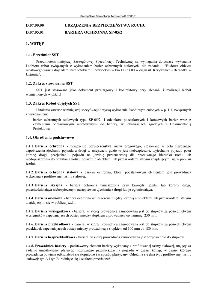 Szczegółowa Specyfikacja Techniczna D.07.05.01 D.07.00.00 URZĄDZENIA BEZPIECZEŃSTWA RUCHU D.07.05.01 BARIERA OCHRONNA SP-05/2 1. WSTĘP 1.1. Przedmiot SST Przedmiotem niniejszej Szczegółowej Specyfikacji Technicznej są wymagania dotyczące wykonania i odbioru robót związanych z wykonaniem barier ochronnych stalowych, dla zadania: "Budowa obiektu mostowego wraz z dojazdami nad potokiem Lipowieckim w km 1+223.00 w ciągu ul. Krzywaniec - Bernadka w Ustroniu". 1.2. Zakres stosowania SST SST jest stosowana jako dokument przetargowy i kontraktowy przy zlecaniu i realizacji Robót wymienionych w pkt.1.1. 1.3. Zakres Robót objętych SST Ustalenia zawarte w niniejszej specyfikacji dotyczą wykonania Robót wymienionych w p. 1.1, związanych z wykonaniem: − barier ochronnych stalowych typu SP-05/2, i odcinków początkowych i końcowych barier wraz z elementami odblaskowymi montowanymi do bariery, w lokalizacjach zgodnych z Dokumentacją Projektową. 1.4. Określenia podstawowe 1.4.1. Bariera ochronna - urządzenie bezpieczeństwa ruchu drogowego, stosowane w celu fizycznego zapobieżenia zjechaniu pojazdu z drogi w miejscach, gdzie to jest niebezpieczne, wyjechaniu pojazdu poza koronę drogi, przejechaniu pojazdu na jezdnię przeznaczoną dla przeciwnego kierunku ruchu lub niedopuszczenia do powstania kolizji pojazdu z obiektami lub przeszkodami stałymi znajdującymi się w pobliżu jezdni. 1.4.2. Bariera ochronna stalowa - bariera ochronna, której podstawowym elementem jest prowadnica wykonana z profilowanej taśmy stalowej. 1.4.3. Bariera skrajna - bariera ochronna umieszczona przy krawędzi jezdni lub korony drogi, przeciwdziałająca niebezpiecznym następstwom zjechania z drogi lub je ograniczająca. 1.4.4. Bariera osłonowa - bariera ochronna umieszczona między jezdnią a obiektami lub przeszkodami stałymi znajdującymi się w pobliżu jezdni. 1.4.5. Bariera wysięgnikowa - bariera, w której prowadnica zamocowana jest do słupków za pośrednictwem wysięgników zapewniających odstęp między słupkiem a prowadnicą co najmniej 250 mm. 1.4.6. Bariera przekładkowa - bariera, w której prowadnica zamocowana jest do słupków za pośrednictwem przekładek zapewniających odstęp między prowadnicą a słupkiem od 100 mm do 180 mm. 1.4.7. Bariera bezprzekładkowa - bariera, w której prowadnica zamocowana jest bezpośrednio do słupków. 1.4.8. Prowadnica bariery - podstawowy element bariery wykonany z profilowanej taśmy stalowej, mający za zadanie umożliwienie płynnego wzdłużnego przemieszczenia pojazdu w czasie kolizji, w czasie którego prowadnica powinna odkształcać się stopniowo i w sposób plastyczny. Odróżnia się dwa typy profilowanej taśmy stalowej: typ A i typ B, różniące się kształtem przetłoczeń. 1 Szczegółowa Specyfikacja Techniczna D.07.05.01 1.4.9. Przekładka - element bariery, wykonany zwykle z rury (okrągłej, prostokątnej) lub kształtownika stalowego (np. z ceownika, dwuteownika) o szerokości od 100 do 140 mm, umieszczony pomiędzy prowadnicą a słupkiem, którego zadaniem jest nadanie barierze korzystniejszych właściwości kolizyjnych (niż w barierze bezprzekładkowej), powodujących, że prowadnica bariery w pierwszej fazie odkształcania lub przemieszczania słupków nie jest odginana do dołu, lecz unoszona ku górze. 1.4.10. Wysięgnik - element bariery, wykonany zwykle z odpowiednio wygiętej blachy stalowej lub z kształtownika stalowego, umieszczony pomiędzy prowadnicą a słupkiem, którego zadaniem jest utrzymanie prowadnicy w określonej odległości od słupka, zwykle około 0,3 do 0,4 m, co zapewnia dużą podatność prowadnicy bariery w pierwszej fazie kolizji oraz dość łagodnie obciąża słupki siłami od nadjeżdżającego pojazdu. 1.4.11. Typy barier - zależne od poprzecznego odkształcenia bariery w czasie kolizji: − typ I: bariera podatna, z odkształceniem dochodzącym od 1,8 do 2,0 m, − typ II: bariera o ograniczonej podatności (wzmocniona), z odkształceniem do 0,85 m, − typ III: bariera niepodatna (sztywna), z odkształceniem równym lub bliskim zeru. 1.4.12. Ogrodzenia ochronne sztywne - przegrody fizyczne separujące ruch pieszy od ruchu kołowego wykonane z kształtowników stalowych. 1.4.13. Kształtowniki - wyroby o stałym przekroju poprzecznym w kształcie złożonej figury geometrycznej, dostarczane w odcinkach prostych, stosowane w konstrukcjach stalowych lub w połączeniu z innymi materiałami budowlanymi. 1.4.14. Pozostałe określenia podstawowe są zgodne z obowiązującymi, odpowiednimi polskimi normami i z definicjami podanymi w SST DM.00.00.00. „Wymagania ogólne” p.1.4. 1.5. Ogólne wymagania dotyczące Robót Ogólne wymagania dotyczące Robót podano w SST DM.00.00.00 „Wymagania ogólne” p.1.5. 2. MATERIAŁY 2.1. Ogólne wymagania dotyczące materiałów Ogólne wymagania dotyczące materiałów, ich pozyskiwania i składowania, podano w SST DM.00.00.00 „Wymagania ogólne” p.2. 2.2. Materiały do wykonania barier ochronnych stalowych Dopuszcza się do stosowania tylko takie konstrukcje drogowych barier ochronnych, na które wydano Aprobatę Techniczną. Elementy do wykonania barier ochronnych stalowych określone są poprzez typ bariery podany w Dokumentacji Projektowej, nawiązujący do ustaleń producenta barier. Do elementów tych należą: − prowadnica, − słupki, − słupki wtykowe, − pas profilowy, − wysięgniki, − nakładka stykowa, − tuleja kotwiąca, − przekładki, wsporniki, śruby, podkładki, światła odblaskowe, − łączniki ukośne, − odblaskowe elementy prowadzące, − obejmy słupka, itp., − wsporniki poręczowe, − poręcze rurowe, − zaślepki poręczy. 2 Szczegółowa Specyfikacja Techniczna D.07.05.01 2.3. Elementy do wykonania barier ochronnych stalowych 2.3.1. Prowadnica Typ prowadnicy z profilowanej taśmy stalowej powinien być zgodny z określonym w Dokumentacji Projektowej, przy czym: − typ A powinien odpowi