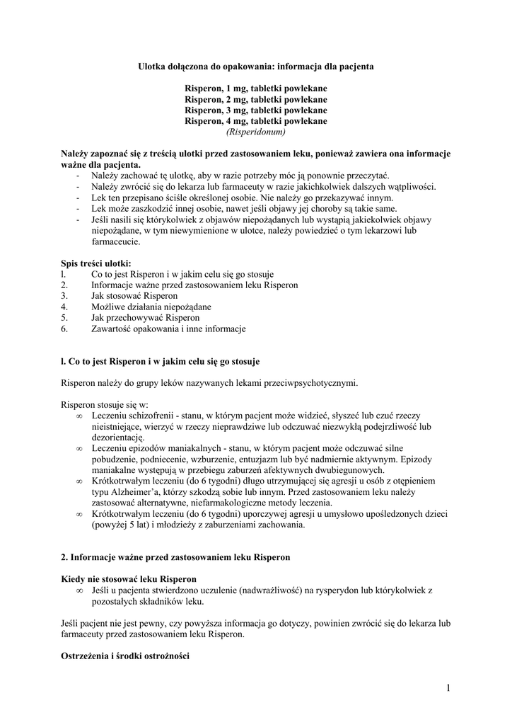 Ulotka dołączona do opakowania: informacja dla pacjenta Risperon, 1 mg, tabletki powlekane Risperon, 2 mg, tabletki powlekane Risperon, 3 mg, tabletki powlekane Risperon, 4 mg, tabletki powlekane (Risperidonum) Należy zapoznać się z treścią ulotki przed zastosowaniem leku, ponieważ zawiera ona informacje ważne dla pacjenta. - Należy zachować tę ulotkę, aby w razie potrzeby móc ją ponownie przeczytać. - Należy zwrócić się do lekarza lub farmaceuty w razie jakichkolwiek dalszych wątpliwości. - Lek ten przepisano ściśle określonej osobie. Nie należy go przekazywać innym. - Lek może zaszkodzić innej osobie, nawet jeśli objawy jej choroby są takie same. - Jeśli nasili się którykolwiek z objawów niepożądanych lub wystąpią jakiekolwiek objawy niepożądane, w tym niewymienione w ulotce, należy powiedzieć o tym lekarzowi lub farmaceucie. Spis treści ulotki: l. Co to jest Risperon i w jakim celu się go stosuje 2. Informacje ważne przed zastosowaniem leku Risperon 3. Jak stosować Risperon 4. Możliwe działania niepożądane 5. Jak przechowywać Risperon 6. Zawartość opakowania i inne informacje l. Co to jest Risperon i w jakim celu się go stosuje Risperon należy do grupy leków nazywanych lekami przeciwpsychotycznymi. Risperon stosuje się w: • Leczeniu schizofrenii - stanu, w którym pacjent może widzieć, słyszeć lub czuć rzeczy nieistniejące, wierzyć w rzeczy nieprawdziwe lub odczuwać niezwykłą podejrzliwość lub dezorientację. • Leczeniu epizodów maniakalnych - stanu, w którym pacjent może odczuwać silne pobudzenie, podniecenie, wzburzenie, entuzjazm lub być nadmiernie aktywnym. Epizody maniakalne występują w przebiegu zaburzeń afektywnych dwubiegunowych. • Krótkotrwałym leczeniu (do 6 tygodni) długo utrzymującej się agresji u osób z otępieniem typu Alzheimer’a, którzy szkodzą sobie lub innym. Przed zastosowaniem leku należy zastosować alternatywne, niefarmakologiczne metody leczenia. • Krótkotrwałym leczeniu (do 6 tygodni) uporczywej agresji u umysłowo upośledzonych dzieci (powyżej 5 lat) i młodzieży z zaburzeniami zachowania. 2. Informacje ważne przed zastosowaniem leku Risperon Kiedy nie stosować leku Risperon • Jeśli u pacjenta stwierdzono uczulenie (nadwrażliwość) na rysperydon lub którykolwiek z pozostałych składników leku. Jeśli pacjent nie jest pewny, czy powyższa informacja go dotyczy, powinien zwrócić się do lekarza lub farmaceuty przed zastosowaniem leku Risperon. Ostrzeżenia i środki ostrożności 1 Przed zastosowaniem leku Risperon, należy zasięgnąć rady lekarza lub farmaceuty: • jeśli u pacjenta występują zaburzenia czynności serca, na przykład niemiarowy rytm pracy serca lub jeśli u pacjenta występuje niskie ciśnienie krwi, lub jeśli pacjent stosuje leki regulujące ciśnienie krwi. Ponieważ lek Risperon może powodować obniżenie ciśnienia krwi, może zajść konieczność dostosowania dawki leku. • jeśli pacjent wie o jakichkolwiek czynnikach, które mogą predysponować do wystąpienia u niego udaru, takich jak wysokie ciśnienie tętnicze krwi, zaburzenia sercowo-naczyniowe lub zaburzenia naczyń mózgowych. • jeśli kiedykolwiek u pacjenta wystąpiły mimowolne rytmiczne ruchy języka, ust lub twarzy. • jeśli kiedykolwiek u pacjenta wystąpił stan objawiający się gorączką, silnym zesztywnieniem mięśni, potami lub obniżeniem poziomu świadomości (zwany również złośliwym zespołem neuroleptycznym). • u pacjentów z chorobą Parkinsona lub otępieniem. • u pacjentów z cukrzycą. • u pacjentów z padaczką. • jeśli pacjent jest mężczyzną i doświadczył przedłużającej się lub bolesnej erekcji. • jeśli u pacjenta występują zaburzenia regulacji temperatury ciała lub pacjent przegrzewa się. • jeśli u pacjenta występują zaburzenia czynności nerek. • jeśli u pacjenta występują zaburzenia czynności wątroby. • jeśli u pacjenta stwierdzono nieprawidłowo duże stężenie hormonu prolaktyny we krwi lub guza, który jest prawdopodobnie zależny od prolaktyny. • jeśli u pacjenta lub członka jego rodziny wystąpiły, również w przeszłości, zakrzepy, ponieważ leki zawierające rysperydon powodują powstawanie zakrzepów. Jeśli pacjent nie jest pewny, czy którykolwiek z opisanych powyżej objawów go dotyczy, powinien, przed zastosowaniem leku Risperon, zwrócić się do lekarza lub farmaceuty. Risperon może powodować zwiększenie masy ciała. Znaczne zwiększenie masy ciała może wpływać niekorzystnie na stan zdrowia. Lekarz prowadzący będzie regularnie kontrolował masę ciała pacjenta. U pacjentów stosujących rysperydon obserwowano wystąpienie cukrzycy lub zaostrzenie objawów wcześniej istniejącej cukrzycy, dlatego lekarz powinien sprawdzić czy u pacjenta nie występuje wysoki poziom glukozy we krwi. U pacjentów z cukrzycą należy regularnie monitorować poziom glukozy we krwi. Pacjenci w podeszłym wieku z otępieniem U pacjentów w podeszłym wieku z otępieniem istnieje zwiększone ryzyko udaru. Pacjenci z otępieniem spowodowanym udarem nie powinni przyjmować rysperydonu. Podczas leczenia lekiem Risperon pacjent powinien często konsultować się z lekarzem. Należy niezwłocznie zwrócić się o pomoc medyczną, jeśli pacjent lub osoba sprawująca opiekę nad pacjentem stwierdzi nagłą zmianę jego stanu psychicznego lub nagłe zwiotczenie, lub odrętwienie mięśni twarzy, ramion lub nóg, szczególnie jednostronne, lub zaburzenia wymowy, nawet występujące przez krótki czas. Objawy te mogą sygnalizować udar. Dzieci i młodzież Zanim rozpocznie się leczenie zaburzeń zachowania, należy wykluczyć inne przyczyny zachowań agresywnych. Jeśli podczas leczenia wystąpi u pacjenta znużenie, zmiana czasu podawania rysperydonu może poprawić koncentrację. Inne leki i Risperon Należy powiedzieć lekarzowi o wszystkich lekach stosowanych aktualnie lub ostatn