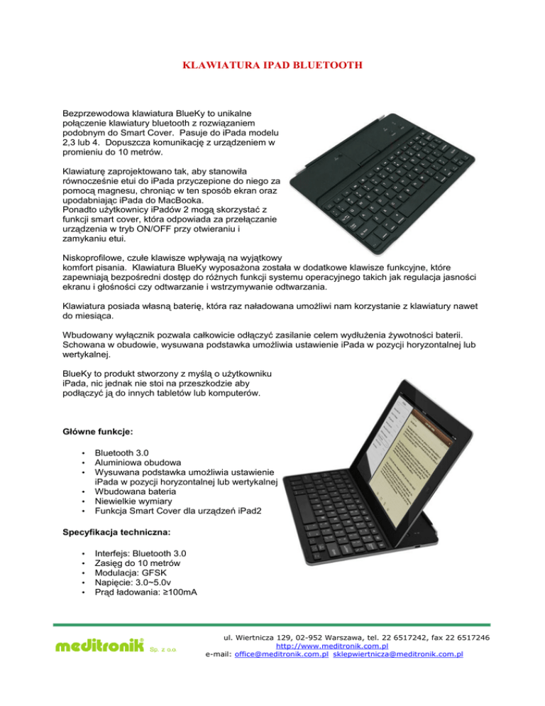 KLAWIATURA IPAD BLUETOOTH Bezprzewodowa klawiatura BlueKy to unikalne połączenie klawiatury bluetooth z rozwiązaniem podobnym do Smart Cover. Pasuje do iPada modelu 2,3 lub 4. Dopuszcza komunikację z urządzeniem w promieniu do 10 metrów. Klawiaturę zaprojektowano tak, aby stanowiła równocześnie etui do iPada przyczepione do niego za pomocą magnesu, chroniąc w ten sposób ekran oraz upodabniając iPada do MacBooka. Ponadto użytkownicy iPadów 2 mogą skorzystać z funkcji smart cover, która odpowiada za przełączanie urządzenia w tryb ON/OFF przy otwieraniu i zamykaniu etui. Niskoprofilowe, czułe klawisze wpływają na wyjątkowy komfort pisania. Klawiatura BlueKy wyposażona została w dodatkowe klawisze funkcyjne, które zapewniają bezpośredni dostęp do różnych funkcji systemu operacyjnego takich jak regulacja jasności ekranu i głośności czy odtwarzanie i wstrzymywanie odtwarzania. Klawiatura posiada własną baterię, która raz naładowana umożliwi nam korzystanie z klawiatury nawet do miesiąca. Wbudowany wyłącznik pozwala całkowicie odłączyć zasilanie celem wydłużenia żywotności baterii. Schowana w obudowie, wysuwana podstawka umożliwia ustawienie iPada w pozycji horyzontalnej lub wertykalnej. BlueKy to produkt stworzony z myślą o użytkowniku iPada, nic jednak nie stoi na przeszkodzie aby podłączyć ją do innych tabletów lub komputerów. Główne funkcje: • • • • • • Bluetooth 3.0 Aluminiowa obudowa Wysuwana podstawka umożliwia ustawienie iPada w pozycji horyzontalnej lub wertykalnej Wbudowana bateria Niewielkie wymiary Funkcja Smart Cover dla urządzeń iPad2 Specyfikacja techniczna: • • • • • Interfejs: Bluetooth 3.0 Zasięg do 10 metrów Modulacja: GFSK Napięcie: 3.0~5.0v Prąd ładowania: ≥100mA ul. Wiertnicza 129, 02-952 Warszawa, tel. 22 6517242, fax 22 6517246 http://www.meditronik.com.pl e-mail: [email protected] [email protected] • • • • • Zużycie energii podczas pracy: <5.0mA Zużycie energii w trybie oczekiwania: 90:uA Zużycie energii w trybie uśpienia: <6uA Czas trybu oczekiwania: około 65dni Wymiary: 7 (W) x 19 (G) x 24 (S) cm • Wymagania minimalne: • • • iPad iPad 2 iPad (3 i 4 generacja) Ponadto klawiatura umożliwia współpracę z systemami: Windows Vista, Windows7, Windows 8 / Android / oraz MAC OS Zawartość opakowania: Klawiatura bezprzewodowa , przewód USB, podręcznik szybkiej instalacji UWAGA: Jeżeli chcesz aby klawiatura obsługiwała polskie znaki, (z użyciem klawisza ALT) - upewnij się że w systemie włączona jest obsługa polskich znaków. W tym celu przejdź do menu Ustawienia > Ogólne > Klawiatura > (Wybierz układ klawiatury sprzętowej) układ klawiatury należy zmienić z Polski na Polski Pro. ul. Wiertnicza 129, 02-952 Warszawa, tel. 22 6517242, fax 22 6517246 http://www.meditronik.com.pl e-mail: [email protected] [email protected]