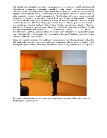 VIII Konferencja doradców zawodowych, pedagogów i psychologów szkół gimnazjalnych „Doradztwo zawodowe a potrzeby ucznia i rynku pracy” została zorganizowana 14.04.2014 w sali konferencyjnej Zespołu Szkół Budowlanych nr 1 w Płocku przy wydatnym wsparciu Urzędu Miasta Płocka. Skierowana była do dyrektorów, doradców zawodowych ale także rodziców uczniów szkół gimnazjalnych. Wśród obecnych gości, zainteresowanych problematyką doradczą w płockich szkołach byli: pan Roman Siemiątkowski - Zastępca Prezydenta Miasta Płocka, pani Aleksandra Jadczak - Kierownik Oddziału Oświaty UM, pan Jarosław Kozłowski- Dyrektor Miejskiego Urzędu Pracy w Płocku, pani Bożena Musiał – przewodnicząca Komisji Edukacji Rady Miasta Płocka, pan Jarosław Zaroń – Dyrektor MSCDN w Warszawie i pan Grzegorz Skwarna – Kierownik Wydziału MSCDN w Płocku oraz pani Magdalena Mocka-Lipińska - Komendant Hufca 7-11 w Płocku i przedstawiciele Centrum Edukacji i Pracy Młodzieży OHP. Pracodawców reprezentowali pan Lech Księżakowski - Wiceprezes Izby Gospodarczej Regionu Płockiego oraz pan Tomasz Nejman – właściciel firmy Tomex. Temat przewodni konferencji przewijał się w wystąpieniach wszystkich prelegentów. Każdy z nich podkreślał ogromne znaczenie doradztwa zawodowego dla uczniów gimnazjów, szkół ponadgimnazjalnych oraz konieczność powiązania działań szkoły z potrzebami rynku pracy. Spotkanie otworzył i przedstawił zaproszonych gości pan Bogusław Sukiennik – dyrektor Zespołu Szkół Budowlanych. Merytoryczną część spotkania rozpoczął pan Roman Siemiątkowski - Zastępca Prezydenta Miasta Płocka, który wypowiedział się nt. „Znaczenia doradztwa zawodowego we współczesnej szkole”. Podkreślił także ogromną rolę nowoczesnego kształcenia zawodowego oraz bazy dydaktycznej wspierającej to kształcenie. Miejsce doradztwa zawodowego w prawie oświatowym przedstawiła pani Aleksandra Jadczak - Kierownik Oddziału Oświaty Urzędu Miasta Płocka. Zwróciła uwagę na elastyczność systemu edukacji, różne możliwość budowania ścieżki kariery, wagę preorientacji zawodowej (w tym odpowiedzialności pedagogów i psychologów, ale też wychowawców) oraz konieczność posiadania zawodu dla dalszego sukcesu życiowego. „Świadomy wybór kierunku kształcenia i zawodu a szanse na rynku pracy” to temat, jaki przedstawił uczestnikom konferencji pan Jarosław Kozłowski – Dyrektor Miejskiego Urzędu Pracy w Płocku. Omówił statystyki dotyczące struktury bezrobocia wśród młodzieży i dorosłych, możliwości znalezienia pracy w zależności od wykształcenia, formy pomocy dla bezrobotnych i formy współpracy i wsparcia szkół w doradztwie zawodowym. Koncepcję doradztwa zawodowego realizowaną w ZSB nr 1 w Płocku przedstawiła pani Małgorzata Strzegowska – doradca zawodowy w tej szkole. W wystąpieniu „Nauczyciel doradcą w planowaniu europejskiej kariery zawodowej” przedstawiła także doświadczenia i plany ZSB nr 1 w kontekście realizacji projektów wymiany doświadczeń dotyczących kształcenia i doradztwa zawodowego. „Możliwości wsparcia nauczycieli przez MSCDN w przygotowaniu do realizacji zadań z zakresu doradztwa zawodowego w szkole” przekazała uczestnikom pani Hanna Drzewiecka – Krawczyk – nauczyciel-konsultant w pracowni psychologiczno-pedagogicznej pomocy szkole w Mazowieckim Samorządowym Centrum Doskonalenia Nauczycieli Wydział w Płocku, doradca zawodowy, pedagog - socjoterapeuta w Zespole Szkół Nr 3 w Płocku. Zwróciła szczególną uwagę na przykłady dobrych praktyk zawodowych, sieci współpracy, wsparcia i samodoskonalenia dla wychowawców oraz nauczycieli - doradców zawodowych. W trakcie dyskusji przedstawiciele pracodawców zauważyli, że aby szkolnictwo zawodowe mogło się rozwijać potrzebne jest zwiększenie roli doradztwa zawodowego już na poziomie szkoły gimnazjalnej oraz podejmowanie wszelkich prób zmiany mentalności co do poziomu kształcenia w szkołach zawodowych, zarówno wśród młodzieży, jak i ich rodziców. Uczestnicy spotkania – doradcy zawodowi podzielili się swoimi problemami i oczekiwaniami związanymi z organizacją swojej pracy, omówili dobre praktyki. Wspólnie ustalono, iż wskazane byłoby kilka razy w roku spotykać się w gronie doradców zawodowych, omawiać bieżące problemy, szczególnie dotyczące współpracy między doradcami na poziomie szkół gimnazjalnych i ponadgimnazjalnych.