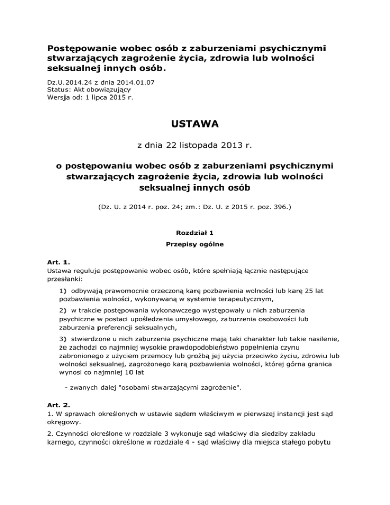 Postępowanie wobec osób z zaburzeniami psychicznymi stwarzających zagrożenie życia, zdrowia lub wolności seksualnej innych osób. Dz.U.2014.24 z dnia 2014.01.07 Status: Akt obowiązujący Wersja od: 1 lipca 2015 r. USTAWA z dnia 22 listopada 2013 r. o postępowaniu wobec osób z zaburzeniami psychicznymi stwarzających zagrożenie życia, zdrowia lub wolności seksualnej innych osób (Dz. U. z 2014 r. poz. 24; zm.: Dz. U. z 2015 r. poz. 396.) Rozdział 1 Przepisy ogólne Art. 1. Ustawa reguluje postępowanie wobec osób, które spełniają łącznie następujące przesłanki: 1) odbywają prawomocnie orzeczoną karę pozbawienia wolności lub karę 25 lat pozbawienia wolności, wykonywaną w systemie terapeutycznym, 2) w trakcie postępowania wykonawczego występowały u nich zaburzenia psychiczne w postaci upośledzenia umysłowego, zaburzenia osobowości lub zaburzenia preferencji seksualnych, 3) stwierdzone u nich zaburzenia psychiczne mają taki charakter lub takie nasilenie, że zachodzi co najmniej wysokie prawdopodobieństwo popełnienia czynu zabronionego z użyciem przemocy lub groźbą jej użycia przeciwko życiu, zdrowiu lub wolności seksualnej, zagrożonego karą pozbawienia wolności, której górna granica wynosi co najmniej 10 lat - zwanych dalej "osobami stwarzającymi zagrożenie". Art. 2. 1. W sprawach określonych w ustawie sądem właściwym w pierwszej instancji jest sąd okręgowy. 2. Czynności określone w rozdziale 3 wykonuje sąd właściwy dla siedziby zakładu karnego, czynności określone w rozdziale 4 - sąd właściwy dla miejsca stałego pobytu osoby stwarzającej zagrożenie, a czynności określone w rozdziałach 5 i 7 - sąd właściwy dla siedziby Krajowego Ośrodka Zapobiegania Zachowaniom Dyssocjalnym. 3. W postępowaniu sądowym stosuje się odpowiednio przepisy ustawy z dnia 17 listopada 1964 r. - Kodeks postępowania cywilnego (Dz. U. Nr 43, poz. 296, z późn. zm.) o postępowaniu nieprocesowym ze zmianami wynikającymi z niniejszej ustawy, z tym że do środków odwoławczych wnoszonych przez osobę, której dotyczy postępowanie uregulowane w niniejszej ustawie, nie ma zastosowania art. 368 ustawy z dnia 17 listopada 1964 r. - Kodeks postępowania cywilnego. 4. Postępowanie określone w rozdziałach 3, 4 i 7 toczy się z udziałem prokuratora. Art. 3. Wobec osoby stwarzającej zagrożenie stosuje się nadzór prewencyjny albo umieszczenie w Krajowym Ośrodku Zapobiegania Zachowaniom Dyssocjalnym. Art. 3a.1 Ustawa ma zastosowanie do osób skazanych za czyn popełniony przed dniem wejścia w życie ustawy z dnia 20 lutego 2015 r. o zmianie ustawy - Kodeks karny oraz niektórych innych ustaw (Dz. U. poz. 396). Rozdział 2 Krajowy Ośrodek Zapobiegania Zachowaniom Dyssocjalnym Art. 4. 1. Tworzy się Krajowy Ośrodek Zapobiegania Zachowaniom Dyssocjalnym, zwany dalej "Ośrodkiem". 2. Minister właściwy do spraw zdrowia jest dla Ośrodka podmiotem tworzącym w rozumieniu art. 2 ust. 1 pkt 6 ustawy z dnia 15 kwietnia 2011 r. o działalności leczniczej (Dz. U. z 2013 r. poz. 217). 3. Zadaniem Ośrodka jest prowadzenie postępowania terapeutycznego wobec osób stwarzających zagrożenie umieszczonych w Ośrodku. Art. 5. 1. Ośrodek jest jednostką budżetową podległą ministrowi właściwemu do spraw zdrowia. 2. Ośrodek jest podmiotem leczniczym, niebędącym przedsiębiorcą w rozumieniu ustawy z dnia 15 kwietnia 2011 r. o działalności leczniczej. 3. Kierownika Ośrodka powołuje i odwołuje minister właściwy do spraw zdrowia. Art. 6. 1. W Ośrodku powołuje się służbę ochrony, której zadania są realizowane przez pracowników wpisanych na listę kwalifikowanych pracowników ochrony fizycznej, o której mowa w art. 26 ust. 1 ustawy z dnia 22 sierpnia 1997 r. o ochronie osób i mienia (Dz. U. z 2005 r. Nr 145, poz. 1221, z późn. zm.). 2. Do zadań służby ochrony należy ochrona osób przebywających w Ośrodku, ochrona mienia, zapewnienie bezpieczeństwa i porządku na terenie Ośrodka, a także zapewnienie, aby osoby stwarzające zagrożenie w nim umieszczone nie opuściły go i nie oddaliły się samowolnie. Art. 7. 1. Teren Ośrodka i znajdujące się na nim pomieszczenia są wyposażone w urządzenia monitorujące, umożliwiające stały nadzór nad osobami stwarzającymi zagrożenie umieszczonymi w Ośrodku oraz kontrolę stosowania przymusu bezpośredniego. 2. Monitorowany obraz lub dźwięk jest utrwalany. 3. Obraz z monitoringu pomieszczeń lub ich części przeznaczonych do celów sanitarnohigienicznych jest przekazywany w sposób uniemożliwiający ukazywanie intymnych części ciała ludzkiego oraz intymnych czynności fizjologicznych. 4. Zapis utrwalonego obrazu i dźwięku podlega ochronie określonej w przepisach o ochronie danych osobowych. Dostęp do urządzeń monitorujących oraz do zapisu utrwalonego za ich pomocą mają wyłącznie osoby upoważnione przez kierownika Ośrodka. 5. Zapis z monitoringu przechowuje się przez 6 miesięcy. Po upływie terminu przechowywania zapis usuwa się w sposób uniemożliwiający jego odzyskanie. Z usunięcia zapisu sporządza się protokół, w którym należy wskazać datę tej czynności oraz imię i nazwisko osoby, która dokonała usunięcia. Art. 8. Minister właściwy do spraw zdrowia w porozumieniu z Ministrem Sprawiedliwości określi, w drodze rozporządzenia: 1) liczbę łóżek w Ośrodku przeznaczonych dla osób stwarzających zagrożenie umieszczonych w Ośrodku, 2) wymagania ogólnoprzestrzenne, sanitarne i instalacyjne, jakie muszą spełniać pomieszczenia i urządzenia Ośrodka stosownie do rodzaju wykonywanej działalności leczniczej oraz zakresu udzielanych świadczeń zdrowotnych, 3) warunki zabezpieczenia Ośrodka, 4) rodzaj i liczebność personelu mającego styczność z osobami stwarzającymi zagrożenie umieszczonymi w Ośrodku, 5) rodzaje urządzeń i środków technicznych służących do przekazywania, odtwarzania i utrwalania obrazu lub dźw