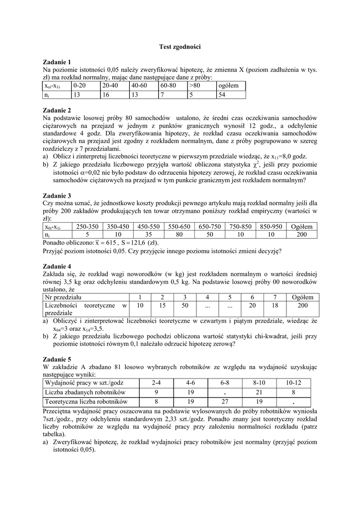 Test zgodności Zadanie 1 Na poziomie istotności 0,05 należy zweryfikować hipotezę, że zmienna X (poziom zadłużenia w tys. zł) ma rozkład normalny, mając dane następujące dane z próby: xoi-x1i 0-20 20-40 40-60 60-80 >80 ogółem ni 13 16 13 7 5 54 Zadanie 2 Na podstawie losowej próby 80 samochodów ustalono, że średni czas oczekiwania samochodów ciężarowych na przejazd w jednym z punktów granicznych wynosił 12 godz., a odchylenie standardowe 4 godz. Dla zweryfikowania hipotezy, że rozkład czasu oczekiwania samochodów ciężarowych na przejazd jest zgodny z rozkładem normalnym, dane z próby pogrupowano w szereg rozdzielczy z 7 przedziałami. a) Oblicz i zinterpretuj liczebności teoretyczne w pierwszym przedziale wiedząc, że x11=8,0 godz. b) Z jakiego przedziału liczbowego przyjęła wartość obliczona statystyka χ2, jeśli przy poziomie istotności α=0,02 nie było podstaw do odrzucenia hipotezy zerowej, że rozkład czasu oczekiwania samochodów ciężarowych na przejazd w tym punkcie granicznym jest rozkładem normalnym? Zadanie 3 Czy można uznać, że jednostkowe koszty produkcji pewnego artykułu mają rozkład normalny jeśli dla próby 200 zakładów produkujących ten towar otrzymano poniższy rozkład empiryczny (wartości w zł): x0i-x1i 250-350 350-450 450-550 550-650 650-750 750-850 850-950 Ogółem ni 5 10 35 80 50 10 10 200 Ponadto obliczono: x = 615 , S = 121,6 (zł). Przyjąć poziom istotności 0,05. Czy przyjęcie innego poziomu istotności zmieni decyzję? Zadanie 4 Zakłada się, że rozkład wagi noworodków (w kg) jest rozkładem normalnym o wartości średniej równej 3,5 kg oraz odchyleniu standardowym 0,5 kg. Na podstawie losowej próby 00 noworodków ustalono, że Nr przedziału 1 2 3 4 5 6 7 Ogółem Liczebności teoretyczne w 10 15 50 ... ... 20 18 200 przedziale a) Obliczyć i zinterpretować liczebności teoretyczne w czwartym i piątym przedziale, wiedząc że x04=3 oraz x14=3,5. b) Z jakiego przedziału liczbowego pochodzi obliczona wartość statystyki chi-kwadrat, jeśli przy poziomie istotności równym 0,1 należało odrzucić hipotezę zerową? Zadanie 5 W zakładzie A zbadano 81 losowo wybranych robotników ze względu na wydajność uzyskując następujące wyniki: Wydajność pracy w szt./godz 2-4 4-6 6-8 8-10 10-12 Liczba zbadanych robotników 9 19 21 8 . Teoretyczna liczba robotników 8 19 27 19 . Przeciętna wydajność pracy oszacowana na podstawie wylosowanych do próby robotników wyniosła 7szt./godz., przy odchyleniu standardowym 2,33 szt./godz. Ponadto znany jest teoretyczny rozkład liczby robotników ze względu na wydajność pracy przy założeniu normalności rozkładu (patrz tabelka). a) Zweryfikować hipotezę, że rozkład wydajności pracy robotników jest normalny (przyjąć poziom istotności 0,05). b) Jakie jest prawdopodobieństwo, że wydajność pracy robotników w zakładzie A przekroczy 6 szt./godz? Zadanie 6 W celu zweryfikowania hipotezy o zgodności rozkładu rocznych wydatków na prasę rodzin 3osobowych z rozkładem normalnym zebrano informacje o wydatkach 500 losowo wybranych rodzin. Dane pogrupowano w 6 odpowiednio licznych przedziałów klasowych. Dla pięciu pierwszych obliczono: 5 (n i − n̂ i ) 2 = 7,5 , wykorzystując : x = 610 , S = 90 z próby. W szóstym przedziale o wydatkach n̂ i i =1 750 zł i więcej znalazło się 20 rodzin. a) Uzupełniając brakujące dane, zweryfikuj hipotezę o zgodności rozkładu empirycznego rocznych wydatków na prasę z rozkładem normalnym. Przyjąć poziom istotności 0,05. b) Dla jakiego poziomu istotności decyzja weryfikacyjna ulegnie zmianie? ∑ Dodatkowe zadania do rozwiązania w domu: Zbiór zadań: 4.3.23, 4.3.24, 9.1.14, 9.1.15