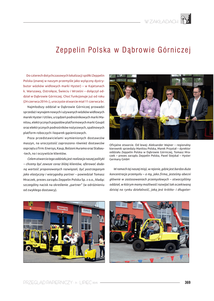 W ZAKŁADACH Zeppelin Polska w Dąbrowie Gór niczej Do czterech dotychczasowych lokalizacji spółki Zeppelin Polska (znanej w naszym przemyśle jako wyłączny dystrybutor wózków widłowych marki Hyster) – w Kajetanach k. Warszawy, Ostrołęce, Świeciu i Wrześni – dołączył oddział w Dąbrowie Górniczej. Choć funkcjonuje już od roku (24 czerwca 2014 r.), uroczyste otwarcie miał 11 czerwca br. Najmłodszy oddział w Dąbrowie Górniczej prowadzi sprzedaż i wynajem nowych i używanych wózków widłowych marek Hyster i Utilev, urządzeń podnośnikowych marki Manitou, elektrycznych pojazdów platformowych marki Goupil oraz elektrycznych podnośników nożycowych, spalinowych platform roboczych i koparek gąsienicowych. Poza przedstawicielami wymienionych dostawców maszyn, na uroczystość zaproszono również dostawców osprzętu z firm: Enersys, Kaup, Bolzoni Auramo oraz Stabau-tech, no i oczywiście klientów. Celem otwarcia tego oddziału jest realizacja naszej polityki Oficjalne otwarcie. Od lewej: Aleksander Wajner – regionalny kierownik sprzedaży Manitou Polska, Marek Przystał – dyrektor oddziału Zeppelin Polska w Dąbrowie Górniczej, Tomasz Mraczek – prezes zarządu Zeppelin Polska, Pavel Stejskal – Hyster Germany GmbH – chcemy być zawsze coraz bliżej klientów, oferować dodaną wartość proponowanych rozwiązań, być postrzeganym W ramach tej naszej misji, w rejonie, gdzie jest bardzo duża jako elastyczny i wiarygodny partner – powiedział Tomasz koncentracja przemysłu – a my, jako firma, jesteśmy obecni Mraczek, prezes zarządu Zeppelin Polska Sp. z o.o., kładąc głównie w zastosowaniach przemysłowych – otworzyliśmy szczególny nacisk na określenie „partner” (w odróżnieniu oddział, w którym mamy możliwość rozwijać tak oczekiwaną od zwykłego dostawcy). dzisiaj na rynku działalność, jaką jest krótko- i długoter- PRZEGLĄD PAPIERNICZY · 71 · LIPIEC 2015 369