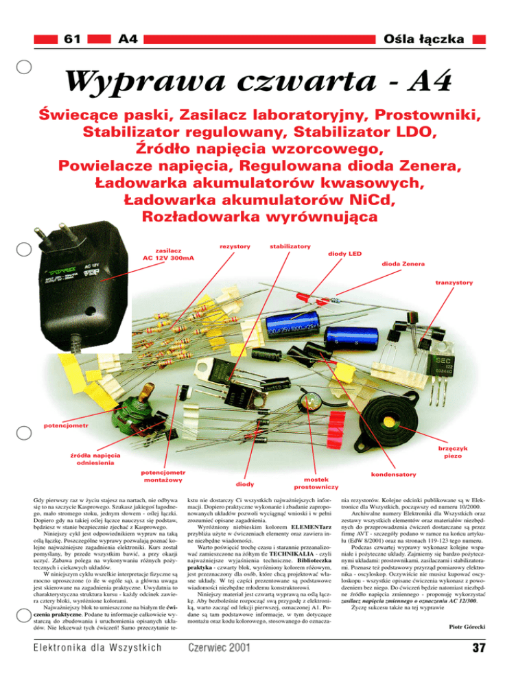 61 A4 O ś la łą c z k a Wyprawa czwarta − A4 Ś w ie c ą c e p a s k i, Z a s ila c z la b o r a t o r y jn y , P r o s t o w n ik i, S t a b iliz a t o r r e g u lo w a n y , S t a b iliz a t o r L D O , Ź r ó d ło n a p ię c ia w z o r c o w e g o , P o w ie la c z e n a p ię c ia , R e g u lo w a n a d io d a Z e n e r a , Ł a d o w a r k a a k u m u la t o r ó w k w a s o w y c h , Ł a d o w a r k a a k u m u la t o r ó w N iC d , R o z ła d o w a r k a w y r ó w n u ją c a zasilacz AC 12 V 3 0 0 mA rezystory stabilizatory diody LE D dioda Zenera tranzystory potencjometr brzęczyk piezo ź ródła napięcia odniesienia potencjometr montaż owy Gdy pierwszy raz w życiu stajesz na nartach, nie odbywa się to na szczycie K asproweg o. S zuk asz jak ieg oś łag odne− g o, m ało strom eg o stok u, jednym słowem − oś lej łą czk i. D opiero g dy na tak iej oś lej łą czce nauczysz się podstaw, bę dziesz w stanie bezpiecznie zjechać z K asproweg o. N iniejszy cyk l jest odpowiednik iem wypraw na tak ą oś lą łą czk ę . P oszczeg ó lne wyprawy pozwalają poznać k o− lejne najważniejsze zag adnienia elek tronik i. K urs został pom yś lany, by przede wszystk im bawić , a przy ok azji uczyć . Z abawa poleg a na wyk onywaniu ró żnych poży− tecznych i ciek awych uk ładó w. W niniejszym cyk lu wszelk ie interpretacje fizyczne są m ocno uproszczone (o ile w og ó le są ), a g łó wna uwag a jest sk ierowane na zag adnienia prak tyczne. U wydatnia to charak terystyczna struk tura k ursu − k ażdy odcinek zawie− ra cztery blok i, wyró żnione k oloram i. N ajważniejszy blok to um ieszczone na białym tle ćwi− c z e n ia p r a k ty c z n e . P odane tu inform acje całk owicie wy− starczą do zbudowania i uruchom ienia opisanych uk ła− dó w. N ie lek ceważ tych ć wiczeń ! S am o przeczytanie te− Elektronika dla Wszystkich diody mostek prostowniczy k stu nie dostarczy C i wszystk ich najważniejszych infor− m acji. D opiero prak tyczne wyk onanie i zbadanie zapropo− nowanych uk ładó w pozwoli wycią g ną ć wniosk i i w pełni zrozum ieć opisane zag adnienia. W yró żniony niebiesk im k olorem E L E M E N T a r z przybliża użyte w ć wiczeniach elem enty oraz zawiera in− ne niezbę dne wiadom oś ci. W arto poś wię cić trochę czasu i starannie przeanalizo− wać zam ieszczone na żó łtym tle T E C H N I K A L I A − czyli najważniejsze wyjaś nienia techniczne. B ib lio te c z k a p r a k ty k a − czwarty blok , wyró żniony k olorem ró żowym , jest przeznaczony dla osó b, k tó re chcą projek tować wła− sne uk łady. W tej czę ś ci prezentowane są podstawowe wiadom oś ci niezbę dne m łodem u k onstruk torowi. N iniejszy m ateriał jest czwartą wyprawą na oś lą łą cz− k ę . A by bezboleś nie rozpoczą ć swą przyg odę z elek troni− k ą , warto zaczą ć od lek cji pierwszej, oznaczonej A 1 . P o− dane są tam podstawowe inform acje, w tym dotyczą ce m ontażu oraz k odu k oloroweg o, stosowaneg o do oznacza− kondensatory nia rezystoró w. K olejne odcink i publik owane są w E lek − tronice dla W szystk ich, począ wszy od num eru 1 0 /2 0 0 0 . A rchiwalne num ery E lek tronik i dla W szystk ich oraz zestawy wszystk ich elem entó w oraz m ateriałó w niezbę d− nych do przeprowadzenia ć wiczeń dostarczane są przez firm ę A V T − szczeg ó ły podano w ram ce na k oń cu artyk u− łu (E dW 8 /2 0 0 1 ) oraz na stronach 1 1 9 −1 2 3 teg o num eru. P odczas czwartej wyprawy wyk onasz k olejne wspa− niałe i pożyteczne uk łady. Z ajm iem y się bardzo pożytecz− nym i uk ładam i: prostownik am i, zasilaczam i i stabilizatora− m i. P oznasz też podstawowy przyrzą d pom iarowy elek tro− nik a − oscylosk op. O czywiś cie nie m usisz k upować oscy− losk opu − wszystk ie opisane ć wiczenia wyk onasz z powo− dzeniem bez nieg o. D o ć wiczeń bę dzie natom iast niezbę d− ne ź ró dło napię cia zm ienneg o − proponuję wyk orzystać zasilacz napięcia zmiennego o oznaczeniu AC 12/300. Ż yczę suk cesu tak że na tej wyprawie P io tr G ó r e c k i 37 A4 T E C H N I K A L I A ELEMENTarz ELEMENTarz ELEMENTarz ELEMENTarz ELEMENTarz ELEMENTarz ELEMENTarz Ośla łączka Prąd zmienny Ogólnie biorąc, prąd zmienny to taki, który do− wolnie zmienia w czasie swą wartość i kieru− nek. Zmiany mogą być różne. R ysu nek 1 po− kazuje kilka przebiegów zmiennych. Jeśli war− tości prądu (i napięcia) są na przemian dodat− nie i ujemne, a ich średnia wartość wynosi ze− ro, mamy do czynienia z prą d em przem ien− nym . R ysu nek 2 pokazuje trzy przebiegi prze− mienne (prostokątny, trójkątny i impulsowy). Prąd elektryczny przepływający przez ciało człowieka nie jest obojętny dla zdrowia. Czym większe napięcie, tym większy prąd i większy wpływ na organizm. Napięcia nie przekraczające 24V uznaje się za bezwzględnie bezpieczne. Napięcia rzędu 60V i więcej uznawane są za niebezpieczne. Napięcie w domowym gnia− zdku sieci energetycznej wynosi 220...230V − jest to więc napięcie groźne dla życia! Ć wiczenie 1 Rys. 1 Rys. 2 62 Przeprowadzanie prób z układami dołączonymi wprost do sieci grozi śmiercią! Aby zapobiec nieszczęściu, należy zasilać budowane układy z f abrycznego, atestowa− nego zasilacza, który co prawda jest dołą− czany do sieci, ale zastosowane rozwiązania zapewniają galwaniczną izolację od sieci i pełne bezpieczeń stwo. Prąd zmienny i przemienny. Świecące paski. Uwaga! Tym razem musisz użyć zasilacza prądu zmiennego. Nie nadaje się tu zasilacz będący odpowiednikiem baterii, którego używaliśmy podczas poprzednich wypraw. Wszystkie ćwiczenia tej wyprawy były przygotowane i sprawdzone z wtyczkowym zasilaczem prądu zmiennego o oznaczeniu AC 12/300 (12V 300mA). Ten zasilacz zaw iera jedynie trans− formator sieciowy. W zasadzie można byłob