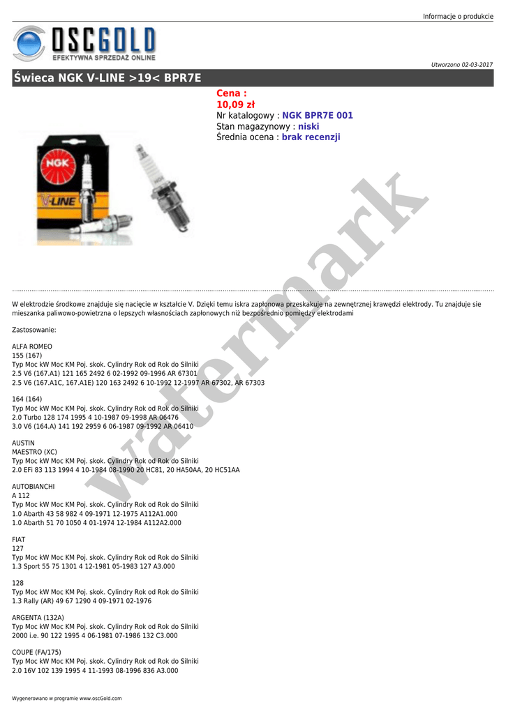 Informacje o produkcie Utworzono 02-03-2017 Świeca NGK V-LINE >19< BPR7E Cena : 10,09 zł er m ar k Nr katalogowy : NGK BPR7E 001 Stan magazynowy : niski Średnia ocena : brak recenzji W elektrodzie środkowe znajduje się nacięcie w kształcie V. Dzięki temu iskra zapłonowa przeskakuje na zewnętrznej krawędzi elektrody. Tu znajduje sie mieszanka paliwowo-powietrzna o lepszych własnościach zapłonowych niż bezpośrednio pomiędzy elektrodami Zastosowanie: ALFA ROMEO 155 (167) Typ Moc kW Moc KM Poj. skok. Cylindry Rok od Rok do Silniki 2.5 V6 (167.A1) 121 165 2492 6 02-1992 09-1996 AR 67301 2.5 V6 (167.A1C, 167.A1E) 120 163 2492 6 10-1992 12-1997 AR 67302, AR 67303 at 164 (164) Typ Moc kW Moc KM Poj. skok. Cylindry Rok od Rok do Silniki 2.0 Turbo 128 174 1995 4 10-1987 09-1998 AR 06476 3.0 V6 (164.A) 141 192 2959 6 06-1987 09-1992 AR 06410 w AUSTIN MAESTRO (XC) Typ Moc kW Moc KM Poj. skok. Cylindry Rok od Rok do Silniki 2.0 EFi 83 113 1994 4 10-1984 08-1990 20 HC81, 20 HA50AA, 20 HC51AA AUTOBIANCHI A 112 Typ Moc kW Moc KM Poj. skok. Cylindry Rok od Rok do Silniki 1.0 Abarth 43 58 982 4 09-1971 12-1975 A112A1.000 1.0 Abarth 51 70 1050 4 01-1974 12-1984 A112A2.000 FIAT 127 Typ Moc kW Moc KM Poj. skok. Cylindry Rok od Rok do Silniki 1.3 Sport 55 75 1301 4 12-1981 05-1983 127 A3.000 128 Typ Moc kW Moc KM Poj. skok. Cylindry Rok od Rok do Silniki 1.3 Rally (AR) 49 67 1290 4 09-1971 02-1976 ARGENTA (132A) Typ Moc kW Moc KM Poj. skok. Cylindry Rok od Rok do Silniki 2000 i.e. 90 122 1995 4 06-1981 07-1986 132 C3.000 COUPE (FA/175) Typ Moc kW Moc KM Poj. skok. Cylindry Rok od Rok do Silniki 2.0 16V 102 139 1995 4 11-1993 08-1996 836 A3.000 Wygenerowano w programie www.oscGold.com CROMA (154) Typ Moc kW Moc KM Poj. skok. Cylindry Rok od Rok do Silniki 1600 61 83 1585 4 12-1985 12-1990 154 A.048 2000 16V 101 137 1995 4 08-1992 08-1996 154 E1.000 2000 CHT 74 100 1995 4 01-1991 09-1992 2000 i.e. (154.AD) 88 120 1995 4 03-1987 09-1992 834 B.000, 154 C3.000 2000 i.e. (154.AM) 83 113 1995 4 03-1986 09-1990 834 B.048 2000 i.e. (154.AM, 154.LM) 85 116 1995 4 10-1987 08-1996 154 C3.046, 834 B.146 2500 V6 119 162 2492 6 06-1993 08-1996 834 G.000 FIORINO (147) Typ Moc kW Moc KM Poj. skok. Cylindry Rok od Rok do Silniki 1.5 55 75 1499 4 01-1988 08-1993 149 C1.000 FIORINO nadwozie pełne (146 Uno) Typ Moc kW Moc KM Poj. skok. Cylindry Rok od Rok do Silniki 75 i.e. 1.6 55 75 1581 4 10-1993 05-2001 146 C6.000, 146 D6.000 er m ar k REGATA (138) Typ Moc kW Moc KM Poj. skok. Cylindry Rok od Rok do Silniki 75 1.5 55 75 1498 4 12-1983 12-1987 138 C3.048, 138 B3.048 75 i.e. 1.5 55 75 1498 4 07-1985 07-1989 138 C2.048, 149 C1.000 85 1.5 58 79 1498 4 05-1985 12-1987 149 A5.000 85 1.6 60 82 1585 4 10-1983 06-1990 149 A.000 85 Super 1.5 60 82 1498 4 09-1983 04-1985 138 B3.000 REGATA Weekend Typ Moc kW Moc KM Poj. skok. Cylindry Rok od Rok do Silniki 100 1.6 (RF) 74 101 1585 4 09-1984 12-1986 149 A4.000 75 1.5 55 75 1498 4 09-1984 07-1989 138 C3.048, 138 B3.048 75 1.5 i.e. CAT 55 75 1498 4 12-1986 07-1989 138 C2.048 85 1.5 60 82 1498 4 01-1984 04-1989 138 B3.000 RITMO Bertone kabriolet Typ Moc kW Moc KM Poj. skok. Cylindry Rok od Rok do Silniki 85 1.5 60 82 1498 4 03-1983 12-1986 138 B3.000 85 1.5 63 86 1498 4 01-1980 07-1989 138 A4.000 RITMO I (138A) Typ Moc kW Moc KM Poj. skok. Cylindry Rok od Rok do Silniki 125 TC Abarth 2.0 92 125 1995 4 11-1981 09-1982 138 AR1.000 75 i.e. 1.5 55 75 1498 4 10-1985 05-1987 138 C2.048, 149 C1.000 85 1.5 63 85 1498 4 01-1981 09-1982 138 A4.000 w at RITMO II (138A) Typ Moc kW Moc KM Poj. skok. Cylindry Rok od Rok do Silniki 125 TC Abarth 2.0 92 125 1995 4 12-1982 12-1987 138 AR1.000 130 TC Abarth 2.0 96 130 1995 4 04-1983 12-1987 138 AR2.000 75 1.5 55 75 1498 4 09-1985 12-1988 138 A2.000 85 1.5 58 79 1498 4 08-1985 05-1987 149 A5.000 85 1.5 60 82 1498 4 01-1983 12-1987 138 B3.000 TEMPRA (159) Typ Moc kW Moc KM Poj. skok. Cylindry Rok od Rok do Silniki 1.6 63 86 1581 4 03-1990 04-1993 159 A3.000 1.6 i.e. (159.AE) 57 78 1581 4 06-1990 07-1992 159 A3.046 1.6 i.e. (159.AS, 159.AT) 55 75 1581 4 06-1992 08-1996 159 A3.048, 835 C1.000 1.8 i.e. (159.AN) 77 105 1756 4 03-1992 08-1996 159 A4.046 1.8 i.e. (159.AN) 81 110 1756 4 03-1990 08-1996 2.0 i.e. (159.AP) 83 113 1995 4 10-1990 08-1996 159 A6.046 TEMPRA S.W. (159) Typ Moc kW Moc KM Poj. skok. Cylindry Rok od Rok do Silniki 1.6 63 86 1581 4 12-1990 04-1993 159 A3.000 1.6 i.e. (159.AE) 57 78 1581 4 10-1990 08-1996 159 A3.046, 835 C1.000 1.6 i.e. (159.AJ) 66 90 1581 4 06-1994 08-1996 159 B9.000 1.6 i.e. (159.AS, 159.AT) 55 75 1581 4 10-1992 08-1996 159 A3.048, 835 C1.000 1.8 i.e. (159.AN) 77 105 1756 4 03-1992 12-1993 159 A4.046 1.8 i.e. (159.AN) 81 110 1756 4 03-1990 08-1996 1.8 i.e. (159.AV) 76 103 1756 4 09-1993 08-1996 835 C2.000 1.8 i.e. (159.AZ) 66 90 1756 4 09-1993 08-1996 835 C4.000 1.8 i.e. (159.BY) 74 101 1756 4 10-1994 08-1996 836 A5.000 2.0 i.e. (159.AP) 83 113 1995 4 01-1991 03-1995 159 A6.046 2.0 i.e. 4x4 (159.AP) 83 113 1995 4 03-1992 03-1995 159 A6.046 Informacje o produkcie TIPO (160) Typ Moc kW Moc KM Poj. skok. Cylindry Rok od Rok do Silniki 1.6 (160.AE) 61 83 1581 4 01-1988 10-1991 160 A2.000 1.6 i.e. 66 90 1595 4 02-1988 05-1991 149 C2.046 1.8 i.e. 66 90 1756 4 09-1993 04-1995 835 C4.000 1.8 i.e. 81 110 1756 4 10-1990 06-1993 159 A4.000 1.8 i.e. (160.AM) 74 101 1756 4 10-1994 04-1995 159 A4.000 1.8 i.e. (160.AY) 77 105 1756 4 10-1990 06-1993 159 A4.046 1.8 i.e. (160.ED) 76 103 1756 4 04-1993 04-1995 835 C2.000 2.0 16V (160.AV) 107 146 1995 4 07-1991 04-1995 160 A8.046 2.0 i.e. (160.AT, 160.AJ) 83 113 1995 4 03-1990 04-1995 159 A6.046 2.0 i.e. 16V Sport (160.EF) 102 139 1995 4 03-1993 04-1995 836 A3.000 ULYSSE (220) Typ Moc kW Moc KM Poj. skok. Cylindry Rok od Rok do Silniki 2.0 16V 97 132 1998 4 05-1998 09-2000 RFV er m ar k X 1/9 (128 AS) Typ Moc kW Moc KM Poj. skok. Cylindry Rok od Rok do Silniki 1.5 Five Speed 63 85 1499 4 11-1978 12-1989 138 AS.000 FORD CAPRI III (GECP) Typ Moc kW Moc KM Poj. skok. Cylindry Rok od R