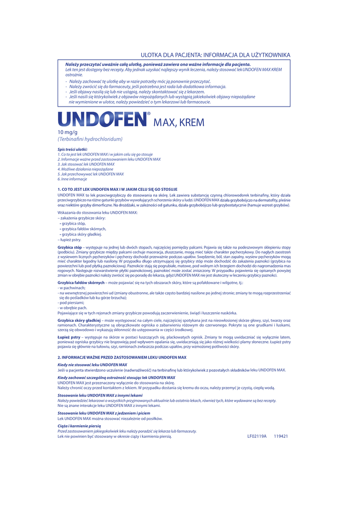 ULOTKA DLA PACJENTA: INFORMACJA DLA UŻYTKOWNIKA Należy przeczytać uważnie całą ulotkę, ponieważ zawiera ona ważne informacje dla pacjenta. Lek ten jest dostępny bez recepty. Aby jednak uzyskać najlepszy wynik leczenia, należy stosować lek UNDOFEN MAX KREM ostrożnie. - Należy zachować tę ulotkę aby w razie potrzeby móc ją ponownie przeczytać. - Należy zwrócić się do farmaceuty, jeśli potrzebna jest rada lub dodatkowa informacja. - Jeśli objawy nasilą się lub nie ustąpią, należy skontaktować się z lekarzem. - Jeśli nasili się którykolwiek z objawów niepożądanych lub wystąpią jakiekolwiek objawy niepożądane nie wymienione w ulotce, należy powiedzieć o tym lekarzowi lub farmaceucie. MAX, KREM 10 mg/g Spis treści ulotki: 1. Co to jest lek UNDOFEN MAX i w jakim celu się go stosuje 2. Informacje ważne przed zastosowaniem leku UNDOFEN MAX 3. Jak stosować lek UNDOFEN MAX 4. Możliwe działania niepożądane 5. Jak przechowywać lek UNDOFEN MAX 6. Inne informacje 1. CO TO JEST LEK UNDOFEN MAX I W JAKIM CELU SIĘ GO STOSUJE UNDOFEN MAX przeciwgrzybiczo na różne gatunki grzybów wywołujących schorzenia skóry u ludzi. UNDOFEN MAX Wskazania do stosowania leku UNDOFEN MAX: – zakażenia grzybicze skóry: tgrzybica stóp, tgrzybica fałdów skórnych, tgrzybica skóry gładkiej. – łupież pstry. Grzybica stóp – występuje na jednej lub dwóch stopach, najczęściej pomiędzy palcami. Pojawia się także na podeszwowym sklepieniu stopy (podbiciu). Zmiany grzybicze między palcami cechuje maceracja, złuszczanie, mogą mieć także charakter pęcherzykowy. Do nagłych zaostrzeń z wysiewem licznych pęcherzyków i pęcherzy dochodzi przeważnie podczas upałów. Swędzenie, ból, stan zapalny, wysiew pęcherzyków mogą mieć charakter łagodny lub nasilony. W przypadku długo utrzymującej się grzybicy stóp może dochodzić do zakażenia paznokci (grzybica na powierzchni lub pod płytką paznokciową). Paznokcie stają się pogrubiałe, matowe, pod wolnym ich brzegiem dochodzi do nagromadzenia mas rogowych. Następuje rozwarstwienie płytki paznokciowej, paznokieć może zostać zniszczony. W przypadku pojawienia się opisanych powyżej zmian w obrębie paznokci należy zwrócić się po poradę do lekarza, gdyż UNDOFEN MAX nie jest skuteczny w leczeniu grzybicy paznokci. Grzybica fałdów skórnych – może pojawiać się na tych obszarach skóry, które są pofałdowane i wilgotne, tj.: - w pachwinach; - na wewnętrznej powierzchni ud (zmiany obustronne, ale także często bardziej nasilone po jednej stronie; zmiany te mogą rozprzestrzeniać się do pośladków lub ku górze brzucha); - pod piersiami; - w obrębie pach. Pojawiające się w tych rejonach zmiany grzybicze powodują zaczerwienienie, świąd i łuszczenie naskórka. Grzybica skóry gładkiej – może występować na całym ciele, najczęściej spotykana jest na nieowłosionej skórze głowy, szyi, twarzy oraz ramionach. Charakterystyczne są obrączkowate ogniska o zabarwieniu różowym do czerwonego. Pokryte są one grudkami i łuskami, szerzą się obwodowo i wykazują skłonność do ustępowania w części środkowej. Łupież pstry – występuje na skórze w postaci łuszczących się, plackowatych ognisk. Zmiany te mogą uwidaczniać się wyłącznie latem, ponieważ ogniska grzybicy nie brązowieją pod wpływem opalania się, uwidaczniają się jako różnej wielkości plamy słoneczne. Łupież pstry pojawia się głównie na tułowiu, szyi, ramionach zwłaszcza podczas upałów, przy wzmożonej potliwości skóry. 2. INFORMACJE WAŻNE PRZED ZASTOSOWANIEM LEKU UNDOFEN MAX Kiedy nie stosować leku UNDOFEN MAX leku UNDOFEN MAX. Kiedy zachować szczególną ostrożność stosując lek UNDOFEN MAX UNDOFEN MAX jest przeznaczony wyłącznie do stosowania na skórę. Należy chronić oczy przed kontaktem z lekiem. W przypadku dostania się kremu do oczu, należy przemyć je czystą, ciepłą wodą. Stosowanie leku UNDOFEN MAX z innymi lekami Należy powiedzieć lekarzowi o wszystkich przyjmowanych aktualnie lub ostatnio lekach, również tych, które wydawane są bez recepty. Nie są znane interakcje leku UNDOFEN MAX z innymi lekami. Stosowanie leku UNDOFEN MAX z jedzeniem i piciem Lek UNDOFEN MAX można stosować niezależnie od posiłków. Ciąża i karmienie piersią Przed zastosowaniem jakiegokolwiek leku należy poradzić się lekarza lub farmaceuty. Lek nie powinien być stosowany w okresie ciąży i karmienia piersią. LF02119A 119421 Prowadzenie pojazdów i obsługiwanie maszyn Brak badań. Ważne informacje o niektórych składnikach leku UNDOFEN MAX Lek UNDOFEN MAX zawiera alkohol cetostearylowy i z tego względu może powodować miejscową reakcję skórną (np. kontaktowe zapalenie skóry). 3. JAK STOSOWAĆ LEK UNDOFEN MAX Lek do stosowania na skórę. O ile lekarz nie zaleci inaczej, lek stosuje się jak opisano poniżej. W przypadku wątpliwości należy ponownie skontaktować się z lekarzem lub farmaceutą. Dorośli Lek UNDOFEN MAX w postaci kremu można stosować raz lub dwa razy na dobę. Przed nałożeniem kremu UNDOFEN MAX należy dokładnie oczyścić i osuszyć powierzchnię skóry, na którą będzie on nanoszony. Następnie należy nanieść cienką warstwę kremu na chorobowo zmienione miejsca na skórze i wokół nich, i lekko wcierać. Jeżeli zmiany chorobowe znajdują się w fałdach skórnych (pod piersią, między palcami, między pośladkami, w pachwinach), można nałożyć dodatkowo opatrunek z gazy, zwłaszcza na noc. Czas leczenia Grzybica stóp, fałdów skórnych, skóry gładkiej - 7 dni. Łupież pstry - 14 dni. Poprawę objawów klinicznych z reguły uzyskuje się już po kilku dniach. Stosowanie nieregularne lub przedwczesne przerwanie leczenia grozi nawrotem choroby. Jeśli po 14 dniach od rozpoczęcia leczenia nie stwierdza się poprawy, należy zwrócić się po poradę do lekarza. Dzieci Nie należy stosować leku u dzieci, 