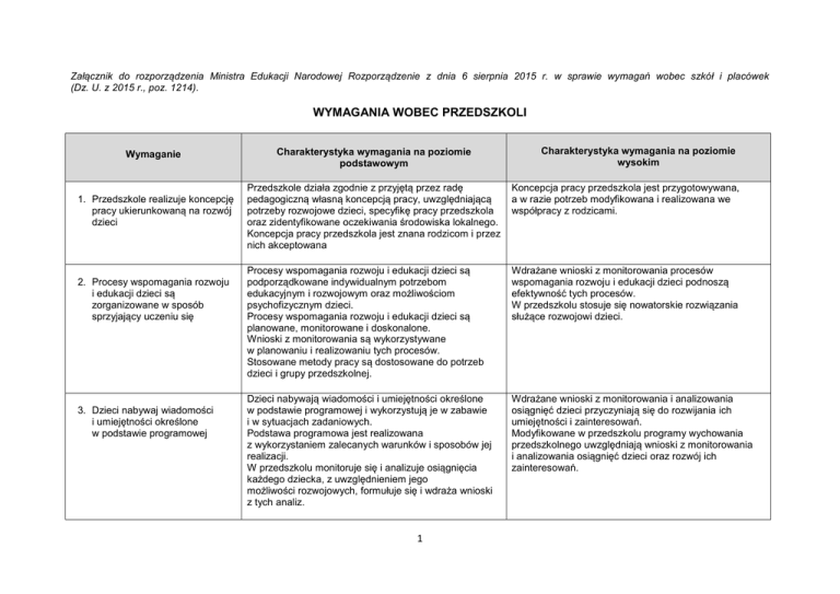 Załącznik do rozporządzenia Ministra Edukacji Narodowej Rozporządzenie z dnia 6 sierpnia 2015 r. w sprawie wymagań wobec szkół i placówek (Dz. U. z 2015 r., poz. 1214). WYMAGANIA WOBEC PRZEDSZKOLI Wymaganie 1. Przedszkole realizuje koncepcję pracy ukierunkowaną na rozwój dzieci 2. Procesy wspomagania rozwoju i edukacji dzieci są zorganizowane w sposób sprzyjający uczeniu się 3. Dzieci nabywaj wiadomości i umiejętności określone w podstawie programowej Charakterystyka wymagania na poziomie podstawowym Charakterystyka wymagania na poziomie wysokim Przedszkole działa zgodnie z przyjętą przez radę pedagogiczną własną koncepcją pracy, uwzględniającą potrzeby rozwojowe dzieci, specyfikę pracy przedszkola oraz zidentyfikowane oczekiwania środowiska lokalnego. Koncepcja pracy przedszkola jest znana rodzicom i przez nich akceptowana Koncepcja pracy przedszkola jest przygotowywana, a w razie potrzeb modyfikowana i realizowana we współpracy z rodzicami. Procesy wspomagania rozwoju i edukacji dzieci są podporządkowane indywidualnym potrzebom edukacyjnym i rozwojowym oraz możliwościom psychofizycznym dzieci. Procesy wspomagania rozwoju i edukacji dzieci są planowane, monitorowane i doskonalone. Wnioski z monitorowania są wykorzystywane w planowaniu i realizowaniu tych procesów. Stosowane metody pracy są dostosowane do potrzeb dzieci i grupy przedszkolnej. Wdrażane wnioski z monitorowania procesów wspomagania rozwoju i edukacji dzieci podnoszą efektywność tych procesów. W przedszkolu stosuje się nowatorskie rozwiązania służące rozwojowi dzieci. Dzieci nabywają wiadomości i umiejętności określone w podstawie programowej i wykorzystują je w zabawie i w sytuacjach zadaniowych. Podstawa programowa jest realizowana z wykorzystaniem zalecanych warunków i sposobów jej realizacji. W przedszkolu monitoruje się i analizuje osiągnięcia każdego dziecka, z uwzględnieniem jego możliwości rozwojowych, formułuje się i wdraża wnioski z tych analiz. Wdrażane wnioski z monitorowania i analizowania osiągnięć dzieci przyczyniają się do rozwijania ich umiejętności i zainteresowań. Modyfikowane w przedszkolu programy wychowania przedszkolnego uwzględniają wnioski z monitorowania i analizowania osiągnięć dzieci oraz rozwój ich zainteresowań. 1 4. Dzieci są aktywne 5. Kształtowane są postawy i respektowane normy społeczne 6. Przedszkole wspomaga rozwój dzieci, z uwzględnieniem ich indywidualnej sytuacji 7. Nauczyciele współpracują w planowaniu i realizowaniu procesów edukacyjnych Nauczyciele stwarzają sytuacje, które zachęcają dzieci do podejmowania różnorodnych aktywności. Dzieci są zaangażowane w zajęcia prowadzone w przedszkolu i chętnie w nich uczestniczą. Dzieci są wdrażane do samodzielności. Dzieci inicjują i realizują działania na rzecz własnego rozwoju. Dzieci uczestniczą w działaniach na rzecz społeczności lokalnej. Dzieci w przedszkolu czują się bezpiecznie, a relacje między wszystkimi członkami społeczności przedszkolnej są oparte na wzajemnym szacunku i zaufaniu. Dzieci wiedzą, jakich zachowań się od nich oczekuje. Podejmuje się działania wychowawcze i profilaktyczne mające na celu eliminowanie zagrożeń oraz wzmacnianie właściwych zachowań. W przedszkolu kształtuje się postawę odpowiedzialności dzieci za działania własne i działania podejmowane w grupie. Podejmowane działania wychowawcze i profilaktyczne są monitorowane oraz, w razie potrzeb, modyfikowane. W przedszkolu są realizowane działania antydyskryminacyjne obejmujące całą społeczność przedszkola. W przedszkolu, wspólnie z rodzicami, analizuje się podejmowane działania wychowawcze i profilaktyczne, w tym mające na celu eliminowanie zagrożeń oraz wzmacnianie właściwych zachowań. Ocenia się ich skuteczność oraz, w razie potrzeb, modyfikuje. Dzieci wykazują się odpowiedzialnością w działaniu i relacjach społecznych. W przedszkolu rozpoznaje się możliwości psychofizyczne i potrzeby rozwojowe oraz sytuację społeczną każdego dziecka. Informacje z przeprowadzonego rozpoznania są wykorzystywane w działaniach edukacyjnych. Zajęcia rewalidacyjne dla dzieci niepełnosprawnych oraz zajęcia specjalistyczne są odpowiednie do rozpoznanych potrzeb każdego dziecka. W opinii rodziców wsparcie otrzymywane w przedszkolu odpowiada potrzebom ich dzieci. Nauczyciele pracują zespołowo. Wspólnie planują przebieg procesów edukacyjnych, współpracują przy ich realizacji i analizują efekty swojej pracy. Nauczyciele pomagają sobie nawzajem i wspólnie rozwiązują problemy. Nauczyciele pomagają sobie nawzajem w ewaluacji i doskonaleniu własnej pracy. 2 8. Promowana jest wartość wychowania przedszkolnego 9. Rodzice są partnerami przedszkola 10. Wykorzystywane są zasoby przedszkola i środowiska lokalnego na rzecz wzajemnego rozwoju 11. Przedszkole w planowaniu pracy uwzględnia wnioski z analizy badań zewnętrznych i wewnętrznych 12. Zarządzanie przedszkolem służy jego rozwojowi Przedszkole prezentuje i upowszechnia informacje o ofercie zajęć prowadzonych w przedszkolu oraz podejmowanych działaniach. Przedszkole informuje środowisko lokalne o celowości i skuteczności podejmowanych działań. Przedszkole promuje w środowisku lokalnym wartość wychowania przedszkolnego. Przedszkole jest pozytywnie postrzegane w środowisku lokalnym. Przedszkole pozyskuje i wykorzystuje opinie rodziców na temat swojej pracy. W przedszkolu współpracuje się z rodzicami na rzecz rozwoju ich dzieci. Rodzice współdecydują w sprawach przedszkola i uczestniczą w podejmowanych działaniach W przedszkolu są realizowane inicjatywy rodziców na rzecz rozwoju dzieci i przedszkola. W przedszkolu rozpoznaje się potrzeby i zasoby własne oraz środowiska lokalnego i na tej podstawie podejmuje inicjatywy na rzecz ich wzajemnego rozwoju. Przedszkole w sposób systematyczny i celowy, z uwzględnieniem s