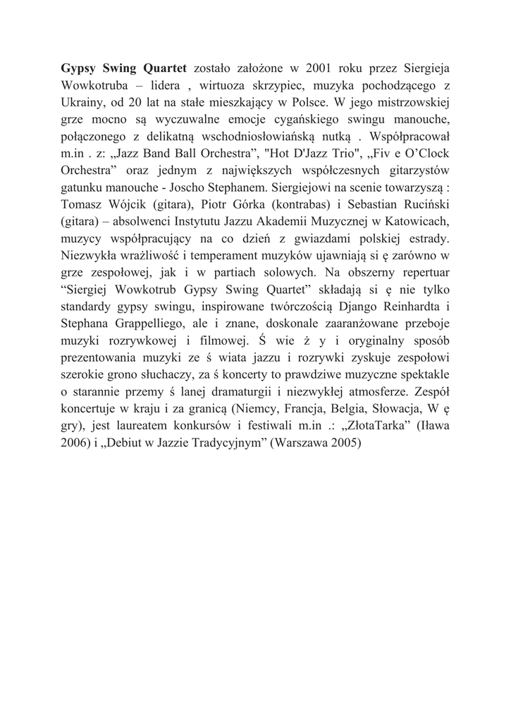 Gypsy Swing Quartet zostało założone w 2001 roku przez Siergieja Wowkotruba – lidera , wirtuoza skrzypiec, muzyka pochodzącego z Ukrainy, od 20 lat na stałe mieszkający w Polsce. W jego mistrzowskiej grze mocno są wyczuwalne emocje cygańskiego swingu manouche, połączonego z delikatną wschodniosłowiańską nutką . Współpracował m.in . z: „Jazz Band Ball Orchestra”, "Hot D'Jazz Trio", „Fiv e O’Clock Orchestra” oraz jednym z największych współczesnych gitarzystów gatunku manouche - Joscho Stephanem. Siergiejowi na scenie towarzyszą : Tomasz Wójcik (gitara), Piotr Górka (kontrabas) i Sebastian Ruciński (gitara) – absolwenci Instytutu Jazzu Akademii Muzycznej w Katowicach, muzycy współpracujący na co dzień z gwiazdami polskiej estrady. Niezwykła wrażliwość i temperament muzyków ujawniają si ę zarówno w grze zespołowej, jak i w partiach solowych. Na obszerny repertuar “Siergiej Wowkotrub Gypsy Swing Quartet” składają si ę nie tylko standardy gypsy swingu, inspirowane twórczością Django Reinhardta i Stephana Grappelliego, ale i znane, doskonale zaaranżowane przeboje muzyki rozrywkowej i filmowej. Ś wie ż y i oryginalny sposób prezentowania muzyki ze ś wiata jazzu i rozrywki zyskuje zespołowi szerokie grono słuchaczy, za ś koncerty to prawdziwe muzyczne spektakle o starannie przemy ś lanej dramaturgii i niezwykłej atmosferze. Zespół koncertuje w kraju i za granicą (Niemcy, Francja, Belgia, Słowacja, W ę gry), jest laureatem konkursów i festiwali m.in .: „ZłotaTarka” (Iława 2006) i „Debiut w Jazzie Tradycyjnym” (Warszawa 2005)