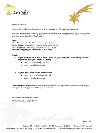 Szanowni Państwo, Cieszymy się, że zdecydowali się Państwo wybrać restaurację Le Cedre na imprezę świąteczną. Poniższa oferta zawiera propozycję kilku zestawów zawierających przekąski zimne, ciepłe, dania główne, deser oraz napoje alkoholowe i bezalkoholowe Menu Menu Noel-69 zł od osoby (Menu w dalszej części oferty) Zestaw Le Cedre- 85 zł od osoby (Menu w dalszej części oferty) Menu Wigilijne- 88 zł od osoby (Menu w dalszej części oferty) Libańskie desery (Baklawa, Ousmallieh) -14 zł od osoby Napoje: a. Napoje bezalkoholowe -Coca cola ,Fanta , Sprite, asortyment soków owocowych ,woda gazowana i niegazowana oraz kawa i herbata po Libańsku . • Opcja 1 – 28zł/od osoby Open bar 4h • Opcja 2 – według konsumpcji b. Alkohole :piwo , wina Włoskie białe i czerwone • Opcja 1 – 39 zł/od osoby Open bar 4h • Opcja 2 – według konsumpcji Orientalna oprawa przyjęcia: taniec brzucha (pokazy / nauka tańca), fajki wodne, malowanie henną, muzyka arabska (na żywo / DJ) i więcej. Pełna oferta na stronie 5 Do rachunku doliczamy 10% serwisu. Wymienione ceny są cenami brutto. Strona 1 z 5 Le Cedre 84 | Al. Solidarności 84 | 01-003 Warszawa | 22 61 88 999 | [email protected] Le Cedre 61 | Al. Solidarności 61 | 22 670 11 66 | [email protected] | www.lecedre.pl | facebook.com/lecedrepl MENU NOËL ZAKĄSKI ZIMNE Śledź wigilijny w trzech smakach (po kaszubsku, w śmietanie, w sosie musztardowym) Hommous: puree z cieciorki libańskiej w sosie sezamowym Tabbouleh: sałatka narodowa z natki pietruszki Loubieh Bil Zeit: zielona fasola, z pomidorami i cebulą Shanklish: domowy ser libański na ostro Tajine: pasta z ryby w sosie sezamowym Labneh: libański ser kremowy z dodatkiem czosnku Plasterki łososia na rukoli z pomidorkami cherry ZAKĄSKI GORĄCE Falafel: smażone kulki wegetariańskie Fatayer: ciasto francuskie nadziewane szpinakiem Pierogi z kapustą i grzybami DANIE GŁÓWNE Karp panierowany Shish Taouk serwowany z warzywami grillowanymi Kofta Halabieh 69 zł od osoby/per person Strona 2 z 5 Le Cedre 84 | Al. Solidarności 84 | 01-003 Warszawa | 22 61 88 999 | [email protected] Le Cedre 61 | Al. Solidarności 61 | 22 670 11 66 | [email protected] | www.lecedre.pl | facebook.com/lecedrepl Menu Le Cedre ZAKĄSKI ZIMNE Tabbouleh - Sałatka Narodowa z natki pietruszki Babaghanouj - Grillowany, siekany bakłażan z warzywami Hommous - Pure z cieciorki libańskiej z sosem sezamowym Warak Inab - Liście winogronowe nadziewane ryżem i ziołami Labneh – libański ser kremowy Moutabbal – Pasta z pieczonych bakłażanów z sosem sezamowym Kofta Nayeh - Libański tatar z natką i cebulą polany oliwą Basterma - Plasterki przyprawionej wędzonej wołowiny Taouk – Duszone kawałki kurczaka z warzywami Tajine - Pasta z łososia w sosie sezamowym Mdaradara - Ryż i soczewica z prażoną cebulą Shanklish - Domowy ser libański na ostro ZAKĄSKI GORĄCE Krayedis - Krewetki z grilla Halloumi - Kawałki sera „Halloumi” z grilla Hommous Lahme – Hommous ze smażonym mięsem Arayes - Mięso mielone w chlebie libańskim z rusztu Falafel – smażone kulki wegetariańskie DANIA GŁÓWNE Lahem Mechwi - Szaszłyki wołowe Shish Taouk - Szaszłyki z kawałków kurczaka Kofta Halabijeh - Szaszłyki z mielonego mięsa z grilla Ryż orientalny Cena: 85zł od osoby Strona 3 z 5 Le Cedre 84 | Al. Solidarności 84 | 01-003 Warszawa | 22 61 88 999 | [email protected] Le Cedre 61 | Al. Solidarności 61 | 22 670 11 66 | [email protected] | www.lecedre.pl | facebook.com/lecedrepl MENU WIGILIJNE Zupa: Barszcz czerwony z uszkami Zakąski zimne: Śledź po kaszubsku Śledź w sosie musztardowym Karp w galarecie Moutabbal – pasta z pieczonych bakłażanów z sosem sezamowym Tabbouleh – sałatka z natki pietruszki Sałatka arabska- sałatka ze świeżych warzyw z cebulą Półmisek wędlin Sałatka z tuńczyka Hommous – pure z cieciorki z sosem sezamowym Koktajl warzywny w occie Zakąski gorące: Pierogi z kapustą i grzybami Pieczarki z patelni Lahem Bel’ajin- mini kwadraciki nadziewane mięsem, sos pomidorowy Sambousik Jebneh – pierogi nadziewane serem Danie główne: Filet z pstrąga panierowany Łosoś grillowany serwowany z grillowanymi warzywami Shish taouk (szaszłyk z kawałków kurczaka) serwowany z ryżem 88 zł od osoby/per person Strona 4 z 5 Le Cedre 84 | Al. Solidarności 84 | 01-003 Warszawa | 22 61 88 999 | [email protected] Le Cedre 61 | Al. Solidarności 61 | 22 670 11 66 | [email protected] | www.lecedre.pl | facebook.com/lecedrepl ORIENTALNA OPRAWA PRZYJĘCIA CENNIK (2 x 10min) 350zł DJ (4h) 800zł Muzyka arabska na żywo (3h) 500zł Fajka wodna (2h) 40zł/1szt Malowanie henną (3h) 350zł Pokaz tańca brzucha Wróżka (minimum 2h) 150zł/1h Strona 5 z 5 Le Cedre 84 | Al. Solidarności 84 | 01-003 Warszawa | 22 61 88 999 | [email protected] Le Cedre 61 | Al. Solidarności 61 | 22 670 11 66 | [email protected] | www.lecedre.pl | facebook.com/lecedrepl