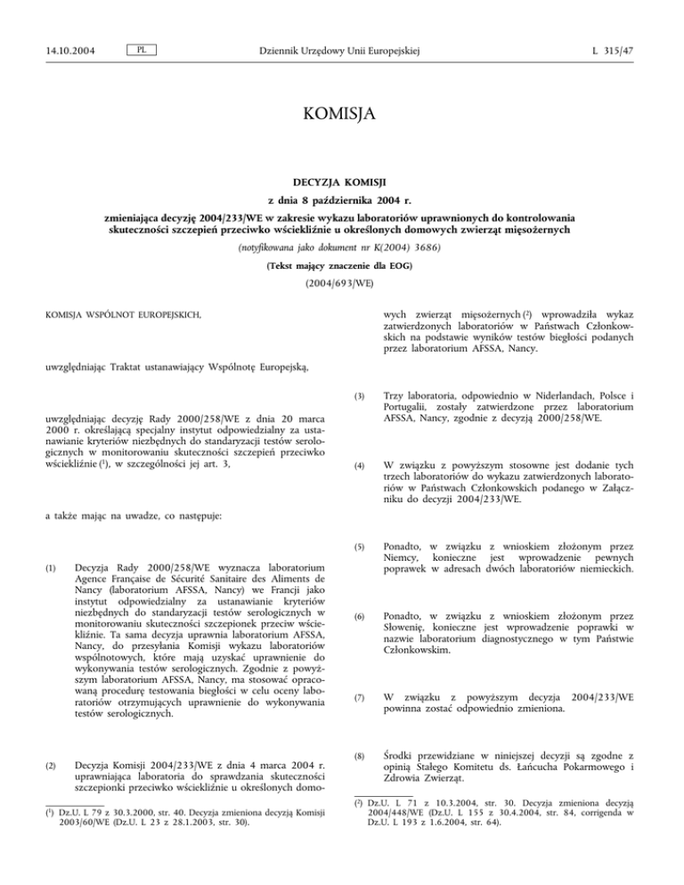 14.10.2004 PL Dziennik Urzędowy Unii Europejskiej L 315/47 KOMISJA DECYZJA KOMISJI z dnia 8 października 2004 r. zmieniająca decyzję 2004/233/WE w zakresie wykazu laboratoriów uprawnionych do kontrolowania skuteczności szczepień przeciwko wściekliźnie u określonych domowych zwierząt mięsożernych (notyfikowana jako dokument nr K(2004) 3686) (Tekst mający znaczenie dla EOG) (2004/693/WE) wych zwierząt mięsożernych (2) wprowadziła wykaz zatwierdzonych laboratoriów w Państwach Członkowskich na podstawie wyników testów biegłości podanych przez laboratorium AFSSA, Nancy. KOMISJA WSPÓLNOT EUROPEJSKICH, uwzględniając Traktat ustanawiający Wspólnotę Europejską, uwzględniając decyzję Rady 2000/258/WE z dnia 20 marca 2000 r. określającą specjalny instytut odpowiedzialny za ustanawianie kryteriów niezbędnych do standaryzacji testów serologicznych w monitorowaniu skuteczności szczepień przeciwko wściekliźnie (1), w szczególności jej art. 3, (3) Trzy laboratoria, odpowiednio w Niderlandach, Polsce i Portugalii, zostały zatwierdzone przez laboratorium AFSSA, Nancy, zgodnie z decyzją 2000/258/WE. (4) W związku z powyższym stosowne jest dodanie tych trzech laboratoriów do wykazu zatwierdzonych laboratoriów w Państwach Członkowskich podanego w Załączniku do decyzji 2004/233/WE. (5) Ponadto, w związku z wnioskiem złożonym przez Niemcy, konieczne jest wprowadzenie pewnych poprawek w adresach dwóch laboratoriów niemieckich. (6) Ponadto, w związku z wnioskiem złożonym przez Słowenię, konieczne jest wprowadzenie poprawki w nazwie laboratorium diagnostycznego w tym Państwie Członkowskim. (7) W związku z powyższym decyzja 2004/233/WE powinna zostać odpowiednio zmieniona. (8) Środki przewidziane w niniejszej decyzji są zgodne z opinią Stałego Komitetu ds. Łańcucha Pokarmowego i Zdrowia Zwierząt. a także mając na uwadze, co następuje: (1) (2) Decyzja Rady 2000/258/WE wyznacza laboratorium Agence Française de Sécurité Sanitaire des Aliments de Nancy (laboratorium AFSSA, Nancy) we Francji jako instytut odpowiedzialny za ustanawianie kryteriów niezbędnych do standaryzacji testów serologicznych w monitorowaniu skuteczności szczepionek przeciw wściekliźnie. Ta sama decyzja uprawnia laboratorium AFSSA, Nancy, do przesyłania Komisji wykazu laboratoriów wspólnotowych, które mają uzyskać uprawnienie do wykonywania testów serologicznych. Zgodnie z powyższym laboratorium AFSSA, Nancy, ma stosować opracowaną procedurę testowania biegłości w celu oceny laboratoriów otrzymujących uprawnienie do wykonywania testów serologicznych. Decyzja Komisji 2004/233/WE z dnia 4 marca 2004 r. uprawniająca laboratoria do sprawdzania skuteczności szczepionki przeciwko wściekliźnie u określonych domo- (1) Dz.U. L 79 z 30.3.2000, str. 40. Decyzja zmieniona decyzją Komisji 2003/60/WE (Dz.U. L 23 z 28.1.2003, str. 30). (2) Dz.U. L 71 z 10.3.2004, str. 30. Decyzja zmieniona decyzją 2004/448/WE (Dz.U. L 155 z 30.4.2004, str. 84, corrigenda w Dz.U. L 193 z 1.6.2004, str. 64). L 315/48 PL Dziennik Urzędowy Unii Europejskiej PRZYJMUJE NINIEJSZĄ DECYZJĘ: Artykuł 1 Załącznik I do decyzji 2004/233/WE zastępuje się tekstem Załącznika do niniejszej decyzji. Artykuł 2 Niniejsza decyzja skierowana jest do Państw Członkowskich. Sporządzono w Brukseli, dnia 8 października 2004 r. W imieniu Komisji David BYRNE Członek Komisji 14.10.2004 14.10.2004 PL Dziennik Urzędowy Unii Europejskiej ZAŁĄCZNIK „ZAŁĄCZNIK I NAZWY LABORATORIÓW (AT) AUSTRIA Österreichische Agentur für Gesundheit und Ernährungssicherheit GmbH Veterinärmedizinische Untersuchungen Mödling Robert-Koch-Gasse 17 A-2340 Mödling (BE) BELGIA Institut Pasteur de Bruxelles 642, rue Engeland B-1180 Bruxelles (DE) NIEMCY 1. Institut für Virologie, Fachbereich Veterinärmedizin Justus-Liebig-Universität Gießen Frankfurter Straße 107 D-35392 Gießen 2. Eurovir Hygiene-Institut Im Biotechnologiepark D-14943 Luckenwalde 3. Bayrisches Landesamt für Gesundheit und Lebensmittelsicherheit Dienststelle Oberschleißheim Veterinärstraße 2 D-85764 Oberschleißheim 4. Landesamt für Verbraucherschutz Sachsen-Anhalt Fachbereich 4 Veterinäruntersuchungen und -epidemiologie Haferbreiter Weg 132-135 D-39576 Stendal 5. Staatliches Veterinäruntersuchungsamt Zur Taubeneiche 10-12 D-59821 Arnsberg 6. Institut für epidemiologische Diagnostik Friedrich-Loeffler-Institut Bundesforschungsinstitut für Tiergesundheit Standort Wusterhausen Seestraße 155 D-16868 Wusterhausen 7. Landesuntersuchungsanstalt für das Gesundheits- und Veterinärwesen Sachsen Zschopauer Straße 186 D-09126 Chemnitz (DK) DANIA Danish Institute for Food and Veterinary Research Lindholm DK-4771 Kalvehave (GR) GRECJA Centre of Athens Veterinary Institutions Virus Department 25, Neapoleos Str GR-153 10 Ag. Paraskevi, Athens L 315/49 L 315/50 PL Dziennik Urzędowy Unii Europejskiej (ES) HISZPANIA Laboratorio Central de Veterinaria de Santa Fe Camino del Jau s/n E-18320 Santa Fe (Granada) (FI) FINLANDIA National Veterinary and Food Research Institute PL 45 FIN-00581 Helsinki (FR) FRANCJA 1. AFSSA Nancy Domaine de Pixérécourt B.P. 9 F-54220 Malzeville 2. Laboratoire vétérinaire départemental de la Haute-Garonne 78, rue Boudou F-31140 Launaguet 3. Laboratoire départemental de la Sarthe 128, rue de Beaugé F-72018 Le Mans Cedex 2 4. Laboratoire départemental d'analyses du Pas-de-Calais Parc des Bonnettes 2, rue du Genévrier F-62022 Arras Cedex (IT) WŁOCHY 1. Istituto Zooprofilattico Sperimentale delle Venezie Via Romea 14/A I-35020 Legnaro (PD) 2. Istituto Zooprofilattico Sperimentale dell'Abruzzo e del Molise Via Campio Boario I-64100 Teramo 3. Istituto Zooprofilattico Sperimentale del Lazio e della Toscana Via Appia Nuova 1411 I-00178 Roma Capannelle (NL) NIDERLANDY Central Institute for Animal Disease Control (CIDC) Lelystad P.O. Box 2004 8203 AA Lelystad Nederland (PL) POLSKA Państwowy Instytut Weteryna