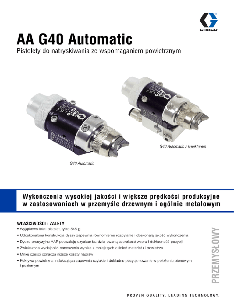 AA G40 Automatic Pistolety do natryskiwania ze wspomaganiem powietrznym G40 Automatic z kolektorem G40 Automatic Wykoñczenia wysokiej jakoœci i wiêksze prêdkoœci produkcyjne w zastosowaniach w przemyœle drzewnym i ogólnie metalowym • Wyj◊tkowo lekki pistolet, tylko 545 g • Udoskonalona konstrukcja dyszy zapewnia równomierne rozpylanie i doskonaΔ◊ jakoœæ wykoñczenia • Dysze precyzyjne AAP pozwalaj◊ uzyskaæ bardziej zwart◊ szerokoœæ wzoru i dokΔadnoœæ pozycji • Zwiêkszona wydajnoœæ nanoszenia wynika z mniejszych ciœnieñ materiaΔu i powietrza • Mniej czêœci oznacza ni¿sze koszty napraw • Pokrywa powietrzna indeksuj◊ca zapewnia szybkie i dokΔadne pozycjonowanie w poΔo¿eniu pionowym i poziomym PRZEMYS£OWY W£AŒCIWOŒCI i ZALETY P R O V E N Q U A L I T Y. L E A D I N G T E C H N O LO G Y. Cechy charakterystyczne serii AA WytrzymaΔa konstrukcja ze stali nierdzewnej Lekki pistolet wa¿y tylko 545 gram (1.2lb) Pokrywa powietrzna zapewnia miêkkie natryskiwanie Funkcja Aircap retain Pokrywa powietrzna indeksuj◊ca SzybkozΔ◊czki powietrza Wybór spoœród ró¿nych kolektorów Opcjonalny filtr na przewodzie materiaΔu (nie pokazano) Brak martwych punktów – recyrkulacja a¿ do dyszy Dostêpny kolektor z tylnymi otworami dla kompaktowych zastosowañ Dostêpny jest równie¿ model G40 Auto z dysz◊ natryskiwania Reverse-A-Clean (RAC) Typowe zastosowania Typowe materiaΔy • Drewno i meble • Lakiery • Wykoñczenia skórzane • MateriaΔy katalizowane kwasem • Produkcja mebli i akcesoriów metalowych • MateriaΔy epoksydowe rozpuszczalnikowe i poliuretanowe • Wyroby metalowe • MateriaΔy poliuretanowe wodorozcieñczalne • MateriaΔy dwuskΔadnikowe z katalizatorem Specyfikacje techniczne Maksymalne ciœnienie materiaΔu . . . . . . . . . . . . . . . . . . . . . . . . . . . . . . . . . . . . . . . . . . . . . . . . . . . . . . . . . . . . . . . . . . . . . . . 276 bar (27,6 MPa, 4000 psi) Maksymalne ciœnienie robocze powietrza . . . . . . . . . . . . . . . . . . . . . . . . . . . . . . . . . . . . . . . . . . . . . . . . . . . . . . . . . . . . . . . . . . . . 7 bar (0,7 MPa, 100 psi) Maksymalne ciœnienie powietrza cylindra . . . . . . . . . . . . . . . . . . . . . . . . . . . . . . . . . . . . . . . . . . . . . . . . . . . . . . . . . . . . . . . . . . . . 7 bar (0,7 MPa, 100 psi) Minimalne ciœnienie uruchomienia . . . . . . . . . . . . . . . . . . . . . . . . . . . . . . . . . . . . . . . . . . . . . . . . . . . . . . . . . . . . . . . . . . . . . . . . . 3.5 bar (0,3 MPa, 50 psi) Prêdkoœæ spustu . . . . . . . . . . . . . . . . . . . . . . . . . . . . . . . . . . . . . . . . . . . . . . . . . . . . . . . . . . . . . . . . . . . . . . . . 60 ms (caΔkowite otwarcie lub zamkniêcie) Maksymalna temperatura robocza materiaΔu . . . . . . . . . . . . . . . . . . . . . . . . . . . . . . . . . . . . . . . . . . . . . . . . . . . . . . . . . . . . . . . . . . . . . . . . . . 49° C (120° F) Czêœci mokre . . . . . . . . . . . . . . . . . . . . . . . . . . . . . . . . . . . . . . . . . . . . . . . . . . . . . . . . . . . . . . . . . . . stal nierdzewna, wêglik, UHMWPE, acetal, polietylen . . . . . . . . . . . . . . . . . . . . . . . . . . . . . . . . . . . . . . . . . . . . . . . . . . . . . . . . . . . . . . . . . . . . . . . . . . . . . . fluoroelastomer odporny chemicznie, PTFE, poliamid Ciê¿ar pistoletu . . . . . . . . . . . . . . . . . . . . . . . . . . . . . . . . . . . . . . . . . . . . . . . . . . . . . . . . . . . . . . . . . . . . . . . . . . . . . . . . . . . . . . . . . . . . . . . . . 545 g (1,2 lb) Ciê¿ar pistoletu i kolektora . . . . . . . . . . . . . . . . . . . . . . . . . . . . . . . . . . . . . . . . . . . . . . . . . . . . . . . . . . . . . . . . . . . . . . . . . . . . . . . . . . . . . . . . 770 g (1,7 lb) Otwór wlotowy powietrza Powietrze rozpylania . . . . . . . . . . . . . . . . . . . . . . . . . . . . . . . . . . . . . . . . . . . . . . . . . . . . . . . . . . . . . . . . . . . . . . . . . . . . .rurka œrednica zewnêtrzna 3/8 in Powietrze nadmuchu . . . . . . . . . . . . . . . . . . . . . . . . . . . . . . . . . . . . . . . . . . . . . . . . . . . . . . . . . . . . . . . . . . . . . . . . . . . .rurka œrednica zewnêtrzna 3/8 in Powietrze cylindra . . . . . . . . . . . . . . . . . . . . . . . . . . . . . . . . . . . . . . . . . . . . . . . . . . . . . . . . . . . . . . . . . . . . . . . . . . . . . . .rurka œrednica zewnêtrzna 1/4 in Wlot materiaΔu . . . . . . . . . . . . . . . . . . . . . . . . . . . . . . . . . . . . . . . . . . . . . . . . . . . . . . . . . . . . . . . . . . . . . . . . . . . . . . . . . . . . . . . . . . . . . . . . . . . . 1/4 in npsm Wymiary (bez zΔ◊czek) . . . . . . . . . . . . . . . . . . . . . . . . . . . . . . . . . . . . . . . . . . . . . . . . . . . . . . . . . . . . . . . . . . . . . . . . . . . 135 mm L x 76 mm H x 51 mm W . . . . . . . . . . . . . . . . . . . . . . . . . . . . . . . . . . . . . . . . . . . . . . . . . . . . . . . . . . . . . . . . . . . . . . . . . . . . . . . . . . . . . . . . . . . . . . . . . (5,3 in L x 3,0 in H x 2,0 in W) Instrukcja obsΔugi . . . . . . . . . . . . . . . . . . . . . . . . . . . . . . . . . . . . . . . . . . . . . . . . . . . . . . . . . . . . . . . . . . . . . . . . . . . . . . . . . . . . . . . . . . . . . . . . . . . . 311052 Informacje wymagane do zamówienia INFORMACJE WYMAGANE DO ZAMÓWIENIA AKCESORIA 288046 249140 Pistolet standardowy Zawiera iglicê/kulkê z wêgliku oraz gniazdo dyfuzora z wêgliku. W zamówieniu podaje siê z wyboru dyszê precyzyjnego rozpylania AAP 288044 288053 U¿ywany do kontroli ciœnienia powietrza pokrywy przy ró¿nych ciœnieniach zasilania powietrza. Nie u¿ywaæ do faktycznego natryskiwania Pistolet dla materiaΔów katalizowanych kwasem Specjalnie zaprojektowany dla materiaΔów o niskiej lepkoœci, nieœciernych i katalizowanych kwasem. Zawiera iglicê/kulkê ze stali nierdze
