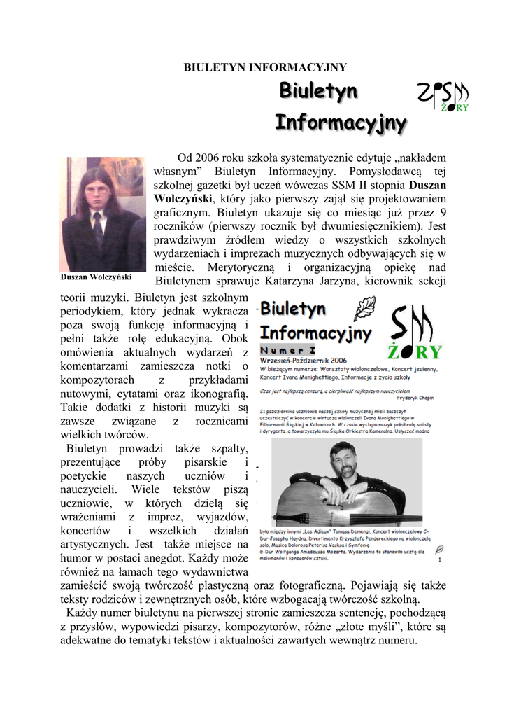 BIULETYN INFORMACYJNY Biuletyn Informacyjny Od 2006 roku szkoła systematycznie edytuje „nakładem własnym” Biuletyn Informacyjny. Pomysłodawcą tej szkolnej gazetki był uczeń wówczas SSM II stopnia Duszan Wolczyński, który jako pierwszy zajął się projektowaniem graficznym. Biuletyn ukazuje się co miesiąc już przez 9 roczników (pierwszy rocznik był dwumiesięcznikiem). Jest prawdziwym źródłem wiedzy o wszystkich szkolnych wydarzeniach i imprezach muzycznych odbywających się w mieście. Merytoryczną i organizacyjną opiekę nad Duszan Wolczyński Biuletynem sprawuje Katarzyna Jarzyna, kierownik sekcji teorii muzyki. Biuletyn jest szkolnym periodykiem, który jednak wykracza poza swoją funkcję informacyjną i pełni także rolę edukacyjną. Obok omówienia aktualnych wydarzeń z komentarzami zamieszcza notki o kompozytorach z przykładami nutowymi, cytatami oraz ikonografią. Takie dodatki z historii muzyki są zawsze związane z rocznicami wielkich twórców. Biuletyn prowadzi także szpalty, prezentujące próby pisarskie i poetyckie naszych uczniów i nauczycieli. Wiele tekstów piszą uczniowie, w których dzielą się wrażeniami z imprez, wyjazdów, koncertów i wszelkich działań artystycznych. Jest także miejsce na humor w postaci anegdot. Każdy może również na łamach tego wydawnictwa zamieścić swoją twórczość plastyczną oraz fotograficzną. Pojawiają się także teksty rodziców i zewnętrznych osób, które wzbogacają twórczość szkolną. Każdy numer biuletynu na pierwszej stronie zamieszcza sentencję, pochodzącą z przysłów, wypowiedzi pisarzy, kompozytorów, różne „złote myśli”, które są adekwatne do tematyki tekstów i aktualności zawartych wewnątrz numeru. Część informacyjna prowadzona jest z dziennikarską swadą. Zamieszcza wywiady z gośćmi odwiedzającymi szkołę, jak i osobowościami spotykanymi na wyjazdach szkolnych, np. z Wojciechem Kilarem, Adamem Makowiczem, Krzysztofem Jakowiczem. Przez cały okres wydawania przewinęły się różne cykliczne działy, m.in.: poetycki, plastyczny, kącik humoru, wszystkie jednak zawsze związane są bezpośrednio z muzyką, jej odbiorem, przekazywaniem, przeżywaniem, refleksją. Wyrazem zapotrzebowania na tego rodzaju gazetkę jest powiększająca się z roku na rok liczba jej stron. Odbiorcami „Biuletynu Informacyjnego” są sami uczniowie, nauczyciele, rodzice, a także słuchacze szkolnych koncertów, odbywających się poza murami szkoły. Dzięki temu informacje z działalności i życia szkoły docierają do szerszego kręgu czytelników. Gazeta jest rodzajem zaświadczenia z działalności szkoły i promuje ją w żorskim środowisku. Uczniowie zaś poprzez swoje prezentacje rozwijają własne zainteresowania, poszerzają wiedzę, kształtują umiejętności samodzielnej, twórczej pracy poprzez wyszukiwanie informacji na różne tematy. Mają szansę na swój osobisty rozwój, ucząc się odpowiedzialności w związku z wykonywaną pracą. „Biuletyn Informacyjny” jest z pewnością namacalnym „lustrem”, obrazem działań wewnątrzszkolnych, współpracy pomiędzy nauczycielami różnych sekcji, integracji w społeczności szkolnej, a poprzez swą wieloletnią obecność podnosi jakość pracy szkoły. Śledząc dokładnie wszystkie numery biuletynu (ostatnie wydanie to nr 101) można stwierdzić, że jest to „żywa dokumentacja” wszelkich wydarzeń szkoły widziana oczami ich twórców. W ten sposób redagowana jest rzadko spotykanym w szkołach muzycznych przejawem działania społeczności szkolnej, który jednocześnie wspiera proces edukacyjny.