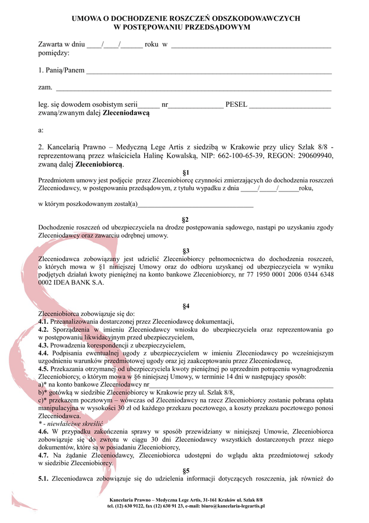 UMOWA O DOCHODZENIE ROSZCZEŃ ODSZKODOWAWCZYCH W POSTĘPOWANIU PRZEDSĄDOWYM Zawarta w dniu ____/____/______ roku w ___________________________________________ pomiędzy: 1. Panią/Panem __________________________________________________________________ zam.. __________________________________________________________________________ leg. się dowodem osobistym serii______ nr_______________ PESEL ______________________ zwaną/zwanym dalej Zleceniodawcą a: 2. Kancelarią Prawno – Medyczną Lege Artis z siedzibą w Krakowie przy ulicy Szlak 8/8 reprezentowaną przez właściciela Halinę Kowalską, NIP: 662-100-65-39, REGON: 290609940, zwaną dalej Zleceniobiorcą. §1 Przedmiotem umowy jest podjęcie przez Zleceniobiorcę czynności zmierzających do dochodzenia roszczeń Zleceniodawcy, w postępowaniu przedsądowym, z tytułu wypadku z dnia _____/_____/______roku, w którym poszkodowanym został(a)__________________________________ §2 Dochodzenie roszczeń od ubezpieczyciela na drodze postępowania sądowego, nastąpi po uzyskaniu zgody Zleceniodawcy oraz zawarciu odrębnej umowy. §3 Zleceniodawca zobowiązany jest udzielić Zleceniobiorcy pełnomocnictwa do dochodzenia roszczeń, o których mowa w §1 niniejszej Umowy oraz do odbioru uzyskanej od ubezpieczyciela w wyniku podjętych działań kwoty pieniężnej na konto bankowe Zleceniobiorcy, nr 77 1950 0001 2006 0344 6348 0002 IDEA BANK S.A. §4 Zleceniobiorca zobowiązuje się do: 4.1. Przeanalizowania dostarczonej przez Zleceniodawcę dokumentacji, 4.2. Sporządzenia w imieniu Zleceniodawcy wniosku do ubezpieczyciela oraz reprezentowania go w postępowaniu likwidacyjnym przed ubezpieczycielem, 4.3. Prowadzenia korespondencji z ubezpieczycielem, 4.4. Podpisania ewentualnej ugody z ubezpieczycielem w imieniu Zleceniodawcy po wcześniejszym uzgodnieniu warunków przedmiotowej ugody oraz jej zaakceptowaniu przez Zleceniodawcę, 4.5. Przekazania otrzymanej od ubezpieczyciela kwoty pieniężnej po uprzednim potrąceniu wynagrodzenia Zleceniobiorcy, o którym mowa w §6 niniejszej Umowy, w terminie 14 dni w następujący sposób: a)* na konto bankowe Zleceniodawcy nr______________________________________________________ b)* gotówką w siedzibie Zleceniobiorcy w Krakowie przy ul. Szlak 8/8, c)* przekazem pocztowym – wówczas od Zleceniodawcy na rzecz Zleceniobiorcy zostanie pobrana opłata manipulacyjna w wysokości 30 zł od każdego przekazu pocztowego, a koszty przekazu pocztowego ponosi Zleceniodawca. * - niewłaściwe skreślić 4.6. W przypadku zakończenia sprawy w sposób przewidziany w niniejszej Umowie, Zleceniobiorca zobowiązuje się do zwrotu w ciągu 30 dni Zleceniodawcy wszystkich dostarczonych przez niego dokumentów, które są w posiadaniu Zleceniobiorcy, 4.7. Na żądanie Zleceniodawcy, Zleceniobiorca udostępni do wglądu akta przedmiotowej szkody w siedzibie Zleceniobiorcy. §5 5.1. Zleceniodawca zobowiązuje się do udzielenia informacji dotyczących roszczenia, jak również do Kancelaria Prawno – Medyczna Lege Artis, 31-161 Kraków ul. Szlak 8/8 tel. (12) 630 9122, fax (12) 630 91 23, e-mail: [email protected] przedłożenia wszelkiej posiadanej w sprawie dokumentacji, niezbędnej do ustalenia zasadności i wysokości sumy dochodzonego przez Zleceniobiorcę roszczenia. 5.2. Zleceniobiorca nie ponosi odpowiedzialności za niezgodność ze stanem faktycznym dokumentów przedłożonych przez Zleceniodawcę celem dochodzenia roszczenia. §6 6.1. Za czynności ustalone w §4 niniejszej Umowy, Zleceniodawca zapłaci Zleceniobiorcy wynagrodzenie w wysokości ______% kwoty pieniężnej uzyskanej w postępowaniu przedsądowym przez Zleceniobiorcę od ubezpieczyciela. Do kwoty wynagrodzenia zostanie doliczony podatek VAT w kwocie 23%. Kwota wynagrodzenia z uwzględnieniem obowiązującej stawki podatku VAT w wysokości 23% wyniesie ______% kwoty pieniężnej uzyskanej w postępowaniu przedsądowym przez Zleceniobiorcę od ubezpieczyciela. 6.2. W przypadku, gdy przedmiotem świadczenia jest renta, Zleceniodawca zapłaci Zleceniobiorcy wynagrodzenie w wysokości ______ krotności miesięcznej kwoty przyznanej renty, dokonując wpłaty wynagrodzenia na rachunek bankowy Zleceniobiorcy określony w §2 niniejszej Umowy w terminie 720 dni, od momentu otrzymania pierwszego świadczenia. Kwota wynagrodzenia obejmuje podatek VAT w kwocie 23%. §7 7.1. W przypadku zawinionego przez Zleceniobiorcę nie wystosowania w ciągu 45 dni od dnia podpisania Umowy wniosku o wypłatę odszkodowania/zadośćuczynienia zmierzającego do likwidacji szkody w postępowaniu przedsądowym, Zleceniobiorca zapłaci Zleceniodawcy karę umowną w wysokości 500 zł. 7.2. W przypadku wypowiedzenia Umowy przez Zleceniodawcę, Zleceniobiorcy przysługują roszczenia przewidziane w art. 742 Kodeksu cywilnego, tj. o część wynagrodzenia odpowiadającą wykonanym czynnościom, o zwrot poniesionych kosztów, w tym koszty obsługi administracyjnej oraz koszty obsługi prawnej. §8 W przypadku nie uzyskania przez Zleceniobiorcę na rzecz Zleceniodawcy żadnych kwot pieniężnych od ubezpieczyciela na drodze postępowania przedsądowego, Zleceniobiorca nie pobierze od Zleceniodawcy wynagrodzenia z tytułu dochodzenia roszczeń odszkodowawczych. §9 Zleceniobiorca tj. Kancelaria Prawno - Medyczna Lege Artis z siedzibą w Krakowie przy ul. Szlak 8/8 jako administrator danych osobowych informuje, że dane osobowe Zleceniodawcy zostaną wykorzystane do celów realizacji niniejszej umowy. Zleceniodawca ma prawo dostępu do treści swoich danych osobowych oraz prawo do ich poprawiania zgodnie z ustawą z dnia 29.08.1997r. o ochronie danych osobowych (Dz.U.Nr 133, poz. 883 z późn. zmianami). §10 Zleceniodawca oświadcza, że zapoznał się i zrozumiał treść niniejszej umowy oraz potwierdza odbiór „wzoru oświadczenia o odstąpieniu od umowy”. §11 W sprawach nieuregulowanych niniejszą Umową mają zastosowanie przepisy kodeksu cywilnego. §12 Wszelkie z