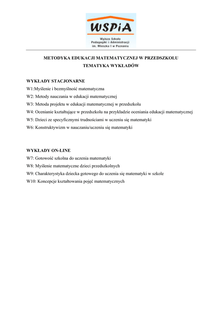 METODYKA EDUKACJI MATEMATYCZNEJ W PRZEDSZKOLU TEMATYKA WYKŁADÓW WYKŁADY STACJONARNE W1:Myślenie i bezmyślność matematyczna W2: Metody nauczania w edukacji matematycznej W3: Metoda projektu w edukacji matematycznej w przedszkolu W4: Ocenianie kształtujące w przedszkolu na przykładzie oceniania edukacji matematycznej W5: Dzieci ze specyficznymi trudnościami w uczeniu się matematyki W6: Konstruktywizm w nauczaniu/uczeniu się matematyki WYKŁADY ON-LINE W7: Gotowość szkolna do uczenia matematyki W8: Myślenie matematyczne dzieci przedszkolnych W9: Charakterystyka dziecka gotowego do uczenia się matematyki w szkole W10: Koncepcje kształtowania pojęć matematycznych