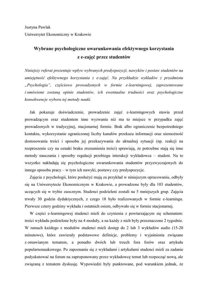 Justyna Pawlak Uniwersytet Ekonomiczny w Krakowie Wybrane psychologiczne uwarunkowania efektywnego korzystania z e-zajęć przez studentów Niniejszy referat prezentuje wpływ wybranych predyspozycji, nawyków i postaw studentów na umiejętność efektywnego korzystania z e-zajęć. Na przykładzie wykładów z przedmiotu „Psychologia”, częściowo prowadzonych w formie e-learningowej, zaprezentowane i omówione zostaną opinie studentów, ich ewentualne trudności oraz psychologiczne konsekwencje wyboru tej metody nauki. Jak pokazuje doświadczenie, prowadzenie zajęć e-learningowych stawia przed prowadzącym oraz studentem inne wyzwania niż ma to miejsce w przypadku zajęć prowadzonych w tradycyjnej, stacjonarnej formie. Brak albo ograniczenie bezpośredniego kontaktu, wykorzystanie ograniczonej liczby kanałów przekazu informacji oraz niemożność dostosowania treści i sposobu jej przekazywania do aktualnej sytuacji (np. reakcji na rozproszenie czy na oznaki braku zrozumienia treści) sprawiają, że potrzebne stają się inne metody nauczania i sposoby regulacji przebiegu interakcji wykładowca – student. Na to wszystko nakładają się psychologiczne uwarunkowania studentów przyzwyczajonych do innego sposobu pracy – w tym ich nawyki, postawy czy predyspozycje. Zajęcia z psychologii, które posłużyć mają za przykład w niniejszym opracowaniu, odbyły się na Uniwersytecie Ekonomicznym w Krakowie, a prowadzone były dla 103 studentów, uczących się w trybie zaocznym. Studenci podzieleni zostali na 5 mniejszych grup. Zajęcia trwały 30 godzin dydaktycznych, z czego 18 było realizowanych w formie e-learningu. Pierwsze cztery godziny wykładu i ostatnich osiem, odbywało się w formie stacjonarnej. W części e-learningowej studenci mieli do czynienia z powtarzającym się schematem: treści wykładu podzielone były na 4 moduły, a na każdy z nich były przeznaczone 2 tygodnie. W ramach każdego z modułów studenci mieli dostęp do 2 lub 3 wykładów audio (15-20 minutowe), które zawierały podstawowe definicje, problemy i wyjaśnienia związane z omawianym tematem, a ponadto dwóch lub trzech fora forów oraz artykułu popularnonaukowego. Po zapoznaniu się z wykładami i artykułami studenci mieli za zadanie podyskutować na forum na zaproponowany przez wykładowcę temat lub rozpocząć nową, ale związaną z tematem dyskusję. Wypowiedzi były punktowane, pod warunkiem jednak, że zostały zamieszczone w wyznaczonym czasie i były poprawne pod względem merytorycznym. Dodatkowo uczestnicy mogli wziąć udział w anonimowej ankiecie, dotyczącej oceny omawianej problematyki. Po zakończeniu pracy nad danym modułem prowadzący podsumowywał każde forum dyskusyjne, systematyzując lub ewentualnie sprostowując pojawiające się tam informacje, a także omawiając wyniki głosowania. W ramach podsumowania całej pracy uczestnicy, podzieleni na ok. 5-osobowe grupy, pisali esej na wyznaczony przez prowadzącego temat – wymagający połączenia wiedzy z omawianych modułów – za który również można było otrzymać punkty. W sumie w czasie zajęć e-learningowych studenci mogli zebrać 60 proc. wszystkich punktów, a pozostałe 40 proc. uzyskać mogli na teście końcowym. Po skończeniu pracy na platformie studenci spotykali się na wykładach stacjonarnych, które miały na celu po pierwsze podsumowanie 8 tygodni zdalnego nauczania, a po drugie omówienie tych tematów w psychologii, które są ściśle związane ze społecznym funkcjonowaniem człowieka. Problemy pojawiające się w trakcie prowadzenia zajęć Perspektywa pracy w formie e-learningowej wywołała u studentów mieszane uczucia: z jednej strony pozytywne – co związane było przede wszystkim z logistyką (nie trzeba przyjeżdżać na wykłady) oraz z możliwością zebrania części punktów, liczących się do oceny końcowej, przed egzaminem, a zatem w mniej stresujących warunkach. Z drugiej strony pojawiły się odczucia negatywne: lęk przed nową, nieznaną sytuacją i obawa przed niepowadzeniem sobie z techniczną stroną kursu. Ustalono, że w przypadku jakichkolwiek problemów studenci mogą zwracać się o pomoc do prowadzącego. Pozostała jednak wciąż jeszcze wątpliwość, czy e-learning nie będzie oznaczał dla nich większego obciążenia. Należy przy okazji podkreślić, że w przypadku tych studentów, był to dla nich pierwszy kurs zrealizowany w tej formie, zatem oprócz wyznaczonych przez wykładowcę zadań dodatkowe obciążenie stanowiła ich nowość, konieczność zapoznania się z procedurą i niepewność co do własnego sposobu radzenia sobie w takiej sytuacji. Podczas gdy w czasie pracy nad pierwszym modułem problemem było zachęcenie studentów do rozpoczęcia dyskusji i włączenie do niej jak największej liczby osób, to w następnych tygodniach liczba wypowiedzi gwałtownie się zwiększyła, a ich przeczytanie (i ocena) wymagało dużej ilości czasu. Niemniej jednak wciąż pozostała pewna grupa osób, które nie brały aktywnego udziału w zajęciach, mimo różnego rodzaju zachęt. Ciekawym i efektywnym czynnikiem wpływającym na podejście studentów do przedmiotu była indywidualna i bezpośrednia pochwała wysyłana do nich przez wykładowcę za pośrednictwem funkcji „Wiadomość do uczestnika kursu”. Wielu studentów podkreślało, że czuli się zauważeni i docenieni, otrzymując w ciągu trwania kursu choć jedną wiadomość poświęconą tylko ich wypowiedziom. W trakcie trwania kursu uwidoczniły się również różnice w pracy poszczególnych grup: w niektórych pojawiły się bardzo ciekawe i osobiste wypowiedzi, co sprawiło, że więcej osób włączyło się i zaangażowało w pracę. W efekcie w toku zajęć grupa była coraz bardziej zgrana, a wypowiedzi coraz pełniejsze. Natomiast w jednej z grup uczestnicy do końca wypowiadali się z rezerwą, krótko i bezosobowo, i mimo stosowania przez wykładowcę różnych 