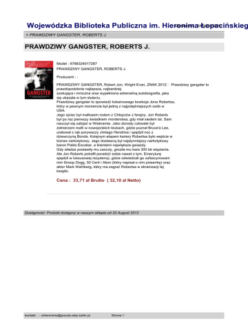 Utworzono : 02Łopacińskieg March 2017 Wojewódzka Biblioteka Publiczna im. Hieronima > PRAWDZIWY GANGSTER, ROBERTS J. PRAWDZIWY GANGSTER, ROBERTS J. Model : 9788324017287 PRAWDZIWY GANGSTER, ROBERTS J. Producent : PRAWDZIWY GANGSTER, Robert Jon, Wright Evan, ZNAK 2012� Prawdziwy gangster to prawdopodobnie najlepsza, najbardziej szokująca i mroczna oraz wypełniona adrenaliną autobiografia, jaka się ukazała w tym stuleciu. Prawdziwy gangster to spowiedź kokainowego kowboja Jona Robertsa, który w pewnym momencie był jedną z najpotężniejszych osób w USA. Jego ojciec był mafiosem rodem z Chłopców z ferajny. Jon Roberts był po raz pierwszy świadkiem morderstwa, gdy miał siedem lat. Sam nauczył się zabijać w Wietnamie. Jako dorosły człowiek był żołnierzem mafii w nowojorskich klubach, gdzie poznał Bruce'a Lee, uratował z rąk porywaczy Jimiego Hendrixa i spędził noc z dziewczyną Bonda. Kolejnym etapem kariery Robertsa było wejście w biznes narkotykowy. Jego dostawcą był najsłynniejszy narkotykowy baron Pablo Escobar, a klientami największe gwiazdy. Gdy władze postawiły mu zarzuty, groziła mu kara 300 lat więzienia. Ale Jon Roberts potrafił poradzić sobie nawet z tym. Emeryturę spędził w luksusowej rezydencji, gdzie odwiedzali go zafascynowani nim Snoop Dogg, 50 Cent i Akon (który napisał o nim piosenkę) oraz aktor Mark Wahlberg, który ma zagrać Robertsa w ekranizacji tej książki. Cena : 33,71 zł Brutto ( 32,10 zł Netto) Dostępność: Produkt dostępny w naszym sklepie od 20 August 2012 kontakt : - [email protected] Strona 1