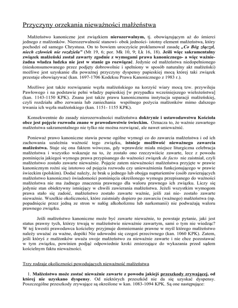 Przyczyny orzekania nieważności małżeństwa Małżeństwo kanoniczne jest związkiem nierozerwalnym, tj. obowiązującym aż do śmierci jednego z małżonków. Nierozerwalność stanowi- obok jedności- istotny element małżeństwa, który pochodzi od samego Chrystusa. On to bowiem uroczyście proklamował zasadę „Co Bóg złączył, niech człowiek nie rozdziela” (Mt 19, 6; por. Mk 10, 9; Łk 16, 18). Jeśli więc sakramentalny związek małżeński został zawarty zgodnie z wymogami prawa kanonicznego- a więc ważnieżadna władza ludzka nie jest w stanie go rozwiązać. Jedynie od małżeństwa niedopełnionego (nieskonsumowanego przez podjęty dobrowolnie i spełniony w sposób naturalny akt małżeński) możliwe jest uzyskanie dla poważnej przyczyny dyspensy papieskiej mocą której taki związek przestaje obowiązywać (kan. 1697-1706 Kodeksu Prawa Kanonicznego z 1983 r.). Możliwe jest także rozwiązanie węzła małżeńskiego na korzyść wiary mocą tzw. przywileju Pawłowego i na podstawie pełni władzy papieskiej [w przypadku wcześniejszego wielożeństwa] (kan. 1143-1150 KPK). Znana jest także prawu kanonicznemu instytucja separacji małżeńskiej, czyli rozdziału albo zerwania lub zaniechania wspólnego pożycia małżonków mimo dalszego trwania ich węzła małżeńskiego (kan. 1151- 1155 KPK). Konsekwentnie do zasady nierozerwalności małżeństwa doktrynie i ustawodawstwu Kościoła obce jest pojęcie rozwodu znane w prawodawstwie świeckim. Oznacza to, że ważnie zawartego małżeństwa sakramentalnego nie tylko nie można rozwiązać, ale nawet unieważnić. Ponieważ prawo kanoniczne stawia pewne ogólne wymogi co do zawarcia małżeństwa i od ich zachowania uzależnia ważność tego związku, istnieje możliwość nieważnego zawarcia małżeństwa. Staje się ona faktem wówczas, gdy wprawdzie miała miejsce liturgiczna celebracja małżeństwa i wszystko wskazuje na to, że zostało ono rzeczywiście zawarte, lecz z powodu pominięcia jakiegoś wymogu prawa przypisanego do ważności związek de facto nie zaistniał, czyli małżeństwo zostało zawarte nieważnie. Pojęcie zatem nieważności małżeństwa przyjęte w prawie kanonicznym rożni się istotowo od pojęcia rozwodu czy unieważnienia funkcjonującego w prawie świeckim (polskim). Dodać należy, że brak u jednego lub obojga nupturientów (osób zawierających małżeństwo kanoniczne) świadomości pominięcia określonego wymogu przepisanego do ważności małżeństwa nie ma żadnego znaczenia prawnego dla waloru prawnego ich związku. Liczy się jedynie stan obiektywny istniejący w chwili zawierania małżeństwa. Jeżeli wszystkim wymogom prawa stało się zadość, małżeństwo zostało zawarte ważnie, jeśli zaś nie- zostało zawarte nieważnie. Wszelkie okoliczności, które zaistniały dopiero po zawarciu (ważnego) małżeństwa (np. popadnięcie przez jedną ze stron w nałóg alkoholizmu lub narkomanii) nie podważają waloru prawnego związku. Jeśli małżeństwo kanoniczne może być zawarte nieważnie, to powstaje pytanie, jaki jest status prawny tych, którzy trwają w małżeństwie nieważnie zawartym, sami o tym nie wiedząc? W tej kwestii prawodawca kościelny przyjmuje domniemanie prawne w myśl którego małżeństwo należy uważać za ważne, dopóki Nie udowodni się czegoś przeciwnego (kan. 1060 KPK). Zatem, jeśli któryś z małżonków uważa swoje małżeństwo za nieważnie zawarte i nie chce pozostawać w tym związku, powinien podjąć odpowiednie kroki zmierzające do wykazania przed sądem kościelnym faktu nieważności. Trzy rodzaje okoliczności powodujących nieważność małżeństwa 1. Małżeństwo może zostać nieważnie zawarte z powodu jakiejś przeszkody zrywającej, od której nie uzyskano dyspensy. Od niektórych przeszkód nie da się uzyskać dyspensy. Poszczególne przeszkody zrywające są określone w kan. 1083-1094 KPK. Są one następujące: • • • • • • • • • • • • Wieku (14 lat dla kobiety i 16 dla mężczyzny); Niezdolności płciowej (impotencja); Węzła małżeńskiego (małżeństwo z inną osobą); Różność religii (ślub z osobą nieochrzczoną); Święceń; Profesji zakonnej; Uprowadzenia; Występku (małżonkobójstwo); Pokrewieństwa (w linii prostej i do 4 stopnia linii bocznej); Powinowactwa (w linii prostej); Przyzwoitości publicznej; Pokrewieństwa prawnego (powstałego z adopcji). W trybunałach kościelnych nie spotyka się raczej spraw o stwierdzenie nieważności małżeństwa z wyżej wymienionych powodów. 2. Małżeństwo może zostać nieważnie zawarte wskutek braków dotyczących zgody małżeńskiej. Istnieje tutaj szereg okoliczności sprawiających nieważność małżeństwa. Określają je kan. 1095-1107 KPK. Najważniejsze z nich to: • Brak minimum poznania małżeńskiego; • Pozbawienie używania rozumu (choroba umysłowa); • Poważny brak rozeznania oceniającego co do istotnych praw i obowiązków małżeńskich (brak pewnej dojrzałości sądu, rozeznania proporcjonalnego do natury zawieranej umowy. Osoba jest niezdolna do właściwego uchwycenia natury wspólnego życia, implikującego określone prawa i obowiązki małżeńskie. Zgoda małżeńska nie może być dobrowolnie wyrażona, skoro kontrahent nie posiada zdolności do jej rozeznania. Zatem chociażby ktoś znał abstrakcyjnie obowiązki małżeńskie, lecz nie był zdolny ocenić subiektywnie swego stanu, wówczas nie można mówić o właściwej ocenie i praktycznej zdolności do zawarcia związku małżeńskiego). • Niezdolność do podjęcia istotnych obowiązków małżeńskich z przyczyn natury psychicznej (chodzi o sytuacje, w których dany podmiot, jakkolwiek posiada wystarczające używanie rozumu i jest w stanie dokonać rozeznania oceniającego co do istotnych praw i obowiązków małżeńskich, to jednak- wskutek zaburzeń natury psychicznej- nie jest w stanie podjąć, a tym