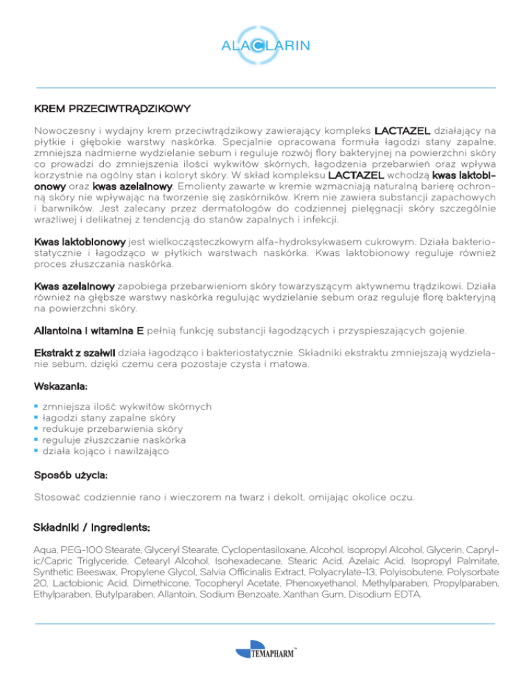KREM PRZECIWTRĄDZIKOWY Nowoczesny i wydajny krem przeciwtrądzikowy zawierający kompleks LACTAZEL działający na płytkie i głębokie warstwy naskórka. Specjalnie opracowana formuła łagodzi stany zapalne, zmniejsza nadmierne wydzielanie sebum i reguluje rozwój flory bakteryjnej na powierzchni skóry co prowadzi do zmniejszenia ilości wykwitów skórnych, łagodzenia przebarwień oraz wpływa korzystnie na ogólny stan i koloryt skóry. W skład kompleksu LACTAZEL wchodzą kwas laktobionowy oraz kwas azelainowy. Emolienty zawarte w kremie wzmacniają naturalną barierę ochronną skóry nie wpływając na tworzenie się zaskórników. Krem nie zawiera substancji zapachowych i barwników. Jest zalecany przez dermatologów do codziennej pielęgnacji skóry szczególnie wrażliwej i delikatnej z tendencją do stanów zapalnych i infekcji. Kwas laktobionowy jest wielkocząsteczkowym alfa-hydroksykwasem cukrowym. Działa bakteriostatycznie i łagodząco w płytkich warstwach naskórka. Kwas laktobionowy reguluje również proces złuszczania naskórka. Kwas azelainowy zapobiega przebarwieniom skóry towarzyszącym aktywnemu trądzikowi. Działa również na głębsze warstwy naskórka regulując wydzielanie sebum oraz reguluje florę bakteryjną na powierzchni skóry. Allantoina i witamina E pełnią funkcję substancji łagodzących i przyspieszających gojenie. Ekstrakt z szałwii działa łagodząco i bakteriostatycznie. Składniki ekstraktu zmniejszają wydzielanie sebum, dzięki czemu cera pozostaje czysta i matowa. Wskazania:      zmniejsza ilość wykwitów skórnych łagodzi stany zapalne skóry redukuje przebarwienia skóry reguluje złuszczanie naskórka działa kojąco i nawilżająco Sposób użycia: Stosować codziennie rano i wieczorem na twarz i dekolt, omijając okolice oczu. Aqua, PEG-100 Stearate, Glyceryl Stearate, Cyclopentasiloxane, Alcohol, Isopropyl Alcohol, Glycerin, Caprylic/Capric Triglyceride, Cetearyl Alcohol, Isohexadecane, Stearic Acid, Azelaic Acid, Isopropyl Palmitate, Synthetic Beeswax, Propylene Glycol, Salvia Officinalis Extract, Polyacrylate-13, Polyisobutene, Polysorbate 20, Lactobionic Acid, Dimethicone, Tocopheryl Acetate, Phenoxyethanol, Methylparaben, Propylparaben, Ethylparaben, Butylparaben, Allantoin, Sodium Benzoate, Xanthan Gum, Disodium EDTA.