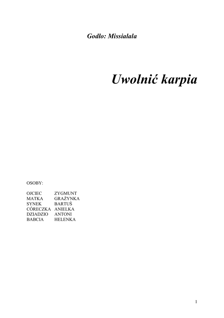 Godło: Missialala Uwolnić karpia OSOBY: OJCIEC MATKA SYNEK CÓRECZKA DZIADZIO BABCIA ZYGMUNT GRAŻYNKA BARTUŚ ANIELKA ANTONI HELENKA 1 AKT I OJCIEC Ojciec, no ile można. MATKA Niechże tatuś da spokój. OJCIEC No ale ojciec, ile to już trwa? MATKA No niechże się tatuś zlituje, normalnie. OJCIEC Ale my ojca bardzo prosimy. MATKA Tatuś leży, tatuś się nie podnosi. OJCIEC Ojciec leży, niech ojciec będzie rozsądny. MATKA Rozsądny i rozważny. OJCIEC Rozważny i roztropny. MATKA Roztropny i racjonalny. OJCIEC Racjonalny i odpowiedzialny. MATKA Odpowiedzialny i konsekwentny. OJCIEC Ale ojciec da spokój, święta idą. MATKA Niech tatuś pozwoli nam je w spokoju przeżyć. OJCIEC Rany boskie, ojciec, no jak długo jeszcze? MATKA Tatusiu, my naprawdę mamy już tego dość. OJCIEC Niech ojciec wyświadczy nam tą ostatnią przysługę. MATKA No co tatusiowi szkodzi. OJCIEC Ojciec jeszcze zrobi dla nas tą ostatnią rzecz i ojciec będzie mieć już święty spokój na wieki. MATKA Nigdy więcej o nic tatusia nie będziemy prosić. OJCIEC To ostatni raz. MATKA Naprawdę ostatni raz. OJCIEC Ostatni i koniec. MATKA Koniec i szlus. OJCIEC Szlus i basta. MATKA Nigdy więcej. OJCIEC Ojciec nie wstaje, ojciec leży. MATKA Niech tatuś leży przykładnie, jak Bozia nakazała. OJCIEC Leży i się nie rusza. BABCIA Runczki na kołderce. MATKA No jak długo tatuś chce to jeszcze ciągnąć? OJCIEC Już ojcu wystarczy. MATKA Ale tatusiu kochany, to trwa już dwadzieścia lat. OJCIEC Osiemdziesiąt pięć lat. BABCIA Dla mnie sześćdziesiąt siedem lat. OJCIEC To już się robi powoli nużące. MATKA No to skoro tatuś nie ma litości nade mną, to niechże się tatuś chociaż zlituje nad wnukami. DZIADEK Nie, bede twardy. OJCIEC Ja zwariuję. MATKA Ja oszaleję. BABCIA Koniec świata. MATKA No dom wariatów, normalnie. ... OJCIEC Ojciec leży, ojciec przecież umiera. MATKA Niech tatuś grzecznie sobie umiera. OJCIEC Ale ojciec leży, ojciec się nie podnosi, ojciec przecież umiera. 2 MATKA Niech tatuś spokojnie sobie umiera. OJCIEC Nigdzie ojciec nie będzie wstawał, ojciec ma leżeć i umrzeć. DZIADEK Kkkiedy? OJCIEC Jak najszybciej. MATKA Intuicja mi mówi, że to już niedługo. OJCIEC Właśnie. MATKA Za godzinę, dzisiaj, góra jutro. DZIADEK Nie da rady. MATKA Ja oszaleję. OJCIEC No niechżesz ojciec znowu nie zaczyna. MATKA No ile tatuś nas jeszcze będzie trzymał w niepewności? OJCIEC Właśnie, ile jeszcze? MATKA Mamusia od pół roku modli się o śmierć dla tatusia. DZIADEK Niech sie modli, wtedy przynajmnij nie godo głupot. MATKA Ja oszaleję. OJCIEC Ja zwariuję. MATKA Jak kolejny raz tatuś nam ucieknie, to ja nie wytrzymam. OJCIEC Ojcu znowu coś do łba strzeli. MATKA Ja oszaleję. OJCIEC Podjął ojciec decyzję? DZIADEK Nnn... OJCIEC Ale podjął ojciec decyzję? DZIADEK Nooo... OJCIEC Ogłosił ją ojciec uroczyście? DZIADEK Nnnn... OJCIEC Ale ogłosił ją ojciec uroczyście? DZIADEK Nooo... OJCIEC No to niech ojciec będzie teraz konsekwentny i ją zrealizuje. MATKA Tylko szybciutko. DZIADEK Miałem depresje. MATKA Ja oszaleję, znowu będzie wszystko zwalać na te swoje depresje. OJCIEC Ja zwariuję. DZIADEK Skończył mi sie prozak. OJCIEC Co? MATKA A Bartuś zapomniał mu kupić tabletek. OJCIEC Ja zwariuję. MATKA Depresja tatusiu nie wyłącza odpowiedzialności. OJCIEC Najwięksi, ojciec, podejmowali decyzje w depresji i je realizowali. MATKA Konsekwentnie. DZIADEK Rozregulowałem sie. OJCIEC Ja zwariuję. MATKA Ja oszaleję. DZIADEK Kompletnie. MATKA No normalnie, dom wariatów. OJCIEC Ojcu już nawet najlepszy psychiatra nie pomoże. DZIADEK Na pewno nie ten konował, do którego mnie zaprowadziliście. MATKA Jest najlepszy w mieście. DZIADEK Kompletnie psychiczny. OJCIEC No to przynajmniej zna z autopsji problemy innych. MATKA Sąsiad, lepiej się czuł po wizytach u niego. 3 DZIADEK Sunsiad popełnił samobójstwo. MATKA Ale wcześniej dobrze się czuł. DZIADEK Ale sie powiesił. OJCIEC Zdarza się. MATKA Ja oszaleję. OJCIEC Ale ojciec, ojciec już przeżył swoje. MATKA Wojnę. OJCIEC Nazizm. MATKA Stalinizm. OJCIEC Komunizm. MATKA Komunizm-tak-wypaczenia-nie. OJCIEC Socjalizm. MATKA Socjalizm-z-ludzką-twarzą. OJCIEC Kapitalizm. MATKA Dziki-kapitalizm. OJCIEC Liberalizm. MATKA Neoliberalizm. OJCIEC Feminizm. MATKA Hedonizm. OJCIEC Eskapizm. MATKA Wdupizm. OJCIEC Tumiwisizm. MATKA Pierdolizm. OJCIEC Ojciec zaliczył już wszystkie możliwe „izmy”. MATKA Tatuś już przeżył wszystko, co było do przeżycia. OJCIEC Ojciec żył w najlepszych czasach. DZIADEK Popieprzone były. OJCIEC Tak ojciec, tak. MATKA Oczywiście tatusiu, oczywiście. DZIADEK I absurdalne. OJCIEC Tak ojciec, tak. MATKA Oczywiście tatusiu, oczywiście. OJCIEC I ojciec wyczerpał już swój życiowy limit absurdów. MATKA I tak miał tatuś ciekawiej niż inni. OJCIEC Nie każdy ma szanse żyć w takich dziwnych czasach. MATKA Nie każdy ma szanse aż tyle przeżyć tatusiu. OJCIEC Nie każdy. MATKA Nie każdemu jest dane tatusiu. OJCIEC A ojcu było. MATKA I to w nadmiarze. OJCIEC To chyba ojcu już wystarczy. MATKA Całkowicie. OJCIEC No to teraz czas na zasłużony odpoczynek w grobie. SYNEK Tera czas na katolicyzm forewer. OJCIEC Cicho bądź! MATKA Idź stąd! DZIADEK Mój czas jeszcze nie nadszedł. OJCIEC Ale ojciec, Bóg już na ojca czeka. MATKA Niecierpliwi się. DZIADEK To se poczeka. 4 OJCIEC Ale ojciec, czy ojciec zawsze musi być w centrum uwagi? MATKA Niech tatuś ustąpi miejsca innym. OJCIEC Zawsze ojciec mówił, że mądry głupiemu ustępuje. MATKA Niechże tatuś odejdzie z godnością. OJCIEC Ojciec jest już staruteńki i niedołężny. MATKA Zramolały i niedomagający. OJCIEC Zdezelowany i niepełnosprawny. MATKA Zesklerociały i matuzalemowy. OJCIEC Zrujnowany i rozregulowany. MATKA Zmarnowany i zmurszały. OJCIEC Stetryczały i zdziadziały. MATKA Spierniczały i sczerstwiały. OJCIEC Zgrzybiały i strupieszały. MATKA Żadnego pożytku j