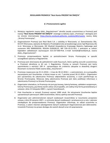 REGULAMIN PROMOCJI "Nest Konto PREZENT NA ŚWIĘTA" § 1 Postanowienia ogólne 1. Niniejszy regulamin zwany dalej „Regulaminem” określa zasady uczestnictwa w Promocji pod nazwą "Nest Konto PREZENT NA ŚWIĘTA" zwanego w dalszej części „Promocją” i dostępny jest na stronie internetowej https://konta.nestbank.pl/konto_osobiste/001/swieta zwaną dalej „Stroną Promocyjną”. 2. Organizatorem Promocji jest Nest Bank S.A. z siedzibą w Warszawie, ul. Domaniewska 39a, 02-672 Warszawa, wpisana do Rejestru Przedsiębiorców prowadzonego przez Sąd Rejonowy dla m.st. Warszawy w Warszawie, XIII Wydział Gospodarczy Krajowego Rejestru Sądowego pod numerem KRS 0000030330, REGON 010928125, NIP 526-10-21-021, z pokrytym w całości kapitałem zakładowym wynoszącym 313 237 000 PLN, e-mail: [email protected], zwana dalej „Organizatorem”. 3. Promocja przeprowadzona będzie za pośrednictwem Strony Promocyjnej w sposób szczegółowo opisany w Regulaminie. 4. Promocja jest skierowana do pełnoletnich osób fizycznych, które spełnią warunki uczestnictwa w Promocji określone w §2 ust. 1 Regulaminu. Premią w ramach Promocji jest karta upominkowa o wartości 100 zł uprawniająca do zrobienia zakupów w dowolnej drogerii Rossmann na terenie Polski zwana dalej „Voucherem”. 5. Promocja rozpoczyna się 25.11.2016 r. i trwa do 30.12.2016 r. z zastrzeżeniem, że w przypadku wyczerpania puli Voucherów, o której mowa w ust. 7 poniżej przed 30.12.2016 r. Organizator jest uprawniony do zakończenia Promocji odpowiednio wcześniej, o czym poinformuje na Stronie Promocyjnej. Wówczas datą zakończenia Promocji jest data publikacji informacji o zakończeniu Promocji na Stronie Promocyjnej. 6. Organizator oświadcza, że Promocja nie jest grą losową, loterią fantową, zakładem wzajemnym, loterią Promocyjną, grą której wynik zależy od przypadku, ani żadną inną formą przewidzianą w ustawie z dnia 15 listopada 2009 r. o grach hazardowych. 7. Pula Voucherów w ramach Promocji wynosi 1000 sztuk. Do otrzymania Voucherów będzie uprawnionych pierwszych 1000 Uczestników, którzy spełnią warunki Promocji. 8. Organizator jest administratorem danych osobowych Uczestników w rozumieniu przepisów ustawy z dnia 29 sierpnia 1997 r. o ochronie danych osobowych i przetwarza je w celu i zakresie niezbędnym do przeprowadzenia Promocji. Organizator informuje, że udział uczestnika w Promocji, a zatem również udostępnienie danych osobowych Organizatorowi jest dobrowolne. Uczestnik Promocji ma prawo dostępu do swoich danych oraz ich poprawiania. § 2 Warunki uczestnictwa w Promocji i uzyskania Vouchera 1. Promocja przeznaczona jest dla pełnoletnich osób fizycznych, które łącznie spełniają następujące warunki: a) posiadają pełną zdolność do czynności prawnych oraz są konsumentami w rozumieniu art. 22(1) Kodeksu cywilnego i posiadają miejsce zamieszkania na terytorium Rzeczypospolitej Polskiej, b) złożą Wniosek o otwarcie NEST Konta dla klientów indywidualnych, o którym mowa w ust. 4 lit. a) poniżej, c) na dzień złożenia Wniosku, o którym mowa w ust. 4 lit. a) poniżej nie posiadają (nie współposiadają) i nie posiadały (nie współposiadały) rachunku oszczędnościowo rozliczeniowego oferowanego dotychczasowo przez Nest Bank (także pod innymi nazwami handlowymi), jak również nie złożyły wniosku o taki rachunek, który jest w trakcie rozpatrywania przez Organizatora. 2. Z Promocji wyłączeni są pracownicy Organizatora, osoby zatrudnione przez Organizatora na podstawie stosunku cywilnoprawnego, a także członkowie rodzin tych osób do drugiego stopnia pokrewieństwa. 3. Osoba fizyczna, która spełnia warunki, o których mowa w ust. 1 oraz nie jest wyłączona z udziału w Promocji na podstawie ust. 2, a zdecydują się na udział w Promocji na zasadach określonych w Regulaminie będzie zwana: „Uczestnikiem”. 4. Aby uzyskać prawo do Vouchera w ramach Promocji Uczestnik zobowiązany jest spełnić łącznie poniższe warunki z zachowaniem ich kolejności: a) złożyć w okresie obowiązywania Promocji wniosek o Nest Konto znajdujący się wyłącznie na Stronie Promocyjnej, zwany w dalszej części „Wnioskiem”. W Promocji brane są pod uwagę wyłącznie Wnioski złożone za pośrednictwem Strony Promocyjnej, b) wyrazić zgodę na przetwarzanie jego danych osobowych w celach marketingowych przez Nest Bank oraz wysyłanie przez Nest Bank informacji handlowych drogą elektroniczną (pkt. 4 i 5 we wniosku o założenie Nest Konta), c) zawrzeć z Nest Bankiem umowę o Nest Konto, na podstawie Wniosku złożonego zgodnie z lit. a) powyżej. Przez zawartą umowę o Nest Konto rozumie się umowę skutecznie zawartą zgodnie z trybem przewidzianym w „Regulaminie rachunków bankowych oraz usług płatniczych dla Klientów indywidualnych”, d) nie korzystać z uprawnienia do odstąpienia od umowy, w terminie i na warunkach określonych przez obowiązujące przepisy prawa, e) zalogować się do bankowości internetowej Nest Banku na swoje konto, nie później niż w okresie 90 dni od momentu złożenia Wniosku. 5. Warunki otwarcia i prowadzenia Nest Konta będącego rachunkiem oszczędnościoworozliczeniowym prowadzonym przez Organizatora na rzecz konsumentów w złotych określa Regulamin rachunków bankowych oraz usług płatniczych dla Klientów indywidualnych oraz Tabela Oprocentowania- oferta Rachunków i Lokat i Tabela Opłat i Prowizji- oferta Rachunków i Kart dostępne na stronie internetowej www.nestbank.pl. 6. Uczestnik, który spełni warunki określone w ust. 4 powyżej otrzyma Voucher. Voucher zostanie wysłany uprawnionemu Uczestnikowi w terminie 14 dni roboczych od dnia spełnienia warunków Promocji. 7. Voucher wysłany zostanie pocztą na adres korespondencyjny podany przez Uczestnika podczas składania Wniosku o Nest Konto. 8. Voucher ważny jest od dnia rozpoczęcia Promocji i traci swoją ważność dnia 20.11.2017 roku. 