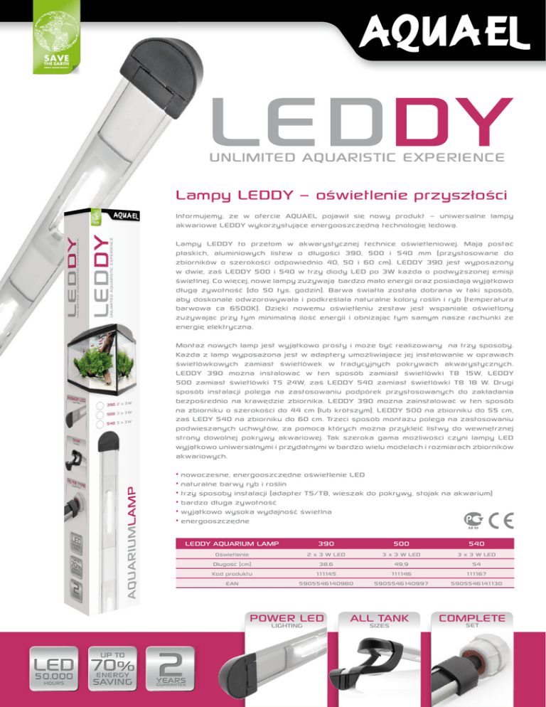 Lampy LEDDY – oświetlenie przyszłości Informujemy, że w ofercie AQUAEL pojawił się nowy produkt – uniwersalne lampy akwariowe LEDDY wykorzystujące energooszczędną technologię ledową. Lampy LEDDY to przełom w akwarystycznej technice oświetleniowej. Mają postać płaskich, aluminiowych listew o długości 390, 500 i 540 mm (przystosowane do zbiorników o szerokości odpowiednio 40, 50 i 60 cm). LEDDY 390 jest wyposażony w dwie, zaś LEDDY 500 i 540 w trzy diody LED po 3W każda o podwyższonej emisji świetlnej. Co więcej, nowe lampy zużywają bardzo mało energii oraz posiadają wyjątkowo długą żywotność (do 50 tys. godzin). Barwa światła została dobrana w taki sposób, aby doskonale odwzorowywała i podkreślała naturalne kolory roślin i ryb (temperatura barwowa ca 6500K). Dzięki nowemu oświetleniu zestaw jest wspaniale oświetlony zużywając przy tym minimalną ilość energii i obniżając tym samym nasze rachunki ze energię elektryczną. Montaż nowych lamp jest wyjątkowo prosty i może być realizowany na trzy sposoby. Każda z lamp wyposażona jest w adaptery umożliwiające jej instalowanie w oprawach świetlówkowych zamiast świetlówek w tradycyjnych pokrywach akwarystycznych. LEDDY 390 można instalować w ten sposób zamiast świetlówki T8 15W, LEDDY 500 zamiast świetlówki T5 24W, zaś LEDDY 540 zamiast świetlówki T8 18 W. Drugi sposób instalacji polega na zastosowaniu podpórek przystosowanych do zakładania bezpośrednio na krawędzie zbiornika. LEDDY 390 można zainstalować w ten sposób na zbiorniku o szerokości do 44 cm (lub krótszym), LEDDY 500 na zbiorniku do 55 cm, zaś LEDY 540 na zbiorniku do 60 cm. Trzeci sposób montażu polega na zastosowaniu podwieszanych uchwytów, za pomocą których można przykleić listwy do wewnętrznej strony dowolnej pokrywy akwariowej. Tak szeroka gama możliwości czyni lampy LED wyjątkowo uniwersalnymi i przydatnymi w bardzo wielu modelach i rozmiarach zbiorników akwariowych. • nowoczesne, energooszczędne oświetlenie LED • naturalne barwy ryb i roślin • trzy sposoby instalacji (adapter T5/T8, wieszak do pokrywy, stojak na akwarium) • bardzo długa żywotność • wyjątkowo wysoka wydajność świetlna • energooszczędne LEDDY AQUARIUM LAMP 390 500 540 Oświetlenie Długość [cm] Kod produktu EAN 2 x 3 W LED 38,6 111145 5905546140980 3 x 3 W LED 49,9 111146 5905546140997 3 x 3 W LED 54 111167 5905546141130 POWER LED LIGHTING up to LED 70 % 50.000 hours ENERGY SAVING 2 YEARS GUARANTEE ALLSIZES TANK COMPLETE SET