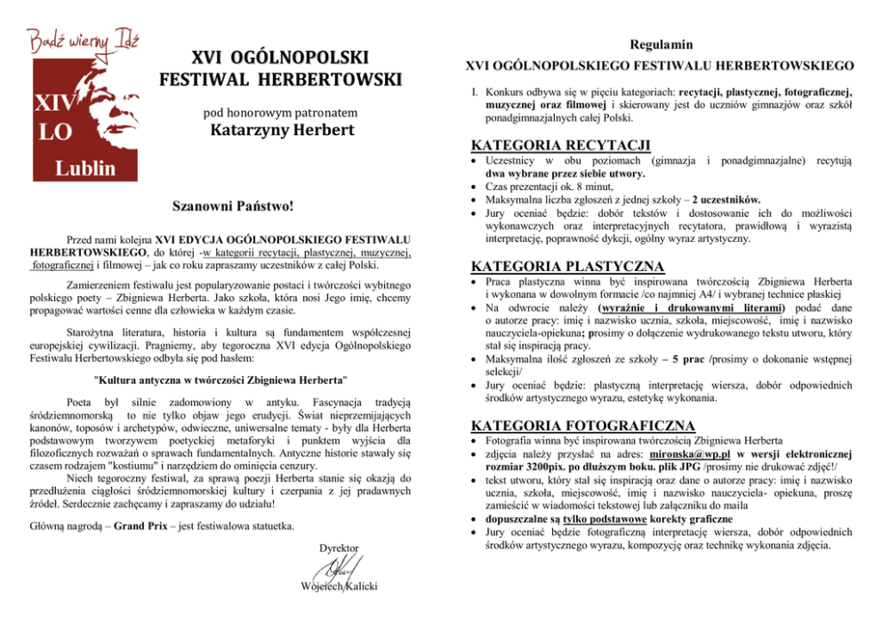 XVI OGÓLNOPOLSKI FESTIWAL HERBERTOWSKI pod honorowym patronatem Katarzyny Herbert Regulamin XVI OGÓLNOPOLSKIEGO FESTIWALU HERBERTOWSKIEGO I. Konkurs odbywa się w pięciu kategoriach: recytacji, plastycznej, fotograficznej, muzycznej oraz filmowej i skierowany jest do uczniów gimnazjów oraz szkół ponadgimnazjalnych całej Polski. KATEGORIA RECYTACJI Szanowni Państwo! Przed nami kolejna XVI EDYCJA OGÓLNOPOLSKIEGO FESTIWALU HERBERTOWSKIEGO, do której -w kategorii recytacji, plastycznej, muzycznej, fotograficznej i filmowej – jak co roku zapraszamy uczestników z całej Polski. Zamierzeniem festiwalu jest popularyzowanie postaci i twórczości wybitnego polskiego poety – Zbigniewa Herberta. Jako szkoła, która nosi Jego imię, chcemy propagować wartości cenne dla człowieka w każdym czasie. Starożytna literatura, historia i kultura są fundamentem współczesnej europejskiej cywilizacji. Pragniemy, aby tegoroczna XVI edycja Ogólnopolskiego Festiwalu Herbertowskiego odbyła się pod hasłem: "Kultura antyczna w twórczości Zbigniewa Herberta" Poeta był silnie zadomowiony w antyku. Fascynacja tradycją śródziemnomorską to nie tylko objaw jego erudycji. Świat nieprzemijających kanonów, toposów i archetypów, odwieczne, uniwersalne tematy - były dla Herberta podstawowym tworzywem poetyckiej metaforyki i punktem wyjścia dla filozoficznych rozważań o sprawach fundamentalnych. Antyczne historie stawały się czasem rodzajem "kostiumu" i narzędziem do ominięcia cenzury. Niech tegoroczny festiwal, za sprawą poezji Herberta stanie się okazją do przedłużenia ciągłości śródziemnomorskiej kultury i czerpania z jej pradawnych źródeł. Serdecznie zachęcamy i zapraszamy do udziału! Główną nagrodą – Grand Prix – jest festiwalowa statuetka. Dyrektor Wojciech Kalicki Uczestnicy w obu poziomach (gimnazja i ponadgimnazjalne) recytują dwa wybrane przez siebie utwory. Czas prezentacji ok. 8 minut, Maksymalna liczba zgłoszeń z jednej szkoły – 2 uczestników. Jury oceniać będzie: dobór tekstów i dostosowanie ich do możliwości wykonawczych oraz interpretacyjnych recytatora, prawidłową i wyrazistą interpretację, poprawność dykcji, ogólny wyraz artystyczny. KATEGORIA PLASTYCZNA Praca plastyczna winna być inspirowana twórczością Zbigniewa Herberta i wykonana w dowolnym formacie /co najmniej A4/ i wybranej technice płaskiej Na odwrocie należy (wyraźnie i drukowanymi literami) podać dane o autorze pracy: imię i nazwisko ucznia, szkoła, miejscowość, imię i nazwisko nauczyciela-opiekuna; prosimy o dołączenie wydrukowanego tekstu utworu, który stał się inspiracją pracy. Maksymalna ilość zgłoszeń ze szkoły – 5 prac /prosimy o dokonanie wstępnej selekcji/ Jury oceniać będzie: plastyczną interpretację wiersza, dobór odpowiednich środków artystycznego wyrazu, estetykę wykonania. KATEGORIA FOTOGRAFICZNA Fotografia winna być inspirowana twórczością Zbigniewa Herberta zdjęcia należy przysłać na adres: [email protected] w wersji elektronicznej rozmiar 3200pix. po dłuższym boku. plik JPG /prosimy nie drukować zdjęć!/ tekst utworu, który stał się inspiracją oraz dane o autorze pracy: imię i nazwisko ucznia, szkoła, miejscowość, imię i nazwisko nauczyciela- opiekuna, proszę zamieścić w wiadomości tekstowej lub załączniku do maila dopuszczalne są tylko podstawowe korekty graficzne Jury oceniać będzie fotograficzną interpretację wiersza, dobór odpowiednich środków artystycznego wyrazu, kompozycję oraz technikę wykonania zdjęcia. KATEGORIA MUZYCZNA Prezentacja – indywidualna lub zespołowa – muzycznej interpretacji wybranego utworu Zbigniewa Herberta. Mile widziana własna kompozycja instrumentalnowokalna. / Prosimy o zaznaczenie tej informacji na karcie zgłoszeniowej/ Czas prezentacji do 5 minut. Zapewniamy odtwarzacz CD, ewentualnie keyboard. Jury oceniać będzie umiejętność oddania nastroju poprzez muzykę, interesującą interpretację, ciekawą aranżację KATEGORIA FILMOWA Przedmiotem konkursu jest zrealizowanie filmu w dowolnej technice nawiązującego do życia lub twórczości Zbigniewa Herberta. Na festiwal przyjmowane będą filmy realizowane pojedynczo lub w grupach maksymalnie 2 osobowych. Jedna osoba / grupa osób może zgłosić maksymalnie 2 filmy. Nie występuje podział na kategorie wiekowe. Filmy mogą być zrealizowane w dowolnej technice (animacja, dokument, fabuła, forma filmowa) lub w technikach łączonych. Filmy mogą być realizowane za pomocą kamer, aparatów lub telefonów komórkowych – ważniejszy od techniki będzie pomysł na film. Pokaz slajdów/zdjęć nie będzie rozumiany jako film. Długość filmu nie może przekraczać 10 minut. Filmy należy przesyłać na płycie DVD lub nośniku USB, razem z kartą zgłoszenia. Płyta z filmem DVD powinna być opisana w następujący sposób: imię i nazwisko twórcy, tytuł filmu. Film powinien być nagrany w formacie avi, mov, mpg, mp4 kodowany za pomocą standardowych kodeków. Minimalna rozdzielczość filmu 720x576 pikseli. Film musi zawierać napisy końcowe, w których powinny znaleźć się: imię i nazwisko reżysera, imię i nazwisko aktora/aktorów, imię i nazwisko/zespół autora muzyki oraz tytuł utworu, rok produkcji, inne osoby które pomagały lub brały udział w realizacji filmu. Jury podczas oceny filmu będzie zwracać szczególną uwagę na pomysł oraz sposób jego realizacji (spójność fabuły, poprawne kadrowanie, właściwy montaż, poprawne używanie środków wyrazu artystycznego charakterystycznych dla języka filmu). Autorska muzyka będzie dodatkowym walorem. II. Zgłoszenia uczestników wszystkich kategorii należy dokonać do 10 marca 2016 r. wypełniając formularz zgłoszeniowy na stronie: www.14lo.lublin.pl, zakładka: Ogólnopolski Festiwal Herbertowski 2016 Prace plastyczne, fotograficzne i filmowe opatrzone informacjami określonymi w regulaminie należy przesła