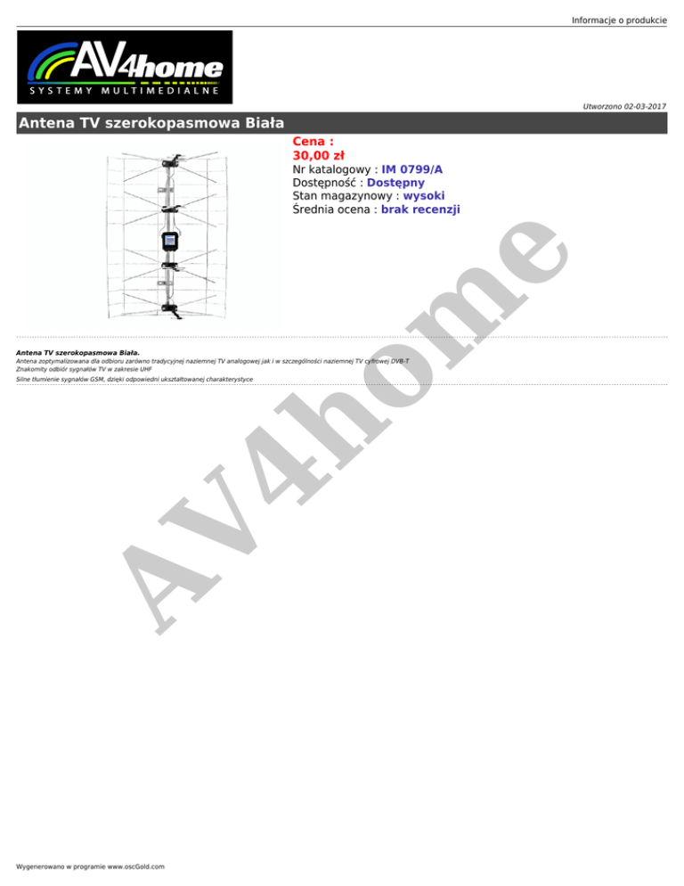 Informacje o produkcie Utworzono 02-03-2017 Antena TV szerokopasmowa Biała Cena : 30,00 zł Antena TV szerokopasmowa Biała. om e Nr katalogowy : IM 0799/A Dostępność : Dostępny Stan magazynowy : wysoki Średnia ocena : brak recenzji Antena zoptymalizowana dla odbioru zarówno tradycyjnej naziemnej TV analogowej jak i w szczególności naziemnej TV cyfrowej DVB-T Znakomity odbiór sygnałów TV w zakresie UHF AV 4h Silne tłumienie sygnałów GSM, dzięki odpowiedni ukształtowanej charakterystyce Wygenerowano w programie www.oscGold.com
