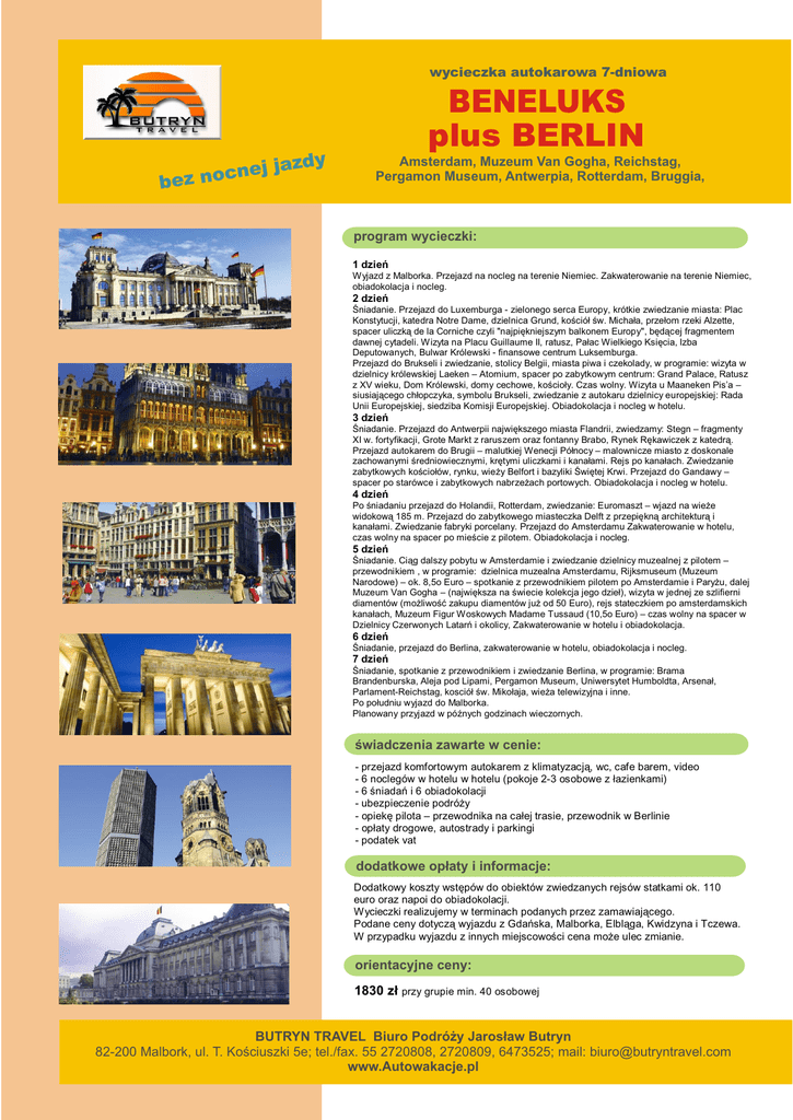 wycieczka autokarowa 7-dniowa dy nej jaz c o n z be BENELUKS plus BERLIN Amsterdam, Muzeum Van Gogha, Reichstag, Pergamon Museum, Antwerpia, Rotterdam, Bruggia, program wycieczki: 1 dzieñ Wyjazd z Malborka. Przejazd na nocleg na terenie Niemiec. Zakwaterowanie na terenie Niemiec, obiadokolacja i nocleg. 2 dzieñ Œniadanie. Przejazd do Luxemburga - zielonego serca Europy, krótkie zwiedzanie miasta: Plac Konstytucji, katedra Notre Dame, dzielnica Grund, koœció³ œw. Micha³a, prze³om rzeki Alzette, spacer uliczk¹ de la Corniche czyli "najpiêkniejszym balkonem Europy", bêd¹cej fragmentem dawnej cytadeli. Wizyta na Placu Guillaume II, ratusz, Pa³ac Wielkiego Ksiêcia, Izba Deputowanych, Bulwar Królewski - finansowe centrum Luksemburga. Przejazd do Brukseli i zwiedzanie, stolicy Belgii, miasta piwa i czekolady, w programie: wizyta w dzielnicy królewskiej Laeken – Atomium, spacer po zabytkowym centrum: Grand Palace, Ratusz z XV wieku, Dom Królewski, domy cechowe, koœcio³y. Czas wolny. Wizyta u Maaneken Pis’a – siusiaj¹cego ch³opczyka, symbolu Brukseli, zwiedzanie z autokaru dzielnicy europejskiej: Rada Unii Europejskiej, siedziba Komisji Europejskiej. Obiadokolacja i nocleg w hotelu. 3 dzieñ Œniadanie. Przejazd do Antwerpii najwiêkszego miasta Flandrii, zwiedzamy: Stegn – fragmenty XI w. fortyfikacji, Grote Markt z raruszem oraz fontanny Brabo, Rynek Rêkawiczek z katedr¹. Przejazd autokarem do Brugii – malutkiej Wenecji Pó³nocy – malownicze miasto z doskonale zachowanymi œredniowiecznymi, krêtymi uliczkami i kana³ami. Rejs po kana³ach. Zwiedzanie zabytkowych koœcio³ów, rynku, wie¿y Belfort i bazyliki Œwiêtej Krwi. Przejazd do Gandawy – spacer po starówce i zabytkowych nabrze¿ach portowych. Obiadokolacja i nocleg w hotelu. 4 dzieñ Po œniadaniu przejazd do Holandii, Rotterdam, zwiedzanie: Euromaszt – wjazd na wie¿e widokow¹ 185 m. Przejazd do zabytkowego miasteczka Delft z przepiêkn¹ architektur¹ i kana³ami. Zwiedzanie fabryki porcelany. Przejazd do Amsterdamu Zakwaterowanie w hotelu, czas wolny na spacer po mieœcie z pilotem. Obiadokolacja i nocleg. 5 dzieñ Œniadanie. Ci¹g dalszy pobytu w Amsterdamie i zwiedzanie dzielnicy muzealnej z pilotem – przewodnikiem , w programie: dzielnica muzealna Amsterdamu, Rijksmuseum (Muzeum Narodowe) – ok. 8,5o Euro – spotkanie z przewodnikiem pilotem po Amsterdamie i Pary¿u, dalej Muzeum Van Gogha – (najwiêksza na œwiecie kolekcja jego dzie³), wizyta w jednej ze szlifierni diamentów (mo¿liwoœæ zakupu diamentów ju¿ od 50 Euro), rejs stateczkiem po amsterdamskich kana³ach, Muzeum Figur Woskowych Madame Tussaud (10,5o Euro) – czas wolny na spacer w Dzielnicy Czerwonych Latarñ i okolicy, Zakwaterowanie w hotelu i obiadokolacja. 6 dzieñ Œniadanie, przejazd do Berlina, zakwaterowanie w hotelu, obiadokolacja i nocleg. 7 dzieñ Œniadanie, spotkanie z przewodnikiem i zwiedzanie Berlina, w programie: Brama Brandenburska, Aleja pod Lipami, Pergamon Museum, Uniwersytet Humboldta, Arsena³, Parlament-Reichstag, kosció³ œw. Miko³aja, wie¿a telewizyjna i inne. Po po³udniu wyjazd do Malborka. Planowany przyjazd w póŸnych godzinach wieczornych. œwiadczenia zawarte w cenie: - przejazd komfortowym autokarem z klimatyzacj¹, wc, cafe barem, video - 6 noclegów w hotelu w hotelu (pokoje 2-3 osobowe z ³azienkami) - 6 œniadañ i 6 obiadokolacji - ubezpieczenie podró¿y - opiekê pilota – przewodnika na ca³ej trasie, przewodnik w Berlinie - op³aty drogowe, autostrady i parkingi - podatek vat dodatkowe op³aty i informacje: Dodatkowy koszty wstêpów do obiektów zwiedzanych rejsów statkami ok. 110 euro oraz napoi do obiadokolacji. Wycieczki realizujemy w terminach podanych przez zamawiaj¹cego. Podane ceny dotycz¹ wyjazdu z Gdañska, Malborka, Elbl¹ga, Kwidzyna i Tczewa. W przypadku wyjazdu z innych miejscowoœci cena mo¿e ulec zmianie. orientacyjne ceny: 1830 z³ przy grupie min. 40 osobowej BUTRYN TRAVEL Biuro Podró¿y Jaros³aw Butryn 82-200 Malbork, ul. T. Koœciuszki 5e; tel./fax. 55 2720808, 2720809, 6473525; mail: [email protected] www.Autowakacje.pl