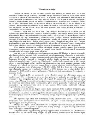 Wirusy nie istnieją! Zdaję sobie sprawę, że tytuł nie mówi prawdy. Jego zadanie jest jednak inne - ma przede wszystkim zwrócić Twoją, szanowny Czytelniku, uwagę. I mam cichą nadzieję, że się udało. Mowa oczywiście o wirusach komputerowych, choć i w wypadku tych normalnych, biologicznych był ponoć przypadek porównywalny do mojej obecnej sytuacji. Nie przytoczę niestety szczegółów, ponieważ moja zawodna pamięć nie podaje mi nawet nazwisk. Słyszałem taką historyjkę: znalazł się człowiek, naukowiec, który po ogłoszeniu odkrycia bakterii oświadczył, że nie wierzy w ich istnienie. Na dowód czego publicznie wypił zawartość fiolki z zarazkami cholery (czy na pewno była to cholera, też nie pomnę, nawet nie mam pewności czy zarazki cholery to bakterie). I rzeczywiście, nie zachorował. Niemniej, moja teza jest nieco inna. Otóż istnieniu komputerowych robaków czy też trojanów zaprzeczyć nie sposób, zwłaszcza że użytkownikiem komputerów jestem już od dobrych kilkunastu lat. Przyczyna napisania niniejszego tekstu leży gdzie indziej. Od jakiegoś czasu bowiem zastanawiałem się nad wzmagającym zainteresowaniem mediów tematem bezpieczeństwa w internecie i bezpieczeństwa prywatnych komputerów. Media, jak to mają w zwyczaju, znacznie modyfikują opisywane treści, dodają ładunek emocjonalny i budują niepotrzebne mity. Ostatnią kroplę dolały do tego wszystkiego obejrzane kiedyś telewizyjne „Wiadomości”, przez co uczyniłem dwie rzeczy: uśmiałem się nieźle i zasiadłem wreszcie do napisania co o tym wszystkim myślę. Cóż, uważam po prostu, że problem zagrożenia różnego rodzaju wirusami jest po prostu przeceniany, proponowane zaś sposoby, w postaci coraz bardziej rozbudowanych programów zabezpieczających system, nie do końca właściwe. Ale jak to, spyta ktoś oburzony, to nie patrzysz na statystyki? I będzie to słuszne oburzenie, gdyż liczby mówią o wzroście ilości powstających rocznie/miesięcznie robaczków (a konkretnie odkrywanych przez firmy robiące oprogramowanie antywirusowe). Stosowne dane może sobie Szanowny Czytelnik wyczytać w internecie, choćby ładnie opracowane w dziale nowych technologii portalu Interia. Telewizyjne „Wiadomości” podały kiedyś nawet czas, w jaki sławne wirusy w ostatnich latach zdołały zainfekować zinformatyzowaną część naszego zielonego globu (pokazując przy okazji, na stosownej mapce, które to rejony należą do owej zinformatyzowanej części). I tak (podaję za tv, Wiadomości, 19:30, 04.01.2006, TVP 1; o ile się nie mylę, można w sieci obejrzeć), nieznany mi wcześniej „CodeRed” w 2001 dokonał tego w ciągu jednej doby; „Slammer” w 2003 zrobił to samo w pół godziny. Wiadomość iście zatrważająca. Przynajmniej w pierwszej chwili. Bo w drugiej, jeśliby się zastanowić, co to właściwie znaczy że jakiś region uznano za zainfekowany? Czy wystarczy, że wirus się tam pojawi, czy potrzeba aby zaatakował? I czy wystarczy 1 taki przypadek, czy też trzeba ich więcej? 1% zakażonych maszyn, 5% czy może jeszcze więcej? Sądzę, że nawet te najlepiej rozprzestrzeniające się robaki ujawniły się i zadziałały na relatywnie niewielkiej ilości komputerów, gdyż awaria pozostałej większości groziłaby załamaniem się funkcjonowania sieci, a tym samym blokowałaby możliwość dalszego rozprzestrzeniania się programu. Zresztą, w swoim nie za długim jeszcze życiu słyszałem tylko o jednym przypadku, gdy zagrożone było funkcjonowanie internetu jako całości. Działo się to bardzo dawno. Moja pamięć zawodna mówi, że jeszcze w pierwszej połowie lat dziewięćdziesiątych, a w każdym razie na długo zanim nasz piękny skrawek środkowo - wschodniej Europy na poważnie podpiął się do globalnej sieci. Do myślenia daje także fakt wzrastającej liczby użytkowników sieci - a tym samym zwiększenie ilości potencjalnych celów ataku oraz - jak sądzę - więcej znajduje się osób, które wpuszczają do sieci swoje wytwory. Dlatego też - myślę - spada jakość robaków. Wydaje mi się wręcz żenujące, jak prymitywne patenty są stosowane. Co gorsza, te prymitywne patenty działają - o czym donoszą zaaferowane stacje telewizyjne i internetowe portale. Żebym nie okazał się gołosłowny, posłużę się przykładem. Wspominane już „Wiadomości” zaczęły newsa od szkodnika, który rozsyłał się pod postacią e-maila (email to obecnie chyba najczęstszy sposób zakażenia) rzekomo wysłanego przez FBI. Telewizja spóźniła się tutaj o dobrych kilka tygodni, ale nieważne. Dostałem tego robaka, pierwotnie zresztą występującego w wersji CIA. Treść w rodzaju: „Odwiedzasz nielegalne strony. Znaleźliśmy twój IP[1] na iluś-tam nielegalnych adresach i teraz musisz nam odpowiedzieć na kilka pytań. Lista pytań znajduje się w załączniku”. Załącznikiem był plik zip. Choć wiedziałem, co tam znajdę, wiedziony ciekawością zajrzałem. I nie myliłem się: znalazłem plik .exe. Znaczy to, jeśli ktoś nie wie, plik wykonywalny. Program, na pewno zaś nie dokument zawierający tekst. Czyli typowy wirus dla idiotów (tak to nazywam). Jak włączysz to zadziała. Bardzo typowy robal, tyle że w ładnym opakowaniu. Od innych odróżnia go wyłącznie oryginalny tekst zachęcający do otwarcia załącznika. Bo gdyby nie interesujący temat i adres „nadawcy”, skasowałbym to to bez otwierania. Odbieram takich listów dziesiątki (istniejąca od ładnych kilku lat skrzynka, której adres jest w dodatku podawany często do publicznej wiadomości, jak tu, w NN, posiada dziwny magnetyzm, przyciągający coraz więcej spamu). To nawet dość przykre, że w przeraźliwej większości, żeby wirus zrobił ci coś złego MUSISZ go SAM SOBIE WŁĄCZYĆ. To przykre, jeśli popatrzeć, ilu ludzi nabiera się na najprostsze sztuczki. Och, tu dygresja, kolejny przykład: notka na Interii z 04.01.2006,
