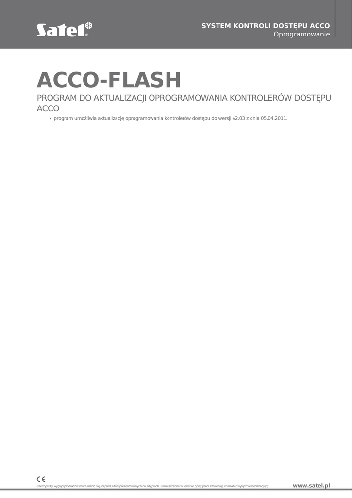 PoweredbyTCPDF(wwwct.pdo .frg) SYSTEM KONTROLI DOSTĘPU ACCO Oprogramowanie ACCO-FLASH PROGRAM DO AKTUALIZACJI OPROGRAMOWANIA KONTROLERÓW DOSTĘPU ACCO program umożliwia aktualizację oprogramowania kontrolerów dostępu do wersji v2.03 z dnia 05.04.2011. Rzeczywisty wygląd produktów może różnić się od produktów prezentowanych na zdjęciach. Zamieszczone w serwisie opisy produktówmają charakter wyłącznie informacyjny. www.satel.pl