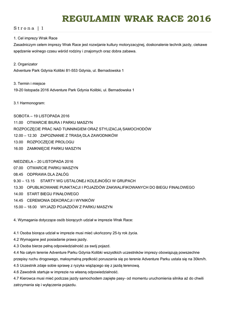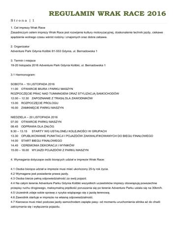 REGULAMIN WRAK RACE 2016 Strona |1 1. Cel imprezy Wrak Race Zasadniczym celem imprezy Wrak Race jest rozwijanie kultury motoryzacyjnej, doskonalenie technik jazdy, ciekawe spędzenie wolnego czasu wśród rodziny i znajomych oraz dobra zabawa. 2. Organizator Adventure Park Gdynia Kolibki 81-553 Gdynia, ul. Bernadowska 1 3. Termin i miejsce 19-20 listopada 2016 Adventure Park Gdynia Kolibki, ul. Bernadowska 1 3.1 Harmonogram: SOBOTA – 19 LISTOPADA 2016 11.00 OTWARCIE BIURA I PARKU MASZYN ROZPOCZĘCIE PRAC NAD TUNNINGIEM ORAZ STYLIZACJĄ SAMOCHODÓW 12.00 – 12.30 ZAPOZNANIE Z TRASĄ DLA ZAWODNIKÓW 13.00 ROZPOCZĘCIE PROLOGU 16.00 ZAMKNIĘCIE PARKU MASZYN NIEDZIELA – 20 LISTOPADA 2016 07.00 OTWARCIE PARKU MASZYN 08.45 ODPRAWA DLA ZAŁÓG 9.30 – 13.15 STARTY WG USTALONEJ KOLEJNOŚCI W GRUPACH 13.30 OPUBLIKOWANIE PUNKTACJI I POJAZDÓW ZAKWALIFIKOWANYCH DO BIEGU FINAŁOWEGO 14.00 START BIEGU FINAŁOWEGO 14.45 CEREMONIA DEKORACJI I WYNIKÓW 15.00 – 18.00 WYJAZD POJAZDÓW Z PARKU MASZYN 4. Wymagania dotyczące osób biorących udział w imprezie Wrak Race: 4.1 Osoba biorąca udział w imprezie musi mieć ukończony 25-ty rok życia. 4.2 Wymagane jest posiadanie prawa jazdy. 4.3 Osoba bierze pełną odpowiedzialność za swój pojazd. 4.4 Na całym terenie Adventure Parku Gdynia Kolibki wszystkich uczestników imprezy obowiązują powszechne przepisy ruchu drogowego, maksymalną prędkość poruszania się po terenie Adventure Parku ustala się na 30km/h. 4.5 Uczestnik zdaje sobie sprawę z ryzyka wiążącego się z jazdą terenową. 4.6 Zawodnik startuje w imprezie na własną odpowiedzialność. 4.7 Kierowca musi mieć podczas jazdy samochodem zapięte pasy- od momentu uruchomienia silnika aż do chwili zatrzymania się i wyłączenia pojazdu. REGULAMIN WRAK RACE 2016 Strona |2 4.8 Podczas przebywania w samochodzie obowiązuje kask z ochroną szczęki. Zaleca się także stosowanie systemów ochrony szyi, kręgosłupa, kombinezonów trudnopalnych. 5. Wymagania dotyczące aut, jadących w zawodach Wrak Race: 5.1 Pojazd biorący udział w imprezie musi mieć powyżej 15-stu lat. 5.2 Nadwozie pojazdu musi być zamknięte. 5.3. Do rywalizacji dopuszczone są pojazdy samochodowe osobowe o seryjnej konstrukcji i fabrycznie przystosowane do napędu na jedną oś. 5.4 Samochód musi posiadać: 5.4.1. całą przednią szybę ze szkła bezpiecznego oraz lewą szybę, ewentualnie siatkę drucianą z oczkami max 1 cm x 1 cm w miejsce lewej szyby. 5.4.2. fotel kierowcy oryginalny bądź podobny, trwale zamocowany do podłogi oraz pas bezpieczeństwa. Dopuszcza się fotele kubełkowe oraz pasy szelkowe 5.4.3. Sprawny układ hamulcowy i kierowniczy, 5.4.4. układ wydechowy lub jego fragment powodujący zmniejszenie hałasu do max 100 dB przy 3 000 obrotów silnika, mierzone w odległości 1 m od pojazdu na wysokości 0,5 m od podłoża 5.4.5. ogumienie w rozmiarze oryginalnym zalecanym dla modelu samochodu, bądź ogumienie w rozmiarze max 20 % większym, o rzeźbie bieżnika szosowej, zimowej, all terrain 5.4.6. Silnik oryginalny bądź podobny o pojemności nie większej niż właściwa dla danego modelu. modyfikacje silnika nie są dozwolone. 5.4.7. Oryginalny zbiornik paliwa, bądź inny zbiornik trwale zamontowany, szczelny i nie powodujący zagrożenia wycieku paliwa bądź zniszczenia podczas jazdy bądź kolizji 5.4.8. Akumulator musi być zamocowany w pojeździe trwale za pomocą jarzma metalowego bądź pasa transportowego. 5.4.9. Zawieszenie oryginalne. Dopuszcza się dowolne modyfikacje zawieszenia poprzez wymianę sprężyn, amortyzatorów itp. 5.4.10. gaśnica o masie min 1 kg umieszczona wewnątrz pojazdu w odległości max 1 m od obrysu fotela kierowcy w miejscu pozwalającym na łatwy dostęp 5.6 Pojazd nie może mieć: 5.6.1 Wzmocnionych zderzaków w postaci wspawanych rur, kątowników itp. wystających poza obrys samochodu, przy czym przez obrys pojazdu rozumie się oryginalny kształt i wymiar pojazdu wg oryginalnych zderzaków. 5.6.2 Wzmocnień i osłon podwozia powyżej poziomu równego wysokości 75 % przedniego koła ponad powierzchnią ziemi. 5.6.3 Opon kołkowanych, rolniczych, mud terrain, łańcuchów, kolców itp. 5.6.4 Zauważalnych wycieków oleju, płynu hamulcowego i chłodniczego. 5.6.5 Zbędnych elementów wyposażenia nie zamocowanych trwale wewnątrz bądź na zewnątrz pojazdu. 5.6.7. Wszelkie elementy dodatkowe o masie powyżej 2 kg muszą być przytwierdzone do nadwozia samochodu stalową linką. REGULAMIN WRAK RACE 2016 Strona |3 5.7. Dopuszczenie pojazdu Ostateczną decyzję o dopuszczeniu pojazdu do startu podejmuje Sędzia Techniczny. Sędzia techniczny, po przeprowadzeniu Badania Technicznego może przekazać kierowcy listę niezgodności z regulaminem i o ile w wyznaczonym czasie niezgodności te zostaną usunięte, pojazd zostanie dopuszczony do startu. 6. Zasady rywalizacji obejmują: 6.1 Po przejeździe prologu zostaje ustalona kolejność ustawienia się aut na starcie. 6.2 Każda z grup startuje w trzech wyścigach o podanych w tabeli godzinach: Godziny startów: Grupa 1: 9.30, 10.45, 12.00 Grupa 2: 9.55, 11.10, 12.25 Grupa 3: 10.20, 11.35, 12.50 Bieg finałowy - godzina 14.00 6.3 W biegu finałowym biorą udział auta, które w swoich grupach zajęły pierwsze pięć miejsc. 6.3.1 Przewidywana ilość aut startujących w biegu finałowym – 15 szt. 6.3.2 Klasyfikacja końcowa zwycięzców Wrak Race ustalana jest wyłącznie na podstawie biegu finałowego. 6.3.3 Kolejność aut na linii startu biegu finałowego ustalana jest na podstawie czasu osiągniętego podczas prologu. 6.4 Każdy przejazd trwa 15 minut. W tym czasie zawodnik musi pokonać jak największą ilość okrążeń toru. 6.4.1. W przypadku przestojów w rywalizacji, związanych z zatorem na trasie sędzia może przedłużyć bieg o czas trwania zatoru, nie dłużej jednak niż do 20 minuty. 6.4.2. Każdy bieg kończy sędzia główny przy pomocy flagi z szachownicą. 6.4.3. W przy