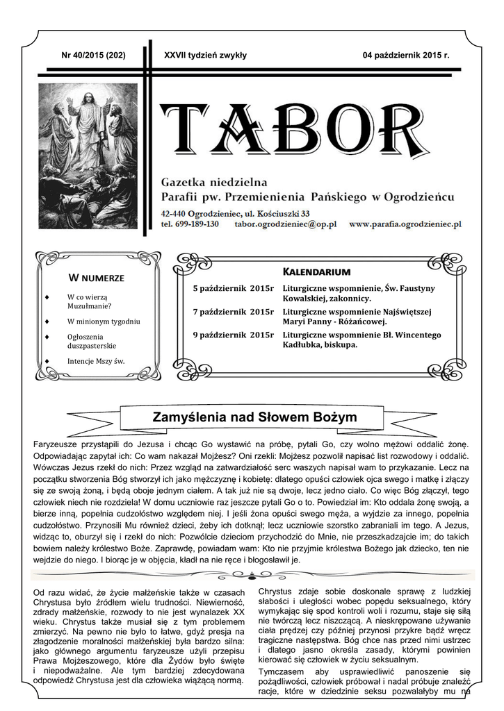 Nr 40/2015 (202) W numerze W co wierzą Muzułmanie? W minionym tygodniu Ogłoszenia duszpasterskie XXVII tydzień zwykły 04 październik 2015 r. Kalendarium 5 październik 5r Liturgiczne wspomnienie, Św. Faustyny Kowalskiej, zakonnicy. 7 październik 5r Liturgiczne wspomnienie Najświętszej Maryi Panny - Różańcowej. 9 październik 5r Liturgiczne wspomnienie Bł. Wincentego Kadłubka, biskupa. Intencje Mszy sw. Zamy lenia nad Słowem Bożym Żaryzeusze przystąpili do Jezusa i chcąc żo wystawić na próbę, pytali żo, czy wolno mę owi oddalić onę. Odpowiadając zapytał ichŚ Co wam nakazał Moj esz? Oni rzekliŚ Moj esz pozwolił napisać list rozwodowy i oddalić. Wówczas Jezus rzekł do nichŚ Przez wzgląd na zatwardziało ć serc waszych napisał wam to przykazanie. Lecz na początku stworzenia Bóg stworzył ich jako mę czyznę i kobietęŚ dlatego opu ci człowiek ojca swego i matkę i złączy się ze swoją oną, i będą oboje jednym ciałem. A tak ju nie są dwoje, lecz jedno ciało. Co więc Bóg złączył, tego człowiek niech nie rozdziela! W domu uczniowie raz jeszcze pytali żo o to. Powiedział imŚ Kto oddala onę swoją, a bierze inną, popełnia cudzołóstwo względem niej. I je li ona opu ci swego mę a, a wyjdzie za innego, popełnia cudzołóstwo. Przynosili Mu równie dzieci, eby ich dotknąłś lecz uczniowie szorstko zabraniali im tego. A Jezus, widząc to, oburzył się i rzekł do nichŚ Pozwólcie dzieciom przychodzić do Mnie, nie przeszkadzajcie imś do takich bowiem nale y królestwo Bo e. Zaprawdę, powiadam wamŚ Kto nie przyjmie królestwa Bo ego jak dziecko, ten nie wejdzie do niego. I biorąc je w objęcia, kładł na nie ręce i błogosławił je. Od razu widać, e ycie mał eńskie tak e w czasach Chrystusa było ródłem wielu trudno ci. Niewierno ć, zdrady mał eńskie, rozwody to nie jest wynalazek XX wieku. Chrystus tak e musiał się z tym problemem zmierzyć. Na pewno nie było to łatwe, gdy presja na złagodzenie moralno ci mał eńskiej była bardzo silnaŚ jako głównego argumentu faryzeusze u yli przepisu Prawa Moj eszowego, które dla ydów było więte i niepodwa alne. Ale tym bardziej zdecydowana odpowied Chrystusa jest dla człowieka wią ącą normą. Chrystus zdaje sobie doskonale sprawę z ludzkiej słabo ci i uległo ci wobec popędu seksualnego, który wymykając się spod kontroli woli i rozumu, staje się siłą nie twórczą lecz niszczącą. A nieskrępowane u ywanie ciała prędzej czy pó niej przynosi przykre bąd wręcz tragiczne następstwa. Bóg chce nas przed nimi ustrzec i dlatego jasno okre la zasady, którymi powinien kierować się człowiek w yciu seksualnym. Tymczasem aby usprawiedliwić panoszenie się po ądliwo ci, człowiek próbował i nadal próbuje znale ć racje, które w dziedzinie seksu pozwalałyby mu na wszystko. Nie mo na więc tym racjom zbytnio ufać. Dlatego Chrystus odwołuje się nie do zasad ludzkich, lecz do prawa Bo ego, zapisanego w samej naturze człowieka i w przykazaniach. Co zatem mówi Chrystus na temat mał eństwa? Jest ono dziełem Boga, planowo zamierzonym i wspartym rozmaitymi wła ciwo ciami ludzkiej natury. Najwa niejsza z nich to zró nicowanie płciowe człowieka. Mę czyzna i kobieta ró nią się od siebie w zasadniczy sposób. Są to ró nice stałe i rzeczywiste, a nie tylko wynikające chwilowo ze zmiennej mody czy obyczajów społecznych. Próby emancypacji czyli zrównania ról mę czyzn i kobiet, przypominają wysiłki na rzecz ujednolicenia ycia ryb i ptaków – są tragicznym nieporozumieniem. Albowiem wrodzone cechy mę czyzny i kobiety w naturalny sposób predestynują ich do okre lonych funkcji i zadań. Czym innym jest oczywi cie równo ć w godno ci ludzkiej i prawach osoby. Zasada, którą wprowadził Chrystus, zrównując wagę grzechu cudzołóstwa mę a i ony, była w owych czasach prawdziwą rewolucją. Dotąd bowiem odpowiedzialno cią za zdradę mał eńską obcią ano w zdecydowanej większo ci kobietę. Mę czyzna był na ogół niewinny i nietykalny. Tu, w dziedzinie moralno ci, jest miejsce na równouprawnienie, a nie w dziedzinie obowiązków i zadań rodzinnych. W przeciwnym razie wrócą absurdalne czasy traktorzystek i ojców na urlopach macierzyńskich. Skrajnym przejawem współczesnego lekcewa enia ludzkiej natury i mał eństwa, są „rodziny” jednopłciowe. Zadziwiające, jak szybko homoseksuali ci i lesbijki narzucili zdrowym ludziom swój chory punkt widzenia i uzurpowali sobie prawo do wychowywania dzieci w zupełnie wypaczonych warunkach! Tak e lu ne związki, bez adnych zobowiązań, gwarancji trwało ci i wzajemnej odpowiedzialno ci, nie zapewniają dziecku niezbędnego do prawidłowego rozwoju poczucia bezpieczeństwa. Być mo e taki styl ycia zapewnia dora ną wygodę i maksimum przyjemno ci, ale za to bardzo powierzchownej i krótkotrwałej. Bóg chce dla nas czego więcej. Chce, aby prawdziwa i pełna miło ć mę czyzny i kobiety, mę a i ony, była ródłem trwałego szczę cia i dobrym rodowiskiem wychowania dzieci. Wła nie dlatego w odpowiednim czasie trzeba zerwać dotychczasowe związki z rodzicami, by bez zbędnego balastu zało yć nową rodzinę. Równolegle trzeba budować nowe więzi, łączące ci le mę a i onę, umo liwiające pełne zaufanie, porozumienie i zgodne ycie. Dopiero na tym fundamencie mo na budować udane ycie intymne i powoływać do istnienia dzieci – owoc mał eńskiej miło ci. Tego chce dla nas Bóg. Dopóki człowiek ufa Bogu i chce realizować Jego plan, dotyczący miło ci, mał eństwa i rodzicielstwa, wszystko jest w porządku i rozwody są zbędne. Problemy zaczynają się wtedy, gdy człowiek próbuje być mądrzejszy od Boga i robić po swojemu. Ks. Mariusz Pohl W CO WIERZĄ MUZUŁMANIE? Arabskie słowo islam, wbrew obiegowym opiniom, ma niewiele wspólnego ze słowem salam – pokój. Wywodzi się z arabskiego słowa aslama, a które oznacza poddawać się, podporządk