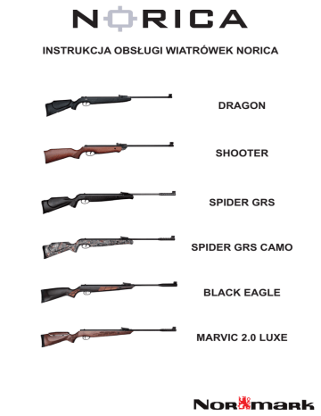 INSTRUKCJA OBSŁUGI WIATRÓWEK NORICA DRAGON SHOOTER SPIDER GRS SPIDER GRS CAMO BLACK EAGLE MARVIC 2.0 LUXE GWARANCJA DATA PODPIS KLIENTA Zapoznałem się i akceptuje warunki gwarancji, konserwacji i użytkowania pieczątka sklepu MODEL NR FABRYCZNY DATA SPRZEDAŻY NR WARUNKI GWARANCJI GWARANCJA 11. Szczegółowe uprawnienia Klienta określa: ustawa z dnia 23 kwietnia 1964 r. – Kodeks cywilny (Dz. U. nr 16, poz. 93 z późn. zm.) oraz ustawa z dnia 27 lipca 2002 r. o szczególnych warunkach sprzedaży konsumenckiej oraz o zmianie Kodeksu Cywilnego (Dz. U. nr 141, poz. 1176) 10. Gwarancja na sprzedany towar konsumpcyjny nie wyłącza, nie ogranicza ani nie zawiesza uprawnień kupującego, wynikających z niezgodności towaru z umową 9. Decyzja Normark Polska dotycząca zasadności zgłaszanych usterek jest decyzją ostateczną. b. wadliwe działanie lub uszkodzenie spowodowane niewłaściwym użytkowaniem, niedbałością Klienta lub używaniem urządzenia niezgodnie z instrukcją obsługi albo przepisami bezpieczeństwa a. wypadki zaistniałe podczas transportu i przeładunku oraz wywołane tym uszkodzenia 8. Gwarancją nie są objęte: 7. Wymiany sprzętu dokonuje punkt gdzie produkt został zakupiony 6. Użytkownikowi przysługuje prawo do wymiany na nowy egzeplarz po stwierdzeniu przez serwis nieusuwalnej wady fabrycznej 5. Jakiekolwiek zmiany w karcie gwarancyjnej, jej zniszczenie lub zagubienie powoduje utratę praw do gwarancji 4. Podstawą rozpatrzenia gwaracji jest dostarczenie sprzętu wraz z poprawnie wypełnioną kartą grarancyjną oraz dowodem zakupu 3. Wady i uszkodzenia powstałe z winy producenta będą usuwane w ciągu 30 dni od daty przyjęcia do punktu serwisowego 2. Gwarancja obowiązuje na terenie Polski 1. Firma Normark udziela gwarancji na produkty Norica na okres 12 miesięcy od daty zakupu. NR PUNKT SERWISOWY NORICA - SKLEP 4,5MM Al. Solidarności 129/131 Warszawa WYŁĄCZNY DYSTRYBUTOR NA TERENIE POLSKI pieczątka sklepu MODEL NR FABRYCZNY DATA SPRZEDAŻY Oddajemy do Państwa dyspozycji wysokiej klasy karabinek pneumatyczny. Prosimy o zapoznanie się z podstawowymi zasadami jego użytkowania. ZASADY BEZPIECZEŃSTWA Karabinek można używać tylko w warunkach nie stwarzających niebezpieczeństwa dla osób, zwierząt lub mienia. Karabinek przenosimy i przechowujemy zawsze rozładowany Nie celujemy w osoby lub zwierzęta bez względu na to czy karabinek jest naładowany czy rozładowany Odbezpieczamy karabinek i kładziemy palec na spust tuż przed oddaniem strzału Nie przenosimy karabinka z palcem na spuście Karabinek ładujemy jedynie śrutem przeznaczonym do tego celu w kalibrze wskazanym przez producenta Lufę trzymamy skierowaną w kierunku ziemi zarówno podczas ładowania, jak i przenoszenia karabinu. Nie naciskamy spustu, gdy komora ładowania jest otwarta. W przypadku zaistnienia usterki należy skontaktować się z autoryzowanym serwisem. W przypadku podwójnego załadowania karabinka śrutem należy skontaktować się z serwisem. Dzieci poniżej 16 troku życia mogą strzelać pod nadzorem osoby dorosłej. Producent i dystrybutor nie biorą odpowiedzialności za karabinki, w których wprowadzono zmiany techniczne poza autoryzowanym serwisem. 3 LEGISLACJA Zgodnie z zapisami Ustawy o Broni i Amunicji z dnia 21 maja 1999 roku, karabinki pneumatyczne o energii wylotowej poniżej 17J, nie podlegają obowiązkowi rejestracji oraz posiadania pozwolenia na broń. Energia wylotowa Państwa karabinka wynosi 16J. W komplecie z karabinkiem otrzymaliście Państwo zaświadczenie sygnowane przez firmę Normark, poświadczające energię wylotową. Proszę je nosić razem z karabinkiem. INSTRUKCJA OBSŁUGI CZĘŚCI KARABINKA: GWARANCJA FIRMY NORICA Produkty firmy NORICA objęte są gwarancją producenta przez okres 1 roku od daty zakupu. W przypadku wady fabrycznej produktu, może zostać on zwrócony do naszego dystrybutora lub sprzedawcy wraz ze szczegółowym opisem defektu, dowodem zakupu oraz wszelkimi akcesoriami. W momencie dostarczenia produktu, dystrybutor lub sprzedawca przekaże go firmie NORICA w celu naprawy lub w razie potrzeby wymiany. Gwarancja jest nieważna w przypadku otwarcia produktu, uszkodzenia mechanicznego w wyniku niewłaściwego użytkowania, zmiany produktu, jego naprawy przez osoby trzecie, użytkowania niezgodnego z przeznaczeniem. Gwarancja nie obejmuje szkód spowodowanych przez wypadki i klęski żywiołowe, takie jak pożary, powodzie, trzęsienia ziemi oraz wandalizm i kradzież. 4 1. muszka 2. wylot lufy 3. lufa 4. regulowana szczerbinka 5. bezpiecznik 6. język spustowy 7. śruba regulacji (wybrane modeli) 8. chwyt 9. stopka 10.baka policzkowa 11.kolba 12.stoper montażu 13.szyna montażowa pod urządzenia celownicze 14.ramię dźwigni ładowania sprężyny (wybrane modele) 5 Zerowanie wiatrówki Termin zerowanie wiatrówki oznacza procedurę, podczas której zestrajamy otwarte przyrządy celownicze: (muszkę i szczerbinkę) tak by karabinek trafiał powtarzalnie w cel na konkretnej odległości. Z reguły karabinki zeruje się na jednym z podanych dystansów: 10, 25, 40 i 50 metrów. Zależy to od preferencji użytkownika. Nasze karabiny, opuszczają fabrykę, wyregulowane do dystansu 10-metrów. Gdy strzelec chce zmienić tę odległość, musi postępować w następujący sposobów: •ustawiamy cel na odpowiednim dystansie •przy krótszym dystansie, stopniowo podnosimy szczerbinkę •poprzez obrót śruby umieszczonej na górze szczerbinki. •obracamy ją w kierunku przeciwnym do ruchu wskazówek •zegara, •przy dłuższym dystansie, stopniowo obniżamy szczerbinkę •poprzez obrót śruby umieszczonej na górze szczerbinki; obracamy ją zgodnie z ruchem wskazówek zegara, •po każdym obrocie wykonujemy strzał kontrolny w celu •oceny wielkości niezbędnej poprawki •aby skorygować tor strzału na prawo, należy obrócić śrubę •umieszczoną z boku szczerbinki; śrubę obracamy w kierunku •przeciwnym d
