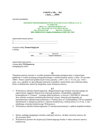 UMOWA NR... /RZ z dnia.......2009r zawarta pomiędzy: MIEJSKIM PRZEDSIĘBIORSTWEM OCZYSZCZANIA SPÓŁKA Z O. O. W TORUNIU PRZY UL. GRUDZIĄDZKIEJ 159 TEL. 056 63 98 119; FAX. 056 63 98 120 NIP: 879-016-92-80 REGON: 870525973 KRS: 0000151221; Kapitał Zakładowy 8.469 5 00 PLN reprezentowanym przez: 1. .................................................................................. 2. ................................................................................. zwanym dalej Zamawiającym a firmą: ............................................................................................ NIP: ................ REGON: ............... KRS: ………………………… Kapitał Zakładowy ………………………. reprezentowaną przez: ................................................................................. zwaną dalej Wykonawcą następującej treści: §1 Niniejszą umowę zawarto w wyniku przeprowadzonego postępowania o zamówienie publiczne w trybie przetargu nieograniczonego z zastosowaniem ustawy z dnia 29 stycznia 2004 r. Prawo zamówień publicznych (Tekst jednolity z 2007 r. Dz. U. Nr 223, poz. 1655 z późń. zm.), zgodnie ze specyfikacją istotnych warunków zamówienia oraz złoŜoną ofertą, które to dokumenty stanowią integralną część niniejszej umowy. §2 1. Wykonawca udziela Zamawiającemu długoterminowego kredytu inwestycyjnego na zapewnienie ciągłości finansowej realizacji projektu „Gospodarka odpadami komunalnymi w Toruniu” zwanego dalej kredytem, w kwocie 2 869 000 zł. (słownie: dwa miliony osiemset sześćdziesiąt dziewięć tysięcy złotych) pod hipotekę na nieruchomości zabudowanej połoŜonej w Toruniu przy ul. Grudziądzkiej 159 na zasadach określonych w niniejszej umowie i umowie kredytowej, o której mowa w § 9 ust. 5, bez odrębnego wniosku kredytowego Wykonawcy. 2. Wykonawca udziela Zamawiającemu 12 miesięcznej karencji w spłacie kapitału kredytu. §3 1. Strony ustalają następujące terminy realizacji umowy: od daty zawarcia umowy do 30 września 2019. 2. Wykonawca postawi do dyspozycji Zamawiającego kredyt w dniu zawarcia umowy kredytowej. 1. 2. 3. 4. 5. 6. 7. §4 Koszt przedmiotu umowy zgodnie z przyjętą ofertą wynosi: .................................................. zł/netto słownie: ........................................................................... Spłata miesięcznych rat kredytu będzie następowała zgodnie z harmonogram spłat, który stanowi integralną część umowy kredytowej. Strony ustaliły, Ŝe kalkulacja rat kredytowych jest obliczona przez Wykonawcę przy zastosowaniu zmiennego kosztu pieniądza przy stawce WIBOR6M z dnia 20/08/2009 Stopa procentowa uwzględnia niezmienną w czasie trwania umowy marŜę Wykonawcy w wysokości.................%. Zmiana stawki WIBOR 6M następować będzie w okresach sześciomiesięcznych, co skutkować będzie zmianą wysokości odsetek od kredytu. Zmiana dotyczyć moŜe jedynie pozostałej do zapłaty kwoty zobowiązania. W przypadku zaistnienia sytuacji, o której mowa w ust.4 Wykonawca jest zobowiązany do przedłoŜenia Zamawiającego nowego harmonogramu spłat kredytu. NaleŜną Wykonawcy prowizję w wysokości …………. zł Zamawiający zapłaci Wykonawcy jednorazowo w terminie …………… licząc od dnia zawarcia umowy. Zamawiający oświadcza, Ŝe jest płatnikiem podatku VAT zarejestrowanym pod numerem NIP: 879-016-92-80. §5 Zabezpieczeniem płatności Wykonawcy jest hipoteka na nieruchomości zabudowanej połoŜonej w Toruniu przy ul. Grudziądzkiej 159 wraz z cesją praw z polisy ubezpieczeniowej nieruchomości. §6 1. Nie zapłacenie przez Zamawiającego w terminie określonym w harmonogramie spłat raty kredytu spowoduje, Ŝe od następnego dnia nie spłacona kwota staje się zadłuŜeniem przeterminowanym. 2. Za kaŜdy dzień utrzymywania się zadłuŜenia przeterminowanego Wykonawcy przysługują odsetki, które Wykonawca naliczy zgodnie z obowiązującą Wykonawcę tabelą opłat i prowizji. 3. W dniu zawarcia umowy oprocentowanie naleŜności przeterminowanych wynosi …………… % w stosunku rocznym. §8 Nie dopuszcza się cedowania praw i obowiązków Wykonawcy wynikających z niniejszej umowy na inny Bank. §9 1. Wszelkie zmiany umowy wymagają formy pisemnej pod rygorem niewaŜności. 2. Z zastrzeŜeniem §4 ust.3 i §9 ust.2 nie dopuszcza się zmian postanowień zawartej umowy w stosunku do treści oferty, na podstawie której dokonano wyboru Wykonawcy. 3. Zamawiający zastrzega sobie prawo do zmiany harmonogramu spłat polegającej na wydłuŜeniu okresu spłaty kredytu o uzgodniony przez strony okres w przypadku zagroŜenia płynności finansowej Zamawiającego spowodowanej niekorzystną sytuacją gospodarczą lub innymi zdarzeniami losowymi lub skróceniu terminu spłaty kredytu. 4. Strony zobowiązują się do natychmiastowego informowania o kaŜdej zmianie adresu i numeru telefonu. W razie niedopełnienia tego obowiązku wszelka korespondencja doręczona pod wskazany adres uwaŜana będzie za doręczoną. 5. Przed uruchomieniem kredytu Zamawiający zobowiązuje się do podpisania umowy kredytowej według wzoru obowiązującego u Wykonawcy. §10 1. W sprawach nie uregulowanych niniejszą umową mają zastosowanie przepisy Kodeksu Cywilnego, ustawy Prawo zamówień publicznych i Prawa Bankowego. 2. Spory mogące wyniknąć z realizacji umowy rozstrzygać będzie Sąd właściwy dla siedziby Zamawiającego. §11 Umowę sporządzono w dwu jednobrzmiących egzemplarzach po jednym ze dla kaŜdej ze stron. Wykonawca Zamawiający