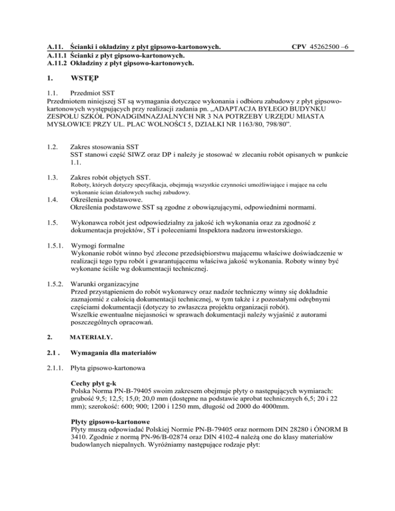 Przedmiotem niniejszej ST są wymagania dotyczące wykonania i odbioru zabudowy z płyt gipsowokartonowych występujących przy realizacji zadania pn. „ADAPTACJA BYŁEGO BUDYNKU