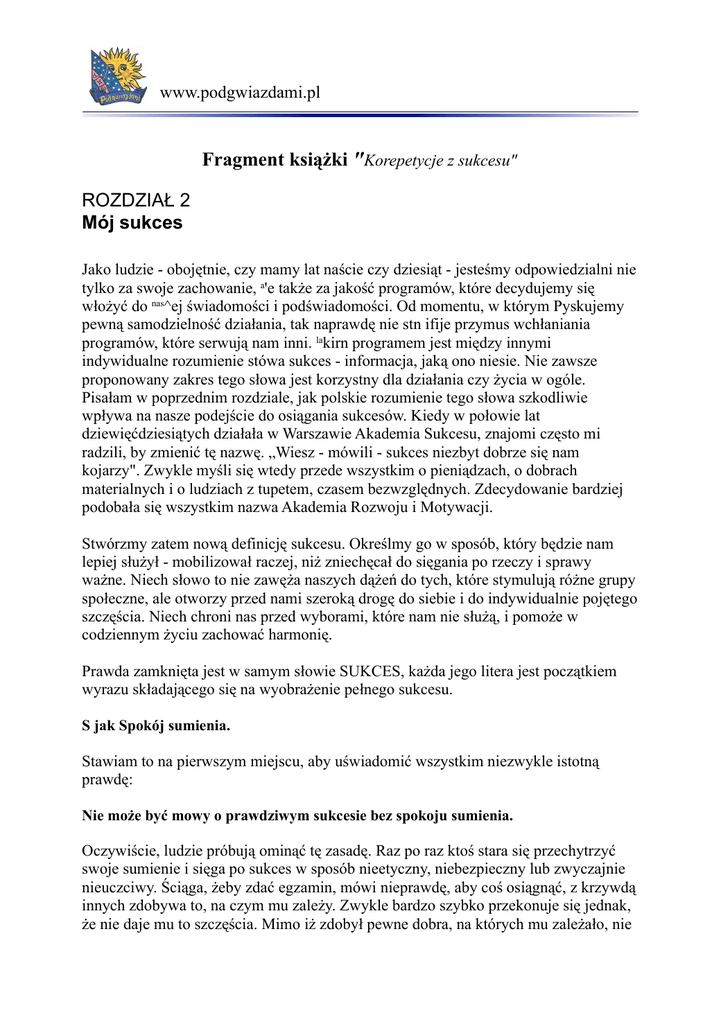 www.podgwiazdami.pl Fragment książki "Korepetycje z sukcesu" ROZDZIAŁ 2 Mój sukces Jako ludzie - obojętnie, czy mamy lat naście czy dziesiąt - jesteśmy odpowiedzialni nie tylko za swoje zachowanie, a'e także za jakość programów, które decydujemy się włożyć do nas^ej świadomości i podświadomości. Od momentu, w którym Pyskujemy pewną samodzielność działania, tak naprawdę nie stn ifije przymus wchłaniania programów, które serwują nam inni. lakirn programem jest między innymi indywidualne rozumienie stówa sukces - informacja, jaką ono niesie. Nie zawsze proponowany zakres tego słowa jest korzystny dla działania czy życia w ogóle. Pisałam w poprzednim rozdziale, jak polskie rozumienie tego słowa szkodliwie wpływa na nasze podejście do osiągania sukcesów. Kiedy w połowie lat dziewięćdziesiątych działała w Warszawie Akademia Sukcesu, znajomi często mi radzili, by zmienić tę nazwę. „Wiesz - mówili - sukces niezbyt dobrze się nam kojarzy". Zwykle myśli się wtedy przede wszystkim o pieniądzach, o dobrach materialnych i o ludziach z tupetem, czasem bezwzględnych. Zdecydowanie bardziej podobała się wszystkim nazwa Akademia Rozwoju i Motywacji. Stwórzmy zatem nową definicję sukcesu. Określmy go w sposób, który będzie nam lepiej służył - mobilizował raczej, niż zniechęcał do sięgania po rzeczy i sprawy ważne. Niech słowo to nie zawęża naszych dążeń do tych, które stymulują różne grupy społeczne, ale otworzy przed nami szeroką drogę do siebie i do indywidualnie pojętego szczęścia. Niech chroni nas przed wyborami, które nam nie służą, i pomoże w codziennym życiu zachować harmonię. Prawda zamknięta jest w samym słowie SUKCES, każda jego litera jest początkiem wyrazu składającego się na wyobrażenie pełnego sukcesu. S jak Spokój sumienia. Stawiam to na pierwszym miejscu, aby uświadomić wszystkim niezwykle istotną prawdę: Nie może być mowy o prawdziwym sukcesie bez spokoju sumienia. Oczywiście, ludzie próbują ominąć tę zasadę. Raz po raz ktoś stara się przechytrzyć swoje sumienie i sięga po sukces w sposób nieetyczny, niebezpieczny lub zwyczajnie nieuczciwy. Ściąga, żeby zdać egzamin, mówi nieprawdę, aby coś osiągnąć, z krzywdą innych zdobywa to, na czym mu zależy. Zwykle bardzo szybko przekonuje się jednak, że nie daje mu to szczęścia. Mimo iż zdobył pewne dobra, na których mu zależało, nie www.podgwiazdami.pl odczuwa głębokiej radości, a zdarza się nawet, że następstwa takich osiągnięć są wręcz tragiczne. W wyniku tego typu działań spada też samoocena wraz z poczuciem własnej wartości, co w efekcie blokuje potem własne, uczciwe osiągnięcia. Dla wielu ludzi spokój sumienia jest sukcesem samym w sobie. Nie zależy im na niczym prócz takiego spokoju. Większość jednak chce czegoś więcej, co jest zrozumiałe i godne pochwały. U jak Udane życie rodzinne. Większość ludzi, szczególnie kobiety i dziewczyny, stawia ten element pośród pierwszych trzech, składających się na sukces. I słusznie! Rodzina jest idealnym poligonem, na którym można ćwiczyć odpowiedzialność, dawanie i bezwarunkową miłość - istotne atrybuty prawdziwego człowieczeństwa. Zdrowa rodzina służy swoim członkom wsparciem w różnych poczynaniach, to zaś ułatwia sięganie po rzeczy wielkie. Jest ostoją, a jednocześnie odskocznią do działania. Pragnę tu jednak zaznaczyć, że rodzinę można rozumieć w różny sposób. Lansowane jako ideał 2+2, czy w ogóle jakakolwiek formuła z „plusem", nie może być modelem. Para bezdzietna jest rodziną. Dorosłe dzieci, żyjące wspólnie z rodzicami, są nią także. Można żyć w pełni, nie doświadczając naturalnego rodzicielstwa, i być szczęśliwym w pojedynkę. Chodzi o to, by mieć kogoś, na kogo naprawdę można liczyć, kogo można nazwać „rodziną". Powiedziałabym, że wyznacznikiem jest tu wspólnie zajmowane terytorium i odpowiedzialność, a nie więzy krwi czy urzędowe oświadczenia. K jak Kochana kariera zawodowa. Ten element również należy do najczęściej wymienianych, szczególnie przez mężczyzn i chłopców. Jest to ze wszech miar zrozumiale. Kariera zawodowa właściwie traktowana - jest olbrzymią szansą na samorealizację człowieka, samorealizacja zaś jest naszą najbardziej ludzką potrzebą. Jest ona tak istotna, iż niektórzy ludzie godzą się nawet zaspokajać niższe potrzeby* w minimalnym zaledwie wymiarze, jeśli wymaga tego możliwość samorealizacji. Mówiąc po prostu, jeśli praca daje im radość i poczucie spełnienia, godzą się z tym, że nie mają pewnych wygód czy luksusów dzisiejszego społeczeństwa. Znowu musimy sobie wyjaśnić, co rozumiemy przez karierę zawodową. Otóż chodzi tu po pierwsze o pracę dającą zadowolenie, po drugie - o pewien rozwój związany z tą pracą. Słowo „kariera" zaklada wzrost, czyli zmianę. Coś w naszym życiu zawodowym musi się zmieniać, byśmy wciąż doświadczali radości i poczucia życiowego sukcesu. www.podgwiazdami.pl Może to być coraz wyższe stanowisko, coraz bardziej wyzywające zadania, praca ciekawsza, wzbogacająca nas w jakiś sposób czy dająca coraz więcej środków finansowych. Nie można stać w miejscu, być wciąż tym samym urzędnikiem, robotnikiem czy profesjonalistą z tą samą wiedzą, pensją i rutyną wykonywanych zadań. Musimy wciąż się uczyć, rozwijać, wchodzić w tym, co robimy, na coraz wyższe poziomy mistrzostwa. Im wcześniej tym lepiej, bo na pewno więcej osiągniemy. Pamiętajmy jednak, że wybór tego, co chcemy robić, nie może być przypadkowy czy podyktowany jedynie koniunkturą na rynku pracy. Najważniejsze w karierze zawodowej jest to, by lubić swoją pracę. Bez tego nie ma mowy o prawdziwych sukcesach. Prawie jedną trzecią życia spędzamy w pracy - niech będzie to piękny rozdział naszego życia. Pamiętaj! Możesz wykonywać ka