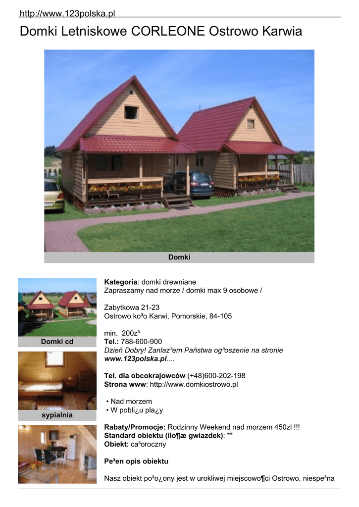 http://www.123polska.pl Domki Letniskowe CORLEONE Ostrowo Karwia Domki Kategoria: domki drewniane Zapraszamy nad morze / domki max 9 osobowe / Zabytkowa 21-23 Ostrowo ko³o Karwi, Pomorskie, 84-105 Domki cd min. 200z³ Tel.: 788-600-900 Dzieñ Dobry! Zanlaz³em Pañstwa og³oszenie na stronie www.123polska.pl.... Tel. dla obcokrajowców (+48)600-202-198 Strona www: http://www.domkiostrowo.pl sypialnia • Nad morzem • W pobli¿u pla¿y Rabaty/Promocje: Rodzinny Weekend nad morzem 450zl !!! Standard obiektu (ilo¶æ gwiazdek): ** Obiekt: ca³oroczny Pe³en opis obiektu Nasz obiekt po³o¿ony jest w urokliwej miejscowo¶ci Ostrowo, niespe³na http://www.123polska.pl salon 900 metrów od piaszczystej, szerokiej ba³tyckiej pla¿y. Komfort i spokójte dwa s³owa najlepiej oddaj± charakter naszych domków. Naszym klientom oferujemy nowe, wybudowane w 2008 roku, piêtrowe i komfortowo urz±dzone domki letniskowe, wyposa¿one w kuchniê z pe³nym wyposa¿eniem (sztuæce, szklanki, zastawa i garnki, kuchenka elektryczna + mikrofalowa), lodówkê i sprzêt pla¿owy. Na parterze znajduje siê salon z zestawem wypoczynkowym, jadalnia ze sto³em na 6 osób, kuchnia, telewizor oraz ³azienka z prysznicem. Na piêtrze dwie osobno zamykane sypialnie. W sypialni mniejszej 2 ³ó¿ka (jedynka + dwójka) w sypialni wiêkszej 3 ³ó¿ka (dwie jedynki i jedna dwójka). Dodatkowo istnieje mo¿liwo¶æ roz³o¿enia zestawu w salonie (spanie dla dwóch osób). Do dyspozycji go¶ci na du¿ym zadaszonym tarasie znajduj± siê wygodne ratanowe meble wypoczynkowe oraz grill.Posesja po³o¿ona jest w centrum miejscowo¶ci, jednak¿e z dala od zgie³ku i ha³asu, w enklawie domków letniskowych i niskiej zabudowy. W pobli¿u liczne restauracje, bary i sklep. Obiekt jest bezpieczny, teren jest ogrodzony i zamykany na noc, a miejsca parkingowe zlokalizowane s± na ogrodzonej posesji. Istnieje mo¿liwo¶æ parkowania bezpo¶rednio przy domkach. Dla maluchów przygotowali¶my mini plac zabaw (zje¿d¿alnia, piaskownica, dwie hu¶tawki, bujak i basenik). Do dyspozycji go¶ci równie¿ du¿e stanowisko do grillowania wraz z drewnianymi ³awami dla 12 osób, oraz wêdzarnia, w której przygotowaæ mo¿na dopiero co kupione u rybaka rybki. Na ¿yczenie sami przygotujemy wêdzone specja³y, które spo¿yte w go¶cinnej atmosferze sprawi±, ¿e Pañstwa pobyt stanie siê niezapomniany Oferowane pokoje: Ilo¶æ domków dwurodzinnych: 4 Cena za ca³o¶æ: Cena za dobê (za ca³o¶æ): 380 z³ Cena za miesi±c (za ca³o¶æ): 11400 z³ Ca³kowieta ilo¶c miejsc noclegowych: ok. 36 Cena za osobê (w SEZONIE): w domku dwurodzinnym: 45 z³ Cennik: inne Ceny za ca³y domek (max 9 osób): * Sezon niski (od 1 marca do 30 kwietnia i po 1 pa¼dziernika) - 180 z³/doba (cena zawiera koszty ogrzewania) * Sezon ¶redni (maj, czerwiec i wrzesieñ) - 200 z³/doba * Sezon wysoki (od 26 czerwca do koñca sierpnia) - 380 z³/doba http://www.123polska.pl * D³ugi weekend majowy i czerwcowy - 300 z³/doba * Dostawka w salonie – 30 z³/doba Doba hotelowa zaczyna siê o 15.00 w dniu przyjazdu i koñczy o 10.00 w dniu wyjazdu. lazienka Obowi±zuje zaliczka p³atna w ci±gu 7 dni od momentu dokonania rezerwacji. Resztê nale¿no¶ci rozliczamy w dniu przyjazdu z chwil± wydania kluczy do domku. W sezonie wysokim obowi±zuj± turnusy tygodniowe (lub wielokrotno¶æ) od soboty do soboty. Wy¿ywienie: • Mo¿liwo¶æ zorganizowania obiadów (w innym obiekcie) • Aneks kuchenny w pokojach/domkach lazienka cd jadalnia kuchnia wedzarnia Na terenie obiektu: • grill • miejsce na ognisko • plac zabaw • parking zabezpieczony (zamykany) Inne: wêdzarnia Pozosta³e: • wystawiamy faktury VAT • zakaz zabierania zwierz±t • mówimy po niemiecku • mówimy po rosyjsku • mówimy po hiszpañsku W KA¯DYM pokoju apartamencie domku: • toaleta • ³azienka • prysznic • aneks kuchenny • lodówka • czajnik elektryczny • garnki • podstawowe naczynia • sztuæce • telewizor • balkon W pobli¿u: do sklepu: 0,1 km do supermarketu / marketu: 5 km do morza: 0,9 km do pla¿y strze¿onej: 0,9 km do wypozyczalni sprzêtu wodnego: 12 km szlaki turystyczne: 1 km restauracje / kawiarnie / bary: 0,2 km s³u¿by medyczne: 12 km poczta: 2 km http://www.123polska.pl bank / bankomat: 0,2 km Internet Cafe: 2 km dworzec / przystanek PKS: 0,2 km dworzec PKP: 12 km