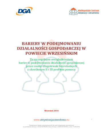 BARIERY W PODEJMOWANIU DZIAŁALNOŚCI GOSPODARCZEJ W POWIECIE WRZESIŃSKIM Ze szczególnym uwzględnieniem barier w podejmowaniu działalności gospodarczej przez osoby długotrwale bezrobotnych z określonym II i III profilem pomocy Wrzesień 2016 1 Świadczenie działań aktywizacyjnych dla osób długotrwale bezrobotnych na podstawie Umowy nr 63/2016/78CRU oraz Umowy nr 64/2016/79CRU z dnia 11.08.2016r. SPIS TREŚCI WPROWADZENIE .................................................................................................................................................... 3 PRZEDSIĘBIORCZOŚĆ POWIATU WRZESIŃSKIEGO .................................................................................... 4 PODMIOTY GOSPODARCZE ................................................................................................................................. 4 INSTYTUCJE OTOCZENIA BIZNESU ................................................................................................................... 9 BARIERY W ZAKŁADANIU I ROZWOJU PRZEDSIĘBIORSTW ................................................................ 10 PODSUMOWANIE ................................................................................................................................................. 12 2 Świadczenie działań aktywizacyjnych dla osób długotrwale bezrobotnych na podstawie Umowy nr 63/2016/78CRU oraz Umowy nr 64/2016/79CRU z dnia 11.08.2016r. WPROWADZENIE Sektor MSP we wszystkich rozwiniętych krajach ma wielki wpływ na rynek pracy oraz produkt krajowy i dochody budżetowe. W Unii Europejskiej około 23 mln małych i średnich firm zatrudnia około 67 proc. wszystkich pracowników sektora prywatnego i tworzy około 80 proc. wszystkich nowych miejsc pracy. Uważa się, że stan europejskiej (w tym również i polskiej) gospodarki w sposób szczególny zależy od tego, czy małe i średnie przedsiębiorstwa rozwiną swój potencjał. Stworzenie własnej firmy to między innymi stworzenie miejsca pracy dla siebie i innych, często znajomych, rodziny. Jednak prowadzenie działalności gospodarczej to nie tylko szereg zalet, ale także wad, a przed decyzją o zarejestrowaniu firmy towarzyszy szereg obaw. To, które z tych czynników przeważą zależy jedynie od chęci danej osoby do podjęcia się pewnych zobowiązań i do wprowadzenia zmian do swojego życia. Jednocześnie wiąże się z motywacją, czyli czymś, co popycha nas do działania, do podejmowania się, nie zawsze pewnych i jasnych zadań. W związku z powyższym celem opracowania było udzielenie odpowiedzi na pytanie o bariery, na jakie napotykają długotrwale bezrobotni z określonym II i III profilem w podejmowaniu działalności gospodarczej. Analizie zostanie również poddany poziom przedsiębiorczości w gminie Września oraz potencjał do lokowania nowych przedsiębiorstw. Opracowanie powstało w ramach Projektu: Wielkopolskie Centrum Aktywizacji i Zatrudnienia, realizowanego przez DGA S.A na zlecenie: Wojewódzkiego Urzędu Pracy w Poznaniu (Świadczenie działań aktywizacyjnych dla osób długotrwale bezrobotnych na podstawie Umowy nr 63/2016/78CRU oraz Umowy nr 64/2016/79CRU z dnia 11.08.2016r.) 3 Świadczenie działań aktywizacyjnych dla osób długotrwale bezrobotnych na podstawie Umowy nr 63/2016/78CRU oraz Umowy nr 64/2016/79CRU z dnia 11.08.2016r. PRZEDSIĘBIORCZOŚĆ POWIATU WRZESIŃSKIEGO Podmioty Gospodarcze Według danych GUS 2016 roku na terenie powiatu wrzesińskiego zarejestrowanych było 5 700 podmiotów gospodarczych ujętych w systemie REGON. Najdynamiczniejszy wzrost zaobserwowano na przestrzeni lat 2009–2013. Największą dynamikę wzrostu można było zaobserwować w gminie Nekla (15,8%), a najmniejszą w gminie Pyzdry (7,6%) Rysunek 1: Liczba podmiotów gospodarczych w gminach powiatu wrzesińskiego w latach 2010–2013 Źródło: Starostwo Powiatowe we Wrześni, Strategia rozwoju powiatu wrzesińskiego na lata 2014-2020 4 Świadczenie działań aktywizacyjnych dla osób długotrwale bezrobotnych na podstawie Umowy nr 63/2016/78CRU oraz Umowy nr 64/2016/79CRU z dnia 11.08.2016r. Najwięcej podmiotów gospodarczych znajduje się w gminie Września, co stanowi 68% wszystkich przedsiębiorstw w powiecie. Najmniej jest ich w gminie Kołaczkowo (5%). Największy udział w strukturze gospodarczej mają firmy z branży usługowej, w tym w szczególności z gminy Września (znajduje się tu 71% ogólnej liczby przedsiębiorstw z tej branży w powiecie). Najmniej jest jednostek gospodarczych z sektora rolnictwa, leśnictwa, łowiectwa i rybactwa, które stanowią 4% łącznej liczby podmiotów gospodarczych w powiecie. Poniższa tabela przedstawia szczegółowe zestawienie podmiotów według sekcji PKD 2007. Rysunek 2: Liczba podmiotów gospodarczych w gminach powiatu Wrzesińskiego wg. Sekcji PKD 2007 [STAN NA ROK 2013] Źródło: Starostwo Powiatowe we Wrześni, Strategia rozwoju powiatu wrzesińskiego na lata 2014-2020 Ponad 80% firm sektora prywatnego to osoby fizyczne prowadzące działalność gospodarczą, zarejestrowane na terenie powiatu. Poniższa tabela ilustruje sektory własnościowe podmiotów gospodarczych na terenie powiatu. Podmioty gospodarcze prowadzące działalność na terenie powiatu wrzesińskiego stanowią w 94,55% mikroprzedsiębiorstwa, zatrudniające do 9 pracowników. Przedsiębiorstwa małe, które zatrudniają od 10 do 49 pracowników, stanowią 4,73%. Natomiast przedsiębiorstwa duże to 0,05% wszystkich podmiotów gospodarczych. Duże firmy to przede wszystkim inwestorzy zagraniczni, którzy zatrudniają najwięcej osób. W latach 2009–2013 wysoką dynamikę wzrostu liczby 5 Świadczenie działań aktywizacyjnych dla osób długotrwale bezrobotnych na podstawie Umowy nr 63/2016/78CRU oraz Umowy nr 64/2016/79CRU z dnia 11.08.2016r. podmiotów gospodarczych można zauważyć na przykładzie, mikroprzedsiębiorstw, który wyniósł 10,3%. W tym samym okresie zanotowano spadek o 8