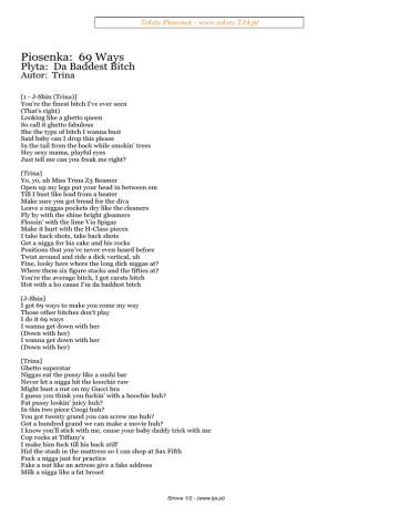 Teksty Piosenek - www.teksty.TJA.pl Piosenka: 69 Ways Płyta: Da Baddest Bitch Autor: Trina [1 - J-Shin (Trina)] You're the finest bitch I've ever seen (That's right) Looking like a ghetto queen So call it ghetto fabulous She the type of bitch I wanna bust Said baby can I drop this please In the tail from the back while smokin' trees Hey sexy mama, playful eyes Just tell me can you freak me right? [Trina] Yo, yo, uh Miss Trina Z3 Beamer Open up my legs put your head in between em Till I bust like lead from a heater Make sure you got bread for the diva Leave a niggas pockets dry like the cleaners Fly by with the shine bright gleamers Flossin' with the lime Via Spigas Make it hurt with the H-Class pieces I take back shots, take back shots Get a nigga for his cake and his rocks Positions that you've never even heard before Twist around and ride a dick vertical, uh Fine, looky here where the long dick niggas at? Where them six figure stacks and the fifties at? You're the average bitch, I got carats bitch Hot with a ho cause I'm da baddest bitch [J-Shin] I got 69 ways to make you come my way Those other bitches don't play I do it 69 ways I wanna get down with her (Down with her) I wanna get down with her (Down with her) [Trina] Ghetto superstar Niggas eat the pussy like a sushi bar Never let a nigga hit the koochie raw Might bust a nut on my Gucci bra I guess you think you fuckin' with a hoochie huh? Fat pussy lookin' juicy huh? In this two piece Coogi huh? You got twenty grand you can screw me huh? Got a hundred grand we can make a movie huh? I know you'll stick with me, cause your baby daddy trick with me Cop rocks at Tiffany's I make him fuck till his back stiff Hid the stash in the mattress so I can shop at Sax Fifth Fuck a nigga just for practice Fake a nut like an actress give a fake address Milk a nigga like a fat breast Strona 1/2 - (www.tja.pl) Teksty Piosenek - www.teksty.TJA.pl Till there ain't no cash left Shit I'm a bad bitch [Repeat 1] ***************************************** Polecamy Strony: www.opisy.tja.pl - Codzienie nowe opisy na GG www.rozmowki.tja.pl - Śmieszne Rozmówki www.tapeciarnia.pl - Mnustwo fajnych tapet na pulpit www.teledyski.tja.pl - Zawsze najnowsze teledyski www.lol2.pl - Śmieszne Filmiki, Kabarety www.wkinach.pl - Co jest grane w kinach ? Strona 2/2 - (www.tja.pl)
