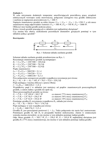 Zadanie 1. W celu utrzymania dodatnich temperatur umoŜliwiających prawidłową pracę urządzeń elektrycznych wewnątrz szafy sterowniczej, połączono szeregowo trzy grzałki elektryczne i zasilono je napięciem przewodowym Up = 440 V. Napięcia znamionowe grzałek są sobie równe: U1N = U2N = U2N = UN =230 V, a ich moce znamionowe mają odpowiednio wartości: P1N = 500 W, P2N = 750 W, P3N = 1000 W. Obliczyć moc kaŜdej grzałki podczas pracy. Która z trzech grzałek pracujących w układzie jest najbardziej obciąŜona? Czy moŜna bez obawy uszkodzenia pozostałych elementów grzejnych pominąć w tym układzie jedną z grzałek? Rozwiązanie: Rys. 1 Schemat układu zasilania grzałek Schemat układu zasilania grzałek przedstawiono na Rys. 1. Rezystancje znamionowe grzałek są następujące: R1 = U1N2/P1N = 2302/500 = 105,8 Ω R2 = U2N2/P2N = 2302/500 = 70,5 Ω R3 = U3N2/P3N = 2302/500 = 52,9 Ω Prądy znamionowe: I1N = P1N/U1N = 500/230 = 2,1 A I2N = P2N/U2N = 750/230 = 3,3 A I3N = P3N/U3N = 1000/230 = 4,3 A Przy połączeniu szeregowym grzałek wypadkowa rezystancja jest równa: R123 = R1 + R= + R3 = 105, 8 + 70,5 + 52,9 = 229,2 Ω Prąd zasilający I moŜna obliczyć z prawa Ohma: I = Up/R123 = 440/229,2 = 1,9 A Wypadkowy prąd I w układzie jest mniejszy od prądów znamionowych poszczególnych grzałek, a zatem Ŝadna z grzałek nie spali się. Moce poszczególnych grzałek są równe: P1 = I2·R1 = 1,92·105,8 = 385,7 W co stanowi 77% mocy znamionowej P1N 2 2 P2 = I ·R2 = 1,9 ·70,5 = 256,5 W co stanowi 34% mocy znamionowej P2N P3 = I2·R3 = 1,92·52,9 = 193,8 W co stanowi 19% mocy znamionowej P3N Pomijając grzałkę R3 rezystancja wypadkowa R12 układu jest równa: R12 = R1 + R2 = 105,8 + 70,5 = 176,3 Ω Prąd zasilający w tym wypadku jest równy: Ix = Up/R12 = 440/176,3 = 2,5 A Grzałka R1 jest przeciąŜona poniewaŜ Ix > I1N. Takie połączenie nie moŜe być zastosowane. Pominięcie grzałki R2 lub R3 to przypadek bardzie niekorzystny. Zatem w ostatecznym wniosku moŜna stwierdzić, ze nie moŜna w tym układzie pominąć Ŝadnej grzałki. Odp: Moce grzałek: P1 = 385,7 W, P2 = 256,5 W, P3 = 193,8 W, najbardziej obciąŜona jest grzałka R1 (77% mocy znamionowej), nie moŜna w tym układzie pominąć Ŝadnej grzałki. Zadanie 2 W układzie jednostopniowego wzmacniacza tranzystorowego przedstawionego na Rys.1 obliczyć prąd kolektora ICQ i napięcie kolektor – emiter UCEQ, w punkcie pracy Q tranzystora Q1. Na płytce zmontowanego obwodu drukowanego zidentyfikowano elementy wzmacniacza i odczytano następujące dane dotyczące rezystorów: RB = 332k, RC = 3k9, moc strat 125 mW. Napięcie zasilające układ UZ = 12 V. Do obliczeń przyjąć, Ŝe statyczny współczynnik wzmocnienia prądowego β0 oraz napięcie baza-emiter UBE w punkcie pracy Q tranzystora są odpowiednio równe β0Q = 100 i UBEQ = 0,65 V. Rys.1. Schemat prostego wzmacniacza tranzystorowego Rozwiązanie: Rys. 2. Rozkład napięć i rozpływ prądów dla składowej stałej Na podstawie praw Kirchhoffa dla układu przedstawionego na Rys. 2 moŜna napisać: IR = ICQ + IBQ, gdzie ICQ = β0⋅IBQ, a zatem IR = β0·IBQ + IBQ = (β0 + 1) UR + UCEQ = UZ UR + UB + UBE = UZ gdzie UR = RC·IR spadek napięcia na rezystancji RC UB = RB·IBQ spadek napięcia na rezystancji RB RC·(β0 +1)·IB + RB·IB = UZ – UBEQ IB·[RC·(β0 + 1) + RB] = UZ – UBEQ Stąd po przekształceniu IB = (UZ – UBEQ) / RC·(β0 + 1) + RB] = =(12 – 0,65) / [3,9·103·(100 + 1) +332·103] = 0,0156 mA Prąd kolektora ICQ moŜna oszacować z zaleŜności: ICQ = β0·IB = 100·0,0156 mA = 1,56 mA Napięcia UCEQ jest równe: UCEQ = UZ – UR = UZ – RC·(β0 + 1)·IB = = 12 – 3,9·10-3·(100+1)·0,0156·10-3 = 12 – 6,36 = 5,86 V Odp: ICQ = 1,56 mA oraz UCEQ = 5,86 V Zadanie 3 Sondy dwukanałowego oscyloskopu dołączono do układu jak pokazano na Rys. 1. Dla standardowych ustawień oscyloskopu przebieg sinusoidalny uzyskany z sondy 2 wyprzedza przebieg uzyskany z sondy 1 o kąt π/2 radianów. sonda1 masa RP A sonda 2 ~ V Z Rys. 1. Schemat podłączenia sond oscyloskopowych Jaki charakter ma odbiornik Z? Obliczyć współczynnik mocy cosφ oraz moc czynną P, bierną Q i pozorną S tego odbiornika, jeŜeli idealny woltomierz i amperomierz wskazują odpowiednio wartości U = 100 V i I = 2 A. W obliczeniach pominąć małą, w porównaniu z impedancją odbiornika Z, rezystancję bocznika pomiarowego RP. Rozwiązanie: Rys.1. Zwroty wskazów napięć pomiarowych U1 i U2 oraz odpowiadających im wskazom prądu w obwodzie I1 i napięcia na odbiorniku UO. Analizując zwroty wskazów napięć i prądów przedstawionych na Rys.1. naleŜy zauwaŜyć, Ŝe wskaz napięcia U1 z sondy 1 odwzorowuje połoŜenie wskazu prądu I1 w obwodzie i jest z nim w fazie, a wskaz napięcia U2 z sondy 2 odwzorowuje połoŜenie wskazu napięcia UO na odbiorniku Z i jest przesunięty względem tego napięcia o kąt π. Wynika z tego, Ŝe wskaz prądu I1 wyprzedza wskaz napięcia na odbiorniku o kąt π/2. Zatem odbiornik ma charakter czysto pojemnościowy. Współczynnik mocy odbiornika jest zatem równy: cosφ = 0 Moc pozorna układu jest równa mocy biernej pojemnościowej: S = U·I = 100·2 = 200 VA QC = U·I = 100·2 = 200 var Moc czynna P jest równa 0 W Odp: cosφ = 0, S = 200 VA, QC = 200 var, P = 0 W