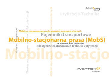 Mobilno-stacjonarne prasy do odpadów surowców wtórnych Elastyczne zastosowanie techniki ustylizacji Pojemniki transportowe Utylizacja-Technika Mobilno-stacjonarne prasy do odpadów surowców wtórnych Pojemniki transportowe Mobilno-stacjonarna prasa (MobS) Stacjonarna technika zagęszczania Mobilno-stacjo Elastyczne zastosowanie techniki ustylizacji MobS mobilno-stacjonarna prasa Większa efektywność poprzez stacjonarną mobilność Zalety mobilnej-stacjonarnej prasy Mobilne prasy można elastyczniej zastosować zależnie od potrzeby, ale przy podwyższonym odbiorze surowców do utylizacji szybko stają się nieekonomiczne. Stacjonarne prasy natomiast oznaczają z reguły znacznie większą inwestycje. Większą efektywność poprzez stacjonarną mobilność daje MobS firmy AVENTEK technologies. Przy tym nadal mamy do czynienia z wysokiej jakości prasami przystosowanymi do współpracy z pojemnikami przystosowanymi do systemu hakowego zgodnie z normą DIN 30722/cz1. MobS oferuje elastyczność mobilnej prasy, przy tym zachowując ekonomiczność stacjonarnej prasy. DANE TECHNICZNE MobS20 Długość urządzenia 2.820 mm Szerokość urządzenia 2.420 mm Wysokość urządzenia 1.570 mm Szerokość otworu wrzutowego 1.980 mm Długość otworu wrzutowego 1.670 mm Moc silnika Czas cyklu prasowania (b. jałowy) Siła prasowania Zasilanie elektryczne 5,5 kW 52 Sek. 320 kN (32 t) 3x400 V/ 50 Hz Zabezpieczenie instalacji elekt. 25 A, zwłoczne Złącze kablowe CEE-5x16 A/ 6 h System załadunku pojemnika transportowego hakowy · Korzystniejsza niż prasa stacjonarna · Elastyczne zastosowanie (papier/karton, folia, ...) · Możliwość różnych wariantów ustawienia · Szybki odbiór, np. w wypadku wygaśnięcia umowy · Nie wymagany żaden montaż na miejscu posadowienia · Łatwa obsługa · Brak możliwości montażu stacjonarnego urządzenia · Lepsze wykorzystanie pojemności transportowych · Właściwa prasa zostaje na miejscu utylizacji · Korzystniejszy bilans CO2 poprzez mniejszą ilość transportów ... · Możliwość zastosowania większych pojemników transportowych ( 32m3) · Mniejsze zużycie prasy · Łatwiejszy załadunek, brak konieczności obracania pojemnika · Umożliwia wykorzystanie zalet stacjonarnej prasy przy zachowaniu mobilności · Poprzez modułową budowę nie droższa niż porównywalna mobilna prasa · Przy tej samej technice możliwiość tych samych zastosowań i ustawień · Odbiór i dostawa jest tak samo szybki jak mobilnej prasy · Nie wymagany żaden montaż jak w wypadku prasy stacjonarnej · Identyczna obsługa poprzez zastosowanie takich samych elementów sterujących · MobS z pojemnikiem 24m³potrzebuje mniej miejsca w porównaniu z prasokontenerem 20m³ (w tym promień zawracania hakowca) Do transportu podnoszona oraz mocowana część szyn Odbojnik gumowy do ustawienia przy rampie Pojemniki transportowe 24, 28 und 32 m3 Posadowienie MobS‘a na miejscu utylizacji 1 Dostawa 2 Rozładunek pojemnika 3 Rozładunek MobS‘a 4 Ustawianie MobS‘a 5 Rozpoczcie procesu doczepiania 6 Otwarcie klapy do napełniania 7 Doczepianie pojemnika do MobS‘a poprzez prowadzenie szynami centrujacymi 8 MobS gotowy do użytku ! AVENTEK technologies Sp. z o.o. ul. Krzemowa 1, Złotniki PL-62-002 Suchy Las telefon: +48 61 29 73 810 e-mail: [email protected] www.aventek.pl