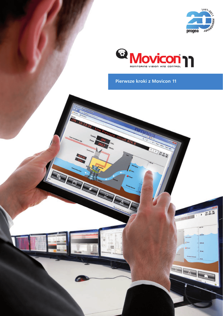Movicon Movicon Monitoring vision and control Monitoring vision and control Pierwsze kroki z Movicon 11 Sterowanie, nadzór i kontrola w oparciu o XML Pierwsze kroki z Movicon 11 Zawartość 1. Pierwsze kroki z Movicon ................................................................................................................ 4 1.1 2. 3. 4. 5. 6. Wstęp do tutorialu Movicon ................................................................................................... 4 Projekty ........................................................................................................................................... 5 2.1 Tworzenie i kształtowanie projektu ........................................................................................ 5 2.2 Tworzenie nowego projektu ................................................................................................... 7 2.3 Przestrzeń robocza ................................................................................................................ 11 2.4 Właściwości projektu............................................................................................................. 12 2.5 Struktura projektu ................................................................................................................. 13 Zmienne ......................................................................................................................................... 15 3.1 Tworzenie zmiennych ............................................................................................................ 15 3.2 Komunikacja z driverami wejścia/wyjścia ............................................................................. 17 3.3 Konfiguracja drivera .............................................................................................................. 20 3.4 Przypisanie zmiennej fizycznego adresu ............................................................................... 23 Ekrany ............................................................................................................................................ 25 4.1 Tworzenie ekranów ............................................................................................................... 25 4.2 Ekran startowy projektu ........................................................................................................ 28 4.3 Tworzenie i edycja grafiki ...................................................................................................... 30 4.4 Biblioteki obiektów ................................................................................................................ 32 4.5 Biblioteki symboli .................................................................................................................. 34 4.6 Tworzenie symbolu graficznego ............................................................................................ 35 Animacje ........................................................................................................................................ 37 5.1 Animacja koloru ..................................................................................................................... 37 5.2 Animacja położenia ............................................................................................................... 41 5.3 Wykonywanie komend z poziomu obiektów ........................................................................ 43 5.4 Przypisanie poleceń do obiektów .......................................................................................... 45 5.5 Uruchomienie trybu wykonywania ....................................................................................... 47 Alarmowanie ................................................................................................................................. 48 6.1 Zarządzanie alarmami ........................................................................................................... 48 6.2 Wstawianie alarmów ............................................................................................................. 48 6.3 Wyświetlanie alarmów .......................................................................................................... 52 6.4 Historia alarmów ................................................................................................................... 53 6.5 Symulacja alarmowania ......................................................................................................... 54 2 3 1. Pierwsze kroki z Movicon 1.1 Wstęp do tutorialu Movicon Witamy w samouczku Movicon! Ten poradnik ma na celu zademonstrowanie podstawowych możliwości platformy Movicon SCADA / HMI. Po zakończeniu tego samouczka będziesz miał wiedzę o wykorzystaniu podstawowych funkcji. Przed rozpoczęciem tego tutorialu należy zainstalować oprogramowanie Movicon za pomocą aplikacji setup. Zakłada się, że użytkownik tego tutorialu ma zainstalowany system Microsoft Windows oraz posiada podstawową wiedzę nt. systemów automatyki, koncepcji sterowników PLC oraz zmiennych. W celu uzyskania dalszych informacji na temat każdego z omawianych zagadnień, należy odnieść się do Online Guide lub podręcznika użytkownika. 4 2. Projekty 2.1 Tworzenie i kształtowanie projektu Program Movicon uruchomi się w trybie programowania (developer) razem z ostatnio otwartym projektem. Przy pierwszym uruchomieniu zostanie wyświetlony pusty obszar roboczy. Movicon wykorzystuje nowoczesne techniki zanikających okien, dlatego wystarczy wskazać myszką na żądanej karcie właściwości, aby wyświetlić ją w obszarze roboczym. Aby utrzymać okno wyświetlone w obszarze roboczym wystarczy stosować polecenia, jak wskazano poniżej: W celu wyświetlenia okna właściwości wystarczy wskazać je myszą. Aby zachować widoczne okno wystarczy użyć polecenia ‘Auto Hide’. 5 Porada: 