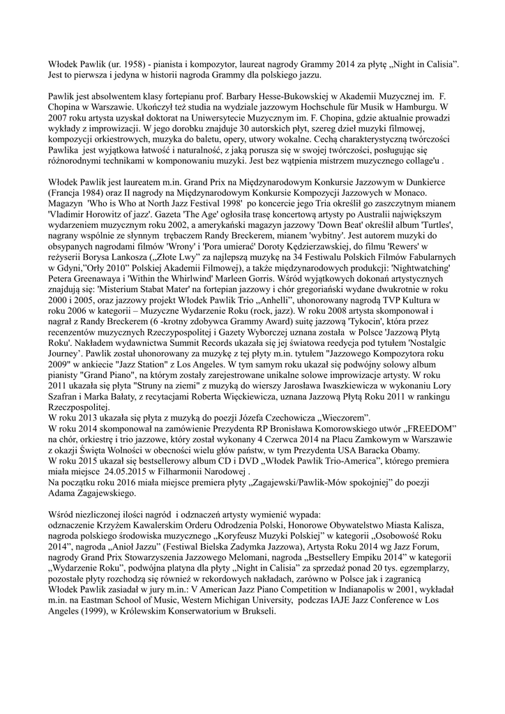 Włodek Pawlik (ur. 1958) - pianista i kompozytor, laureat nagrody Grammy 2014 za płytę „Night in Calisia”. Jest to pierwsza i jedyna w historii nagroda Grammy dla polskiego jazzu. Pawlik jest absolwentem klasy fortepianu prof. Barbary Hesse-Bukowskiej w Akademii Muzycznej im. F. Chopina w Warszawie. Ukończył też studia na wydziale jazzowym Hochschule für Musik w Hamburgu. W 2007 roku artysta uzyskał doktorat na Uniwersytecie Muzycznym im. F. Chopina, gdzie aktualnie prowadzi wykłady z improwizacji. W jego dorobku znajduje 30 autorskich płyt, szereg dzieł muzyki filmowej, kompozycji orkiestrowych, muzyka do baletu, opery, utwory wokalne. Cechą charakterystyczną twórczości Pawlika jest wyjątkowa łatwość i naturalność, z jaką porusza się w swojej twórczości, posługując się różnorodnymi technikami w komponowaniu muzyki. Jest bez wątpienia mistrzem muzycznego collage'u . Włodek Pawlik jest laureatem m.in. Grand Prix na Międzynarodowym Konkursie Jazzowym w Dunkierce (Francja 1984) oraz II nagrody na Międzynarodowym Konkursie Kompozycji Jazzowych w Monaco. Magazyn 'Who is Who at North Jazz Festival 1998' po koncercie jego Tria określił go zaszczytnym mianem 'Vladimir Horowitz of jazz'. Gazeta 'The Age' ogłosiła trasę koncertową artysty po Australii największym wydarzeniem muzycznym roku 2002, a amerykański magazyn jazzowy 'Down Beat' określił album 'Turtles', nagrany wspólnie ze słynnym trębaczem Randy Breckerem, mianem 'wybitny'. Jest autorem muzyki do obsypanych nagrodami filmów 'Wrony' i 'Pora umierać' Doroty Kędzierzawskiej, do filmu 'Rewers' w reżyserii Borysa Lankosza („Złote Lwy” za najlepszą muzykę na 34 Festiwalu Polskich Filmów Fabularnych w Gdyni,”Orły 2010” Polskiej Akademii Filmowej), a także międzynarodowych produkcji: 'Nightwatching' Petera Greenawaya i 'Within the Whirlwind' Marleen Gorris. Wśród wyjątkowych dokonań artystycznych znajdują się: 'Misterium Stabat Mater' na fortepian jazzowy i chór gregoriański wydane dwukrotnie w roku 2000 i 2005, oraz jazzowy projekt Włodek Pawlik Trio „Anhelli”, uhonorowany nagrodą TVP Kultura w roku 2006 w kategorii – Muzyczne Wydarzenie Roku (rock, jazz). W roku 2008 artysta skomponował i nagrał z Randy Breckerem (6 -krotny zdobywca Grammy Award) suitę jazzową 'Tykocin', która przez recenzentów muzycznych Rzeczypospolitej i Gazety Wyborczej uznana została w Polsce 'Jazzową Płytą Roku'. Nakładem wydawnictwa Summit Records ukazała się jej światowa reedycja pod tytułem 'Nostalgic Journey’. Pawlik został uhonorowany za muzykę z tej płyty m.in. tytułem "Jazzowego Kompozytora roku 2009" w ankiecie "Jazz Station" z Los Angeles. W tym samym roku ukazał się podwójny solowy album pianisty "Grand Piano", na którym zostały zarejestrowane unikalne solowe improwizacje artysty. W roku 2011 ukazała się płyta "Struny na ziemi" z muzyką do wierszy Jarosława Iwaszkiewicza w wykonaniu Lory Szafran i Marka Bałaty, z recytacjami Roberta Więckiewicza, uznana Jazzową Płytą Roku 2011 w rankingu Rzeczpospolitej. W roku 2013 ukazała się płyta z muzyką do poezji Józefa Czechowicza „Wieczorem”. W roku 2014 skomponował na zamówienie Prezydenta RP Bronisława Komorowskiego utwór „FREEDOM” na chór, orkiestrę i trio jazzowe, który został wykonany 4 Czerwca 2014 na Placu Zamkowym w Warszawie z okazji Święta Wolności w obecności wielu głów państw, w tym Prezydenta USA Baracka Obamy. W roku 2015 ukazał się bestsellerowy album CD i DVD „Włodek Pawlik Trio-America”, którego premiera miała miejsce 24.05.2015 w Filharmonii Narodowej . Na początku roku 2016 miała miejsce premiera płyty „Zagajewski/Pawlik-Mów spokojniej” do poezji Adama Zagajewskiego. Wśród niezliczonej ilości nagród i odznaczeń artysty wymienić wypada: odznaczenie Krzyżem Kawalerskim Orderu Odrodzenia Polski, Honorowe Obywatelstwo Miasta Kalisza, nagroda polskiego środowiska muzycznego „Koryfeusz Muzyki Polskiej” w kategorii „Osobowość Roku 2014”, nagroda „Anioł Jazzu” (Festiwal Bielska Zadymka Jazzowa), Artysta Roku 2014 wg Jazz Forum, nagrody Grand Prix Stowarzyszenia Jazzowego Melomani, nagroda „Bestsellery Empiku 2014” w kategorii „Wydarzenie Roku”, podwójna platyna dla płyty „Night in Calisia” za sprzedaż ponad 20 tys. egzemplarzy, pozostałe płyty rozchodzą się również w rekordowych nakładach, zarówno w Polsce jak i zagranicą Włodek Pawlik zasiadał w jury m.in.: V American Jazz Piano Competition w Indianapolis w 2001, wykładał m.in. na Eastman School of Music, Western Michigan University, podczas IAJE Jazz Conference w Los Angeles (1999), w Królewskim Konserwatorium w Brukseli.