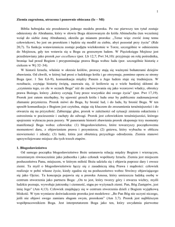 1 Ziemia zagrożona, utracona i ponownie obiecana (Iz ‒ Ml) Biblia hebrajska nie przedstawia jednego modelu proroka. Po raz pierwszy ten tytuł zostaje odniesiony do Abrahama, który w słowie Boga skierowanym do króla Abimelecha (ten wcześniej wziął do siebie żonę Abrahama), określa go mianem proroka: „Teraz więc zwróć żonę temu człowiekowi, bo jest on prorokiem i będzie się modlił za ciebie, abyś pozostał przy życiu” (Rdz 20,7). Ta funkcja wstawiennicza zostaje podjęta wielokrotnie w Torze, szczególnie w odniesieniu do Mojżesza, gdy ten wstawia się u Boga za grzesznym ludem. W Pięcioksięgu Mojżesz jest przedstawiany jako prorok par excellance (por. Lb 12,7; Pwt 34,10): przyjmuje on rolę pośrednika, broniąc lud przed Bogiem i przypominając prawa Boga wobec ludu (por. szczególnie historię z cielcem w Wj 32‒34). W historii Izraela, właśnie w okresie królów, prorocy stają się ważnymi bohaterami dziejów zbawienia. Od chwili, w której lud prosi o ludzkiego króla i go otrzymuje, pomimo oporu ze strony Boga (por. 1 Sm 8,6-9), komunikacja między Panem a Jego ludem staje się trudniejsza. W rezultacie, czytając historię świętą, zauważa się, iż królowie są o wiele bardziej skłonni do „czynienia tego, co złe w oczach Boga” niż do zachowywania się jako wzorcowi władcy, obrońcy prawa Bożego, którzy „którzy czytają Torę przez wszystkie dni swego życia” (por. Pwt 17,19). Prorok jest zatem niezbędny, by ujawnić grzech króla i ludu oraz by publicznie zadenuncjować złamanie przymierza. Prorok mówi do Boga, by bronić lud, i do ludu, by bronić Boga. W ten sposób komunikacja z Bogiem jest czytelna, stając się kluczem do zrozumienia teraźniejszości i do otwarcia się na przyszłość. Zabierając głos, prorok w zależności od sytuacji zmienia oskarżenia i ostrzeżenia w pocieszenie i zachęty do odwagi. Prorok jest człowiekiem teraźniejszości, którego spojrzenie wykracza poza pozory. W panoramie historii zbawienia prorok eksponuje trzy momenty manifestacji Boga wobec człowieka: (1) błogosławieństwo, które towarzyszy początkowemu momentowi daru, z objawieniem prawa i przymierza; (2) gniewu, który wybucha w obliczu niewierności i zdrady; (3) łaski, która jest obietnicą przyszłego odrodzenia. Ziemia stanowi uprzywilejowane miejsce dla tych trzech etapów. 1. Błogosławieństwo Od samego początku błogosławieństwo Boże ustanawia relację między Bogiem i wierzącym, rozumianym równocześnie jako jednostka i jako członek wspólnoty Izraela. Ziemia jest miejscem posłuszeństwa Panu, miejscem, w którym miłość Boża udziela się i objawia poprzez dary i owoce ziemi. Ta myśl o błogosławieństwie łączy się z zasadniczą ideą Prawa i mądrości: człowiek realizuje w pełni własne życie, kiedy zgadza się na posłuszeństwo wobec Stwórcy objawiającego się jako Ojciec. Ta koncepcja pojawia się u proroka Amosa, który umieszcza ludzką osobę w centrum stworzenia jako partnera Boga: „On to jest, który tworzy góry i stwarza wichry, myśli ludzkie poznaje, wywołuje jutrzenkę i ciemność, stąpa po wyżynach ziemi. Pan, Bóg Zastępów, jest imię Jego” (Am 4,13). Człowiek znajdujący się w centrum stworzenia dzieli z Bogiem wyjątkową bliskość. W tym wymiarze doświadczenie proroka jest modelowe: „Bo Pan Bóg nie uczyni niczego, jeśli nie objawi swego zamiaru sługom swym, prorokom” (Am 3,7). Prorok jest najbliższym współpracownikiem Boga. Jest interpretatorem Boga jako ten, który uwydatnia pierwotne 2 błogosławieństwo Boże. To właśnie z powodu roztrwonienia przez człowieka błogosławieństwa rodzi się gniew Boga, podczas gdy skrucha ludu wywołuje łaskę i przebaczenie. 2. Gniew Boga W momentach kryzysu prorok daje poznać cierpienie i gniew Boga spowodowane przez grzech Izraela. Ziemia stała się ziemią winy. Z tego powodu, zamiast spodziewanego błogosławieństwa, będzie ona sceną Bożego gniewu. Prorocy głośno oskarżają o naruszanie Prawa. Wielu z nich podkreśla idolatrię Izraela, której korzenie nie są wcale różne od tych leżących u podstaw bałwochwalstwa popełnianego przez ludy zamieszkujące te tereny przed nimi. Inni eksponują niesprawiedliwość, która rządzi ludzkimi relacjami. Amos głosi: „Tak mówi Pan: Z powodu trzech występków Judy i z powodu czterech nie odwrócę tego wyroku, gdyż odrzucili Prawo Pana i przykazań Jego nie strzegli; zwiedli ich kłamliwi ich bogowie, za którymi przodkowie ich chodzili. Ześlę więc ogień na Judę i strawi pałace Jeruzalem. Tak mówi Pan: Z powodu trzech występków Izraela i z powodu czterech nie odwrócę tego wyroku, gdyż sprzedają za srebro sprawiedliwego, a ubogiego za parę sandałów; w prochu ziemi depcą głowy biednych i ubogich kierują na bezdroża; ojciec i syn chodzą do tej samej dziewczyny, aby znieważać święte imię moje. Na płaszczach zastawnych wylegują się przy każdym ołtarzu i wino wymuszone grzywną piją w domu swego Boga” (Am 2,4-8). Ten tekst wyraźnie pokazuje nierozerwalny związek grzechu „wertykalnego” (człowieka wobec Boga) i „horyzontalnego” (człowieka wobec własnego brata). Jednym z zadań proroka jest ujawnienie winy, przez którą ziemia nosi na sobie niezatarte ślady przelanej krwi. Przez Ezechiela Bóg napomina niewierny lud: „Dlatego powiedz im: Tak mówi Pan Bóg: Jadacie z krwią, podnosicie oczy ku swym bożkom, przelewacie krew, a chcielibyście zawładnąć krajem?” (Ez 33,25; por. Jr 19,41). Definiując człowieka sprawiedliwego, Ezechiel odsłania potrójne sidło grzechu: idolatrię (która niszczy relacje z Bogiem), nieczystość seksualną (która dotyczy zarówno relacji z drugim człowiekiem, jak i z Bogiem) oraz niesprawiedliwość ekonomiczną (która krzywdzi braci). Ziemia traci swoją płodność i urodzajność z powodu występków człowieka, który ją zamieszkuje. Inni prorocy podkreślają