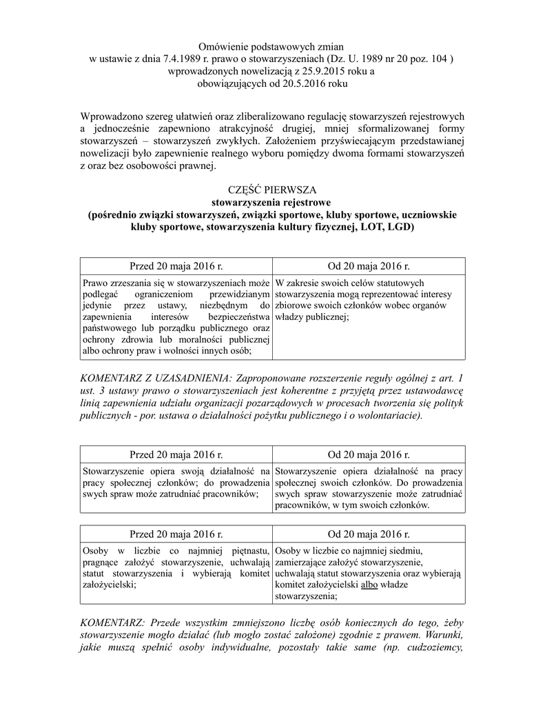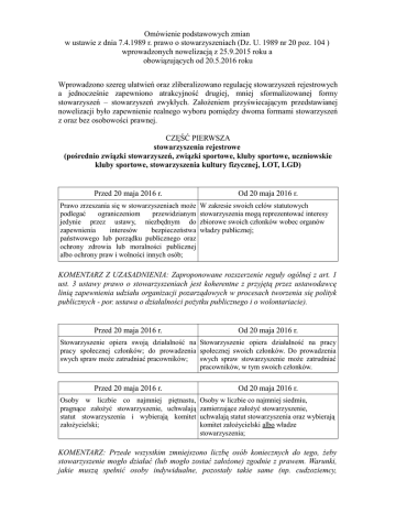 Omówienie podstawowych zmian w ustawie z dnia 7.4.1989 r. prawo o stowarzyszeniach (Dz. U. 1989 nr 20 poz. 104 ) wprowadzonych nowelizacją z 25.9.2015 roku a obowiązujących od 20.5.2016 roku Wprowadzono szereg ułatwień oraz zliberalizowano regulację stowarzyszeń rejestrowych a jednocześnie zapewniono atrakcyjność drugiej, mniej sformalizowanej formy stowarzyszeń – stowarzyszeń zwykłych. Założeniem przyświecającym przedstawianej nowelizacji było zapewnienie realnego wyboru pomiędzy dwoma formami stowarzyszeń z oraz bez osobowości prawnej. CZĘŚĆ PIERWSZA stowarzyszenia rejestrowe (pośrednio związki stowarzyszeń, związki sportowe, kluby sportowe, uczniowskie kluby sportowe, stowarzyszenia kultury fizycznej, LOT, LGD) Przed 20 maja 2016 r. Prawo zrzeszania się w stowarzyszeniach może podlegać ograniczeniom przewidzianym jedynie przez ustawy, niezbędnym do zapewnienia interesów bezpieczeństwa państwowego lub porządku publicznego oraz ochrony zdrowia lub moralności publicznej albo ochrony praw i wolności innych osób; Od 20 maja 2016 r. W zakresie swoich celów statutowych stowarzyszenia mogą reprezentować interesy zbiorowe swoich członków wobec organów władzy publicznej; KOMENTARZ Z UZASADNIENIA: Zaproponowane rozszerzenie reguły ogólnej z art. 1 ust. 3 ustawy prawo o stowarzyszeniach jest koherentne z przyjętą przez ustawodawcę linią zapewnienia udziału organizacji pozarządowych w procesach tworzenia się polityk publicznych - por. ustawa o działalności pożytku publicznego i o wolontariacie). Przed 20 maja 2016 r. Od 20 maja 2016 r. Stowarzyszenie opiera swoją działalność na Stowarzyszenie opiera działalność na pracy pracy społecznej członków; do prowadzenia społecznej swoich członków. Do prowadzenia swych spraw może zatrudniać pracowników; swych spraw stowarzyszenie może zatrudniać pracowników, w tym swoich członków. Przed 20 maja 2016 r. Od 20 maja 2016 r. Osoby w liczbie co najmniej piętnastu, pragnące założyć stowarzyszenie, uchwalają statut stowarzyszenia i wybierają komitet założycielski; Osoby w liczbie co najmniej siedmiu, zamierzające założyć stowarzyszenie, uchwalają statut stowarzyszenia oraz wybierają komitet założycielski albo władze stowarzyszenia; KOMENTARZ: Przede wszystkim zmniejszono liczbę osób koniecznych do tego, żeby stowarzyszenie mogło działać (lub mogło zostać założone) zgodnie z prawem. Warunki, jakie muszą spełnić osoby indywidualne, pozostały takie same (np. cudzoziemcy, małoletni). Ustawodawca dał szansę władzom stowarzyszenia na wykreślenie/wykluczenie członków od dawna nie działających na rzecz stowarzyszenia, a których nie mogły pozbawić członkostwa ze względu na konieczność utrzymania przynajmniej 15 członków. Regulacja ta jest wzorowana na obowiązującej w prawie niemieckim. Przed 20 maja 2016 r. - Od 20 maja 2016 r. Statut stowarzyszenia określa w szczególności możliwość otrzymywania przez członków zarządu wynagrodzenia za czynności wykonywane w związku z pełnioną funkcją; KOMENTARZ Z UZASADNIENIA: Możliwość pełnienia funkcji we władzach stowarzyszenia za wynagrodzeniem musi przewidywać statut stowarzyszenia. Trzeba podkreślić, że sama dyspozycja statutowa może wymagać uszczegółowienia zasad wynagradzania w konkretnej umowie albo regulaminie. KOMENTARZ Z UZASADNIENIA 2: Warto w tym kontekście powołać się na rozwiązania niemieckie, które nie limitują możliwości zatrudniania władz stowarzyszenia, wskazując na to m. in. w par. 27 i 31a niemieckiego Kodeksu Cywilnego. Proponowane rozwiązanie jest też spójne z art. 27a ustawy o działalności pożytku publicznego i o wolontariacie. Przepis ten przewiduje osobną zasadę odpowiedzialności dla członków organów zarządzających lub kontroli wewnętrznej organizacji ze statusem pożytku publicznego, uwzględniającą pełnienie przez nich zawodowo (a więc odpłatnie) funkcji. Skoro więc akceptowane jest przez ustawodawcę odpłatne pełnienie funkcji w przypadku organizacji o podwyższonych wymogach ustawowych, ze względu na ich społecznie użyteczny charakter organizacji szczególnego zaufania publicznego, to nie widać powodów dla których stowarzyszenia miałyby być w tym zakresie ograniczone i być dyskryminowane względem innych organizacji pozarządowych jak np. fundacji. W końcu aktualna sytuacja organizacji pozarządowych w Polsce, korzystających często z dużych dotacji publicznych dla realizacji zlecanych im zadań publicznych, za których poprawne wykorzystanie oraz rozliczenie odpowiadają głównie członkowie zarządów, wydaje się wymagać umożliwienia bez wątpliwości prawnych tym stowarzyszeniom, które mają taką możliwość, na korzystanie z profesjonalnych organów zarządzających i kontroli wewnętrznej. KOMENTARZ: Do 20 maja 2016 roku członkowie Zarządu Stowarzyszenia nie mogli być wynagradzani za czynności związane z zarządem organizacją. Stowarzyszenia często zawierały z członkami Zarządu umowy omijające tę regulację. Nowelizacja przyznaje organizacjom możliwość wynagradzania członków Zarządu za sprawowanie przez nich funkcji. Należy przy tym pamiętać o konieczności podpisywania wszelkich umów z członkami Zarządu (także niezwiązanych z funkcją) przez pełnomocnika (o tym wymogu niżej). Jeżeli dotychczas działająca organizacja chce korzystać z powyższej możliwości będzie musiała zmienić statut. Jeżeli nie chce, może pozostać przy dotychczasowym statucie i nie zmieniać go o ile jest w nim mowa o „społecznej działalności członków Zarządu” (lub inny odpowiedni zapis o niepobieraniu przez Zarząd wynagrodzenia). Jeśli w statucie nie ma żadnego zapisu odnośnie wynagradzania członków Zarządu Stowarzyszenie musi zmienić statut i wprowadzić tę informację (niezależnie od jej treści) bowiem od 20 maja 2016 roku jest to element obligatoryjny statutu. D