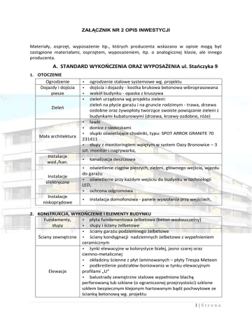 ZAŁĄCZNIK NR 2 OPIS INWESTYCJI Materiały, osprzęt, wyposażenie itp., których producenta wskazano w opisie mogą być zastąpione materiałami, osprzętem, wyposażeniem, itp. o analogicznej klasie, ale innego producenta. A. STANDARD WYKOŃCZENIA ORAZ WYPOSAŻENIA ul. Stańczyka 9 1. OTOCZENIE Ogrodzenie Dojazdy i dojścia piesze Zieleń Mała architektura Instalacje wod./kan. ogrodzenie stalowe systemowe wg. projektu • dojścia i dojazdy - kostka brukowa betonowa wibroprasowana • wokół budynku - opaska z kruszywa • zieleń urządzona wg projektu zieleni: zieleń na płycie garażu i na gruncie rodzimym - trawa, drzewa ozdobne oraz żywopłoty tworzące swoiste powiązanie zieleni z budynkami kubaturowymi (drzewa, krzewy ozdobne, róże) • ławki • donice z siedziskami • słupki oświetlające chodniki, typu: SPOT ARROK GRANITE 70 231411 • słupy z monitoringiem wpiętym w system Oazy Bronowice – 3 szt. monitor i nagrywarka, • • kanalizacja deszczowa oświetlenie ciągów pieszych, zieleni, głównego wejścia, wjazdu do garażu • oświetlenie przy każdym wejściu do budynku w technologii LED, • ochrona odgromowa • Instalacje elektryczne Instalacje niskoprądowe • instalacja domofonowa - panele wywołania przy wejściach, 2. KONSTRUKCJA, WYKOŃCZENIE I ELEMENTY BUDYNKU Fundamenty, • płyta fundamentowa żelbetowa (beton wodoszczelny) słupy • słupy i ściany żelbetowe • ściany garażu podziemnego żelbetowe Ściany zewnętrzne • ściany kondygnacji nadziemnych żelbetowe z wypełnieniem ceramicznym • tynki elewacyjne w kolorystyce białej, jasno szarej oraz ciemno-metalicznej • okładziny ścienne z płyt laminowanych – płyty Trespa Meteon • podkreślenie podziałów-boniowania w tynku elewacyjnym Elewacje profilami „U” • balustrady zewnętrzne stalowe wypełnione blachą perforowaną lub szklane (o ograniczonej przejrzystości) szklone szkłem bezpiecznym klejonym hartowanym bądź pochwytowe ze ścianką betonową wg. projektu 1|Strona przegrody pomiędzy balkonami i tarasami przynależnymi do różnych mieszkań - wypełnione zestawem szklanym - szkło hartowane • nad loggiami IV kondygnacji segmentu B - zaprojektowano doświetlające świetliki • ściany między mieszkaniowe ceramiczne Techno AmerBlok lub żelbetowego gr. 20 cm • ściany działowe – ceramiczne Thermophor/Porotherm gr. 8cm Ściany oraz 11,5 cm wewnętrzne • obudowa szachtów – bloczki ceramiczne lub żelbetowe • ściany szybów windowych - żelbetowe wg. projektu • ściany wewnętrzne klatek schodowych - żelbetowe wg. projektu • żelbetowe monolityczne między kondygnacjami wg. projektu Stropy • płyta żelbetowa nad garażem wg. projektu Strop nad garażem • izolacja termiczna – wełna mineralna • dach płaski – na konstrukcji płyty żelbetowej , niewentylowany, zielony (roślinność ekstensywna) Dach • wpusty dachowe odprowadzające wodę opadową systemowe • parapety wewnętrzne – kamienne marmur Bianco Carrera, Parapety gr.3cm, wystające w kierunku klatki o 5 cm, • parapety zewnętrzne - blacha stalowa powlekana kolor - szary • drzwi zewnętrzne i wewnętrzne wiatrołapu wejściowego aluminiowe przeszklone wmontowane w witrynę aluminiową Drzwi • drzwi zewnętrzne do mieszkań - antywłamaniowe klasy C, firmy Dierre, próg systemowy, okleina drewnopodobna, podwójny zamek, blokadę, numer, samozamykacz niewidoczny (zawiasowy) • instalacja c.o., zimnej i ciepłej wody użytkowej (MPEC) • indywidualne opomiarowanie mediów dla mieszkań - na korytarzach (liczniki ciepłej i zimnej wody użytkowej, liczniki centralnego ogrzewania) • instalacja elektryczna (oświetlenie, gniazda wtykowe, w tym instalacja trójfazowa do kuchenek elektrycznych) – dotyczy lokali mieszkalnych • instalacja teletechniczna (domofon, RTV, telefon, Internet, AZART) Instalacje związane • instalacja elektryczna (oświetlenie z wyłącznikami czasowymi, z budynkiem gniazda wtykowe) – dotyczy obwodów administracyjnych • kanalizacja deszczowa • kanalizacja sanitarna • instalacja przeciwpożarowa oraz detekcji tlenku węgla • instalacja oświetlenia garaży - sekcyjna włączana automatycznie czujnikami • instalacja wentylacji mechanicznej w garażach, mieszkaniach, komunikacji i innych pomieszczeniach • instalacja odgromowa • 2|Strona instalacja ochrony przed porażeniem • instalacja zasilania podgrzewania podjazdu do garażu, schodów wejściowych, podestów • instalacja zasilania dźwigów • instalacja oświetleniowa zewnętrzna budynku • monitoring • kontrola dostępu – rowerownia, śmietnik, wejście do klatki schodowej • 3. PRZESTRZENIE WSPÓLNE 3.1. STREFA WEJŚCIOWA-HALL PARTERU Z PRZEDSIONKIEM • schody zewnętrzne oraz ścianki cokołowe schodów z okładziny kamiennej gr. 3 cm Bengal Black Palony, płomieniowany, podjazdy dla wózków, Posadzka / cokół • wszystkie nawierzchnie posadzek, schodów, podestów itp. antypoślizgowe, zmywalne, zewnętrzne dodatkowo: mrozoodporne • ściany holu na parterze wykończone płytami gipsowokartonowymi wg. projektu aranżacji, wykończenie - tynk gipsowy Ściany malowany natryskowo, • elementy dekoracyjne z trespy elewacyjnej Sufit • tynk gipsowy malowany natryskowo farbą akrylową • drzwi zewnętrzne i wewnętrzne wiatrołapu wejściowego Drzwi / witryny aluminiowe przeszklone wmontowane w witrynę aluminiową • ślusarka aluminiowa, kolor -szary Okna • zestaw szklarski o współczynniku przenikania ciepła U=1,0 W/m²K Instalacje C.O. • grzejniki kompaktowe w kolorze szarym, • instalacja oświetleniowa Instalacje • gniazda zasilające administracyjne elektryczne • osprzęt elektryczny Instalacje • instalacja domofonowa niskoprądowe • tablica informacyjna • skrzynki na listy systemowe z blachy nierdzewnej wraz z numerami • wycieraczki w strefach wejściowych do segmentów: Wyposażenie zewnętrzne -z krat HMS, wycierac