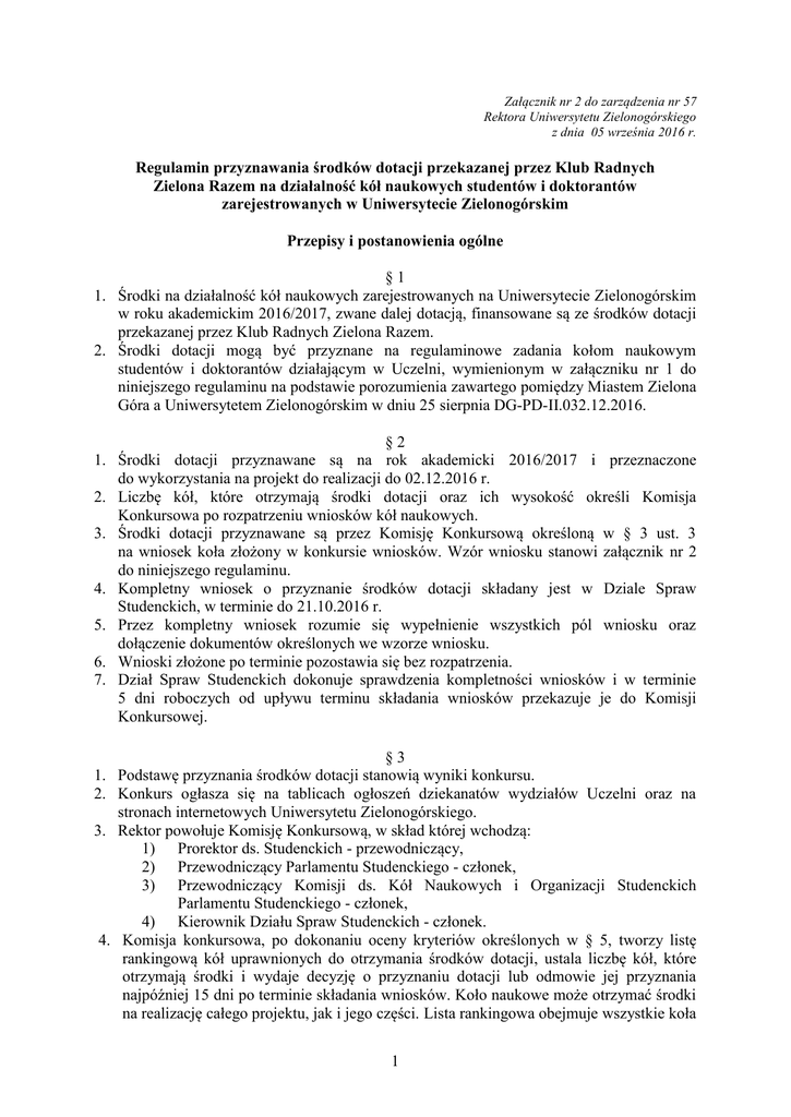 Załącznik nr 2 do zarządzenia nr 57 Rektora Uniwersytetu Zielonogórskiego z dnia 05 września 2016 r. Regulamin przyznawania środków dotacji przekazanej przez Klub Radnych Zielona Razem na działalność kół naukowych studentów i doktorantów zarejestrowanych w Uniwersytecie Zielonogórskim Przepisy i postanowienia ogólne §1 1. Środki na działalność kół naukowych zarejestrowanych na Uniwersytecie Zielonogórskim w roku akademickim 2016/2017, zwane dalej dotacją, finansowane są ze środków dotacji przekazanej przez Klub Radnych Zielona Razem. 2. Środki dotacji mogą być przyznane na regulaminowe zadania kołom naukowym studentów i doktorantów działającym w Uczelni, wymienionym w załączniku nr 1 do niniejszego regulaminu na podstawie porozumienia zawartego pomiędzy Miastem Zielona Góra a Uniwersytetem Zielonogórskim w dniu 25 sierpnia DG-PD-II.032.12.2016. §2 1. Środki dotacji przyznawane są na rok akademicki 2016/2017 i przeznaczone do wykorzystania na projekt do realizacji do 02.12.2016 r. 2. Liczbę kół, które otrzymają środki dotacji oraz ich wysokość określi Komisja Konkursowa po rozpatrzeniu wniosków kół naukowych. 3. Środki dotacji przyznawane są przez Komisję Konkursową określoną w § 3 ust. 3 na wniosek koła złożony w konkursie wniosków. Wzór wniosku stanowi załącznik nr 2 do niniejszego regulaminu. 4. Kompletny wniosek o przyznanie środków dotacji składany jest w Dziale Spraw Studenckich, w terminie do 21.10.2016 r. 5. Przez kompletny wniosek rozumie się wypełnienie wszystkich pól wniosku oraz dołączenie dokumentów określonych we wzorze wniosku. 6. Wnioski złożone po terminie pozostawia się bez rozpatrzenia. 7. Dział Spraw Studenckich dokonuje sprawdzenia kompletności wniosków i w terminie 5 dni roboczych od upływu terminu składania wniosków przekazuje je do Komisji Konkursowej. 1. 2. 3. 4. §3 Podstawę przyznania środków dotacji stanowią wyniki konkursu. Konkurs ogłasza się na tablicach ogłoszeń dziekanatów wydziałów Uczelni oraz na stronach internetowych Uniwersytetu Zielonogórskiego. Rektor powołuje Komisję Konkursową, w skład której wchodzą: 1) Prorektor ds. Studenckich - przewodniczący, 2) Przewodniczący Parlamentu Studenckiego - członek, 3) Przewodniczący Komisji ds. Kół Naukowych i Organizacji Studenckich Parlamentu Studenckiego - członek, 4) Kierownik Działu Spraw Studenckich - członek. Komisja konkursowa, po dokonaniu oceny kryteriów określonych w § 5, tworzy listę rankingową kół uprawnionych do otrzymania środków dotacji, ustala liczbę kół, które otrzymają środki i wydaje decyzję o przyznaniu dotacji lub odmowie jej przyznania najpóźniej 15 dni po terminie składania wniosków. Koło naukowe może otrzymać środki na realizację całego projektu, jak i jego części. Lista rankingowa obejmuje wszystkie koła 1 spełniające warunki określone w § 5, uszeregowane według liczby uzyskanych punktów w kolejności od najwyższej do najniższej liczby uzyskanych punktów. Uzupełnienie listy kół, którym przyznano środki może nastąpić w przypadku posiadania przez Uczelnię środków dotacji. 5. Wyniki konkursu ogłaszane są na stronie internetowej www.dss.uz.zgora.pl. 6. Od decyzji komisji konkursowej nie przysługuje odwołanie. 7. Środki dotacji przeznaczane są na realizację wnioskowanego projektu zgodnie z zasadami przyjętymi na Uczelni. 8. Dotacja musi być wykorzystana w terminie do 02.12.2016 r. §4 1. Koło traci prawo do ubiegania się o środki dotacji albo otrzymania środków dotacji z powodu: 1) wykreślenia z rejestru kół Uczelni, 2) nierealizowania wnioskowanego projektu w poprzednim konkursie, 3) przyznania środków na podstawie nieprawdziwych informacji lub fałszywych dokumentów, 4) niezłożenia sprawozdania z działalności koła za ostatni semestr (nie dotyczy kół zarejestrowanych krócej niż semestr). 2. Rozliczenie dotacji przyznanej na projekt realizowany w terminie określonym w § 2 ust. 1 oraz § 3 ust. 8 należy przeprowadzić zgodnie z obowiązującym na Uniwersytecie Zielonogórskim obiegiem dokumentów do dnia 09.12.2016 r. Przyznawanie dotacji §5 1. Dotację może otrzymać koło, które spełniło łącznie następujące warunki: 1) spełnia warunki określone w § 1 ust. 2, 2) złożyło w terminie określonym w § 2 ust. 4 kompletny wniosek o przyznanie środków dotacji. 2. Środki dotacji przyznawane są w oparciu o ocenę wniosku pod względem formalnym i merytorycznym. 3. Podstawą oceny pod względem merytorycznym jest suma punktów P wyliczana w następujący sposób: P=Z+M+L+V gdzie Z –punkty za zasięg projektu: uczelniany – 5 pkt, regionalny -10 , ogólnokrajowy – 15 , międzynarodowy – 20; M- punkty za ocenę merytoryczną projektu od 0 do 25; L – punkty za liczbę odbiorców projektu od 0 do 15; V – voucher za otrzymanie dyplomu Rektora za działalność otrzymany na inauguracji roku akademickiego 2016/2017: 25 pkt. §6 Komisja przyznaje środki dotacji kołom spełniającym wymogi formalne z najwyższą punktacją za wymogi merytoryczne ustaloną zgodnie z § 5 ust. 3 – w ramach przydzielonego limitu dotacji i ustalonej zgodnie z § 3 ust. 4 liczby kół. 2