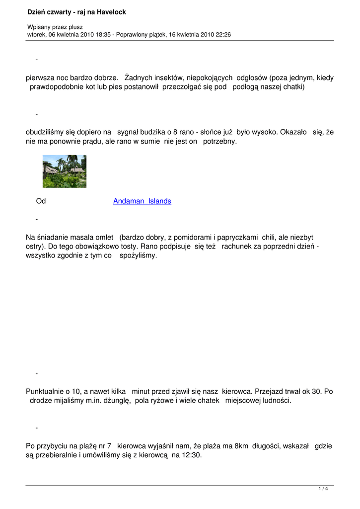 Dzień czwarty - raj na Havelock Wpisany przez plusz wtorek, 06 kwietnia 2010 18:35 - Poprawiony piątek, 16 kwietnia 2010 22:26 pierwsza noc bardzo dobrze. Żadnych insektów, niepokojących odgłosów (poza jednym, kiedy prawdopodobnie kot lub pies postanowił przeczołgać się pod podłogą naszej chatki) obudziliśmy się dopiero na sygnał budzika o 8 rano - słońce już było wysoko. Okazało się, że nie ma ponownie prądu, ale rano w sumie nie jest on potrzebny. Od Andaman Islands Na śniadanie masala omlet (bardzo dobry, z pomidorami i papryczkami chili, ale niezbyt ostry). Do tego obowiązkowo tosty. Rano podpisuje się też rachunek za poprzedni dzień wszystko zgodnie z tym co spożyliśmy. Punktualnie o 10, a nawet kilka minut przed zjawił się nasz kierowca. Przejazd trwał ok 30. Po drodze mijaliśmy m.in. dżunglę, pola ryżowe i wiele chatek miejscowej ludności. Po przybyciu na plażę nr 7 kierowca wyjaśnił nam, że plaża ma 8km długości, wskazał gdzie są przebieralnie i umówiliśmy się z kierowcą na 12:30. 1/4 Dzień czwarty - raj na Havelock Wpisany przez plusz wtorek, 06 kwietnia 2010 18:35 - Poprawiony piątek, 16 kwietnia 2010 22:26 Od Andaman Islands kierowca poradził nam również, że w budkach przy wjeździe możemy skorzystać z posiłków budki robiły na nas bardzo niedobre wrażenie i na razie nie zdecydowaliśmy się na jedzenie (bardzo niesłusznie, bo pierwsze wrażenie jest błędne) Przy wejściu spróbowaliśmy wody kokosowej, bezpośrednio z kokosa. Zapytaliśmy o cenę 15 rupii. Zaproponowaliśmy 10, ale prawdopodobnie cena regularna jest niższa. Od Andaman Islands Plaża nr 7 została uznana za najpiękniejszą plażę świata wg tygodnika .... i rzeczywiście robi wrażenie. Tylko garstka turystów, większość z Indii. Po prawej stronie od wjazdu, w dżungli wiele domków turystycznych, bardzo przypominających tanie kwatery nad polskim morzem. Od Andaman Islands Na plaży była wywieszona (a raczej zatknięta w piasku) czerwona flaga. Rzeczywiście fale były dość duże, niektóre dochodziły do ok 1 meta (oceniając moim niewprawnym okiem). Oczywiście nie przeszkadzało to w żadnym stopniu w kąpieli. Nie można natomiast było snurkować, ale generalnie ta plaża poza jednym fragmentem (Blue Laguna) nie zawiera nic poza idealnie białym piaskiem i błękitną wodą. Tak więc maska i fajka nie są czymś koniecznym. 2/4 Dzień czwarty - raj na Havelock Wpisany przez plusz wtorek, 06 kwietnia 2010 18:35 - Poprawiony piątek, 16 kwietnia 2010 22:26 Przeszliśmy kilkaset metrów w prawo, na plażę przy Barefoot Resort. Poza nami były tam jeszcze tylko 3 inne osoby. Opróc z tego 2 psy, które stwierdziły, że będą nam towarzyszyć przez całą drogę i odganiać inne psy, które również chciałyby się przyłączyć. Psy są tutaj wszędzie - prawdopodobnie nie mają właścicieli. Reagują na otwarcie plecaka prawdopodobnie kojarzy się im to z otrzymaniem posiłku od turysty - nie wiem czy dostają też inne jedzenie, bo wyglądają dość biednie. Nie stanowią raczej zagrożenia, schodzą człowiekowi z drogi, a jeśli nie chcą odejść wystarczy podnieść głosi i je przepędzić - boją się. Raczej nie należy ich karmić, bo po chwili może być ich kilka razy więcej. Warto też nie zostawiać plecaka na pisaku bez opieki - widzieliśmy jak pies oznaczył teki plecak jako własne terytorium. Szkoda nie była zbyt duża, bo właścicielka po powrocie z wody nic nie zauważyła. Woda była doskonale czysta, ciepła i można było bawić się skacząc przez fale, lub zanurzając się tuż przed falą pod wodę - jeśli dobrze się wymierzyło, to można było uzyskać efekt karuzeli na wesołym miasteczku, będąc obracanym pod wodą, albo popłynąć na grzbiecie fali jak surfer. Po 90 minutach skakania po falach zdecydowaliśmy, że czas obejrzeć co jeszcze dzieje się w okolicy - podobno jest tam miejsce gdzie trenowane są słonie. Niestety nie udało nam się do niego dotrzeć. Od Andaman Islands Na miejscu spotkania z kierowcą byliśmy 30 minut wcześniej. Obejrzeliśmy budki z jedzeniem, ale po raz kolejny nie zdecydowaliśmy się (po raz kolejny niesłusznie) 3/4 Dzień czwarty - raj na Havelock Wpisany przez plusz wtorek, 06 kwietnia 2010 18:35 - Poprawiony piątek, 16 kwietnia 2010 22:26 Kierowca przyjechał 5 minut przed czasem, ale kiedy zobaczył, że już czekamy, spytał czy jest spóźniony - naprawdę punktualność wydaje się tutaj być stawiana za punkt honoru. Kierowca zadzwonił upewnić się o której odpływa nasz prom i umówiliśmy się na spotkanie o 10 rano. 4/4